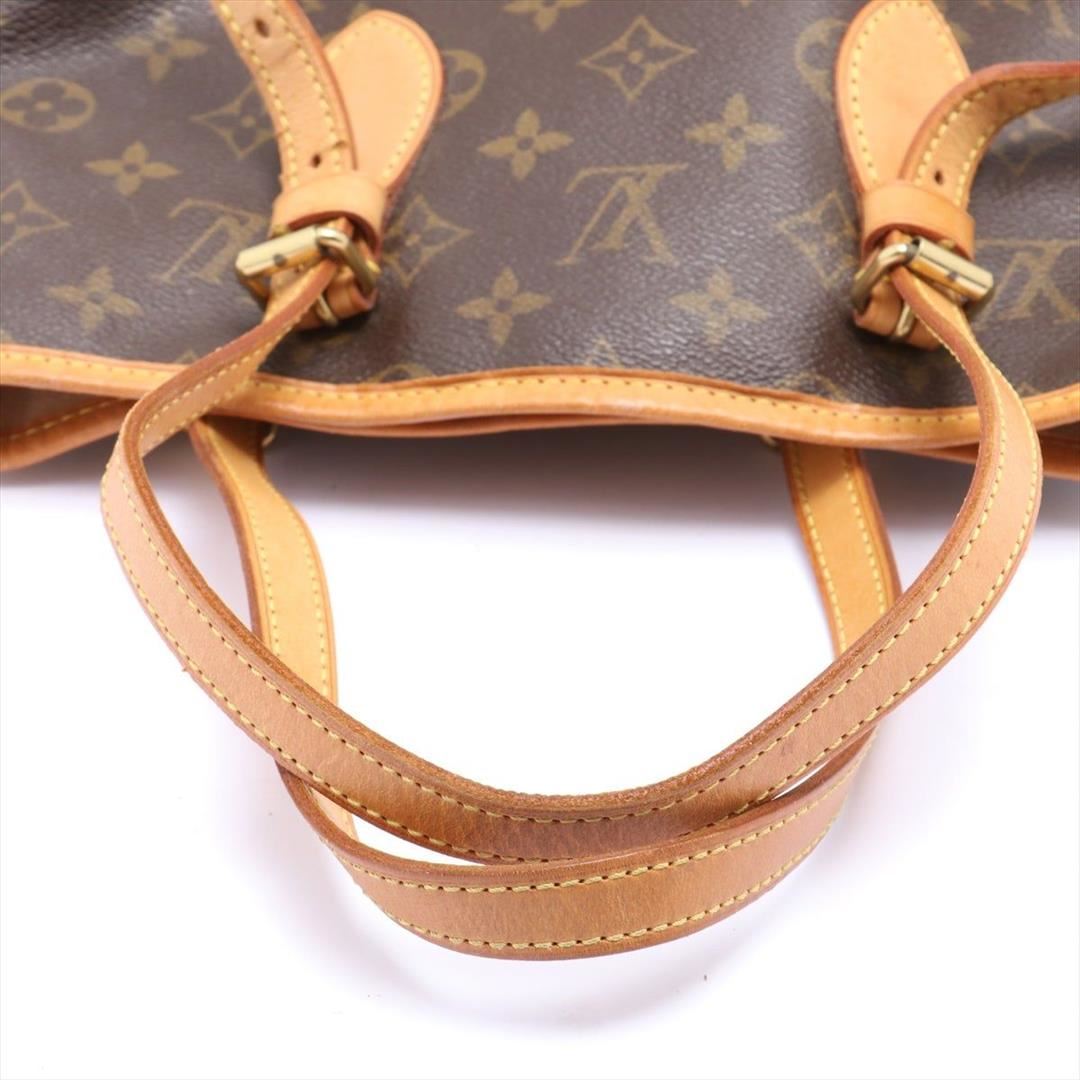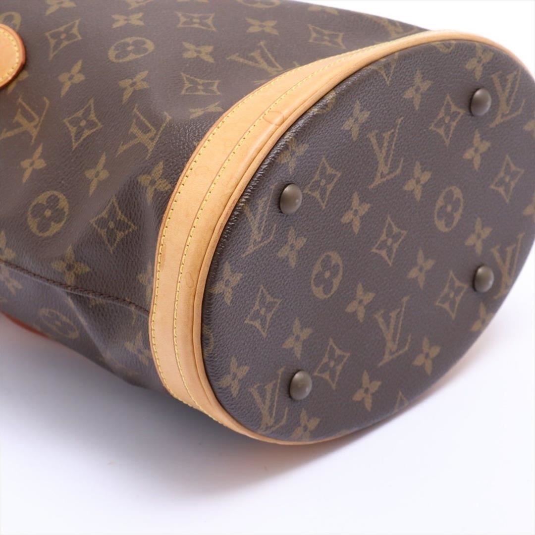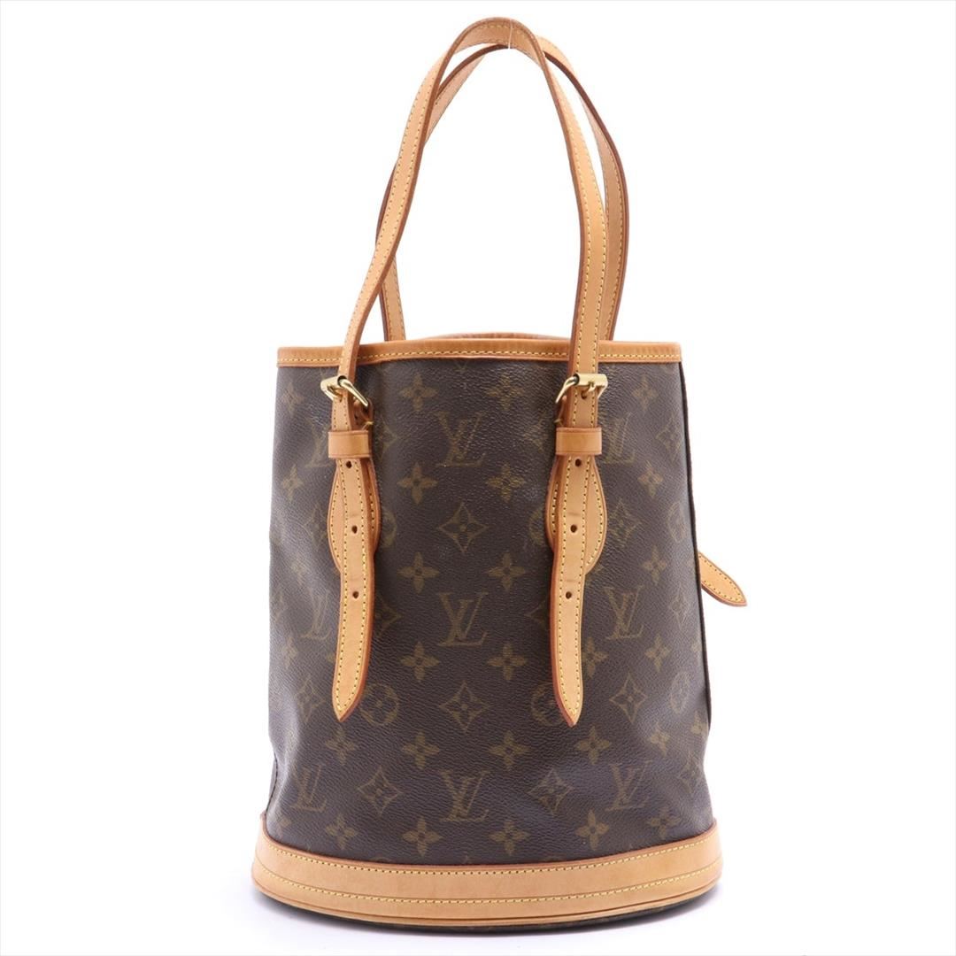 Brown and tan monogram coated canvas Louis Vuitton Petit Bucket bag with brass hardware, tan vachetta leather accents throughout, dual adjustable shoulder straps, beige coated lining, dual pockets at interior walls; one with zip closure and open top.
