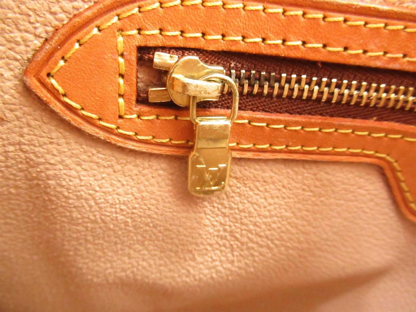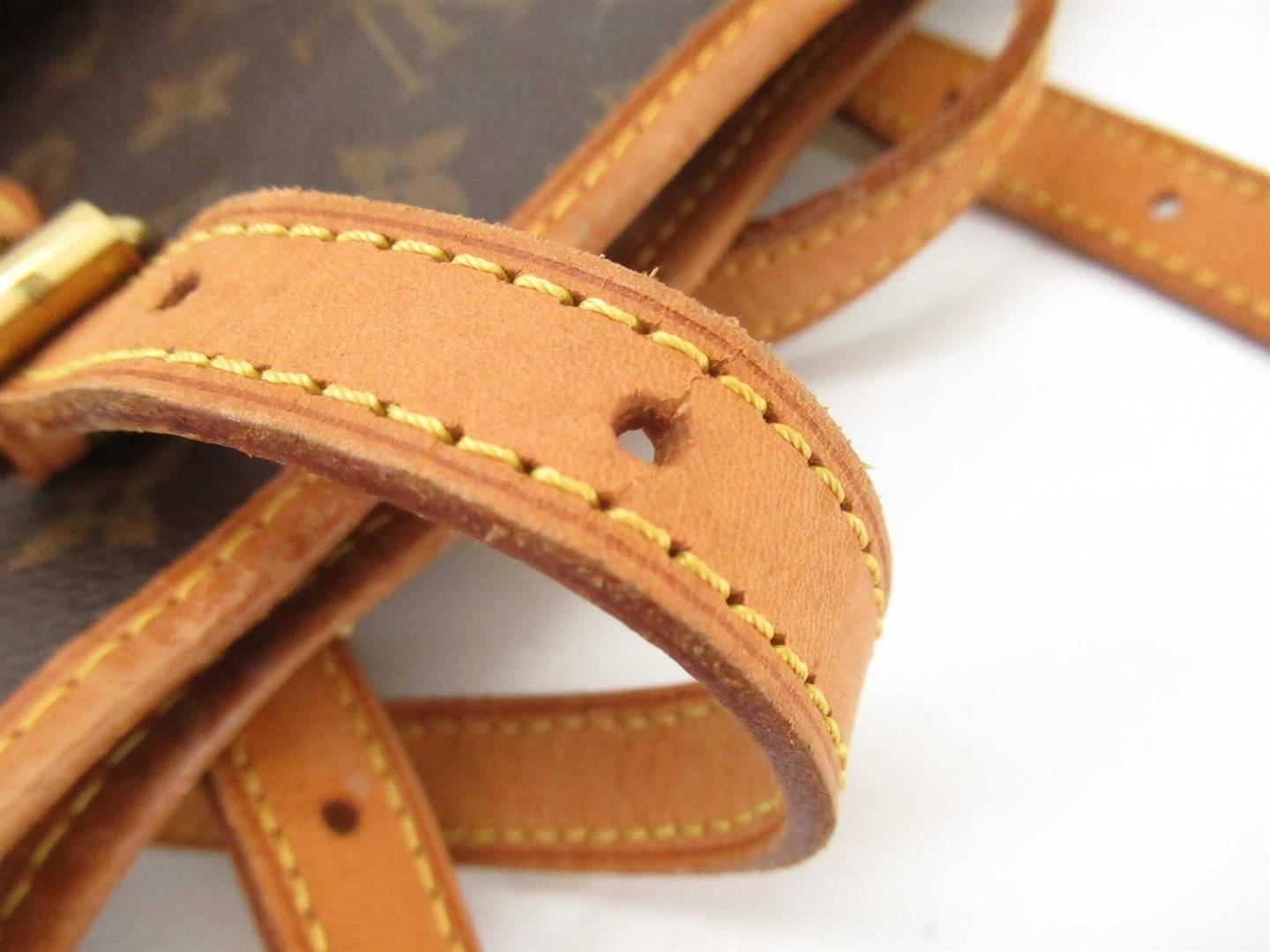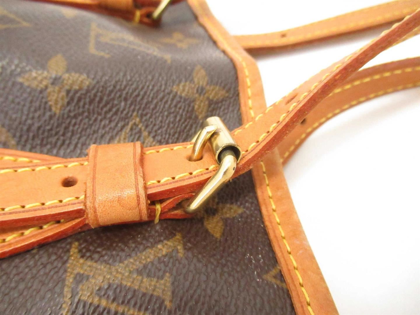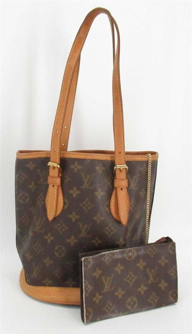 Brown and tan monogram coated canvas Louis Vuitton Petit Bucket bag with gold-tone hardware, tan vachetta leather accents throughout, dual adjustable shoulder straps, beige coated lining, dual pockets at interior walls, one with zip closure and open top.