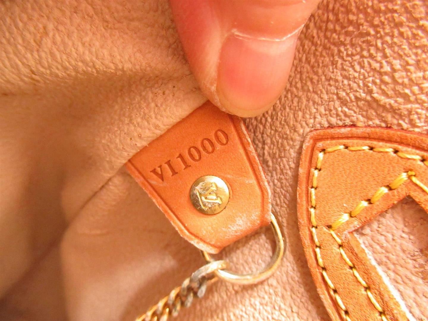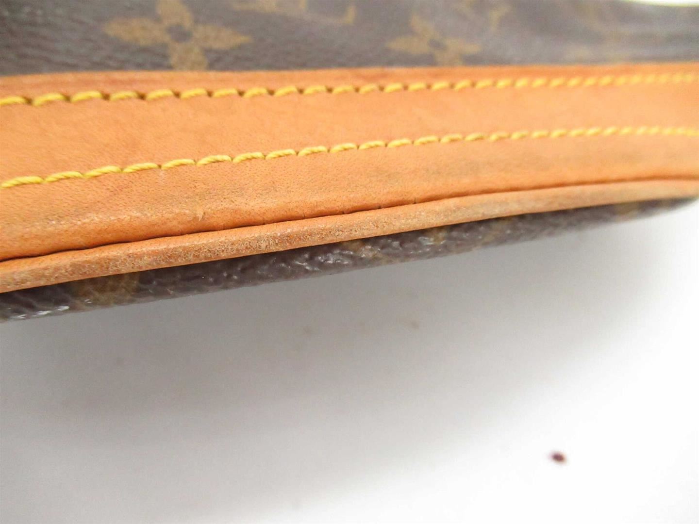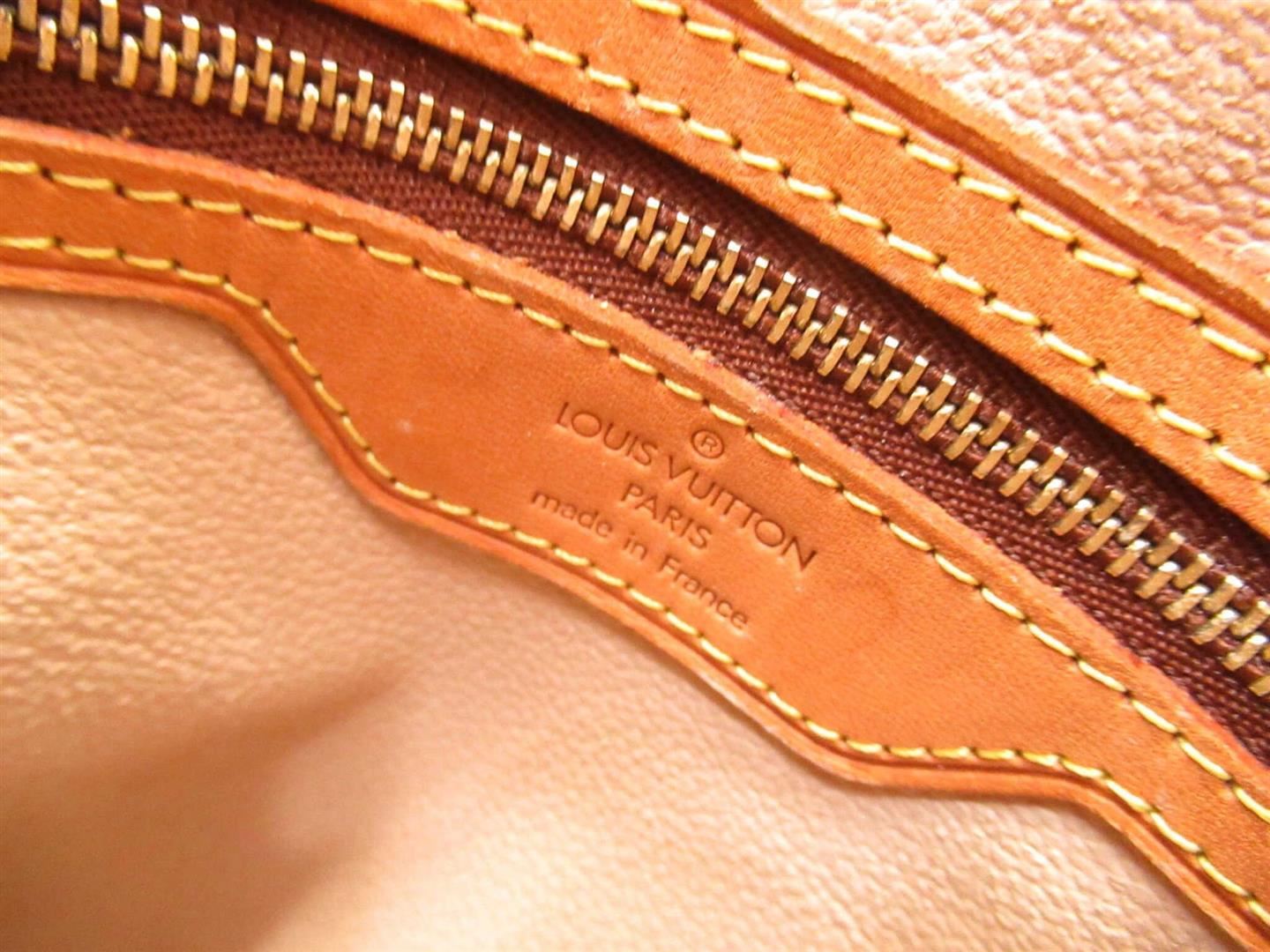 Brown and tan monogram coated canvas Louis Vuitton Petit Bucket bag with gold-tone hardware, tan vachetta leather accents throughout, dual adjustable shoulder straps, beige coated lining, dual pockets at interior walls, one with zip closure and open top.