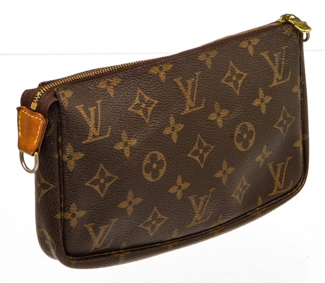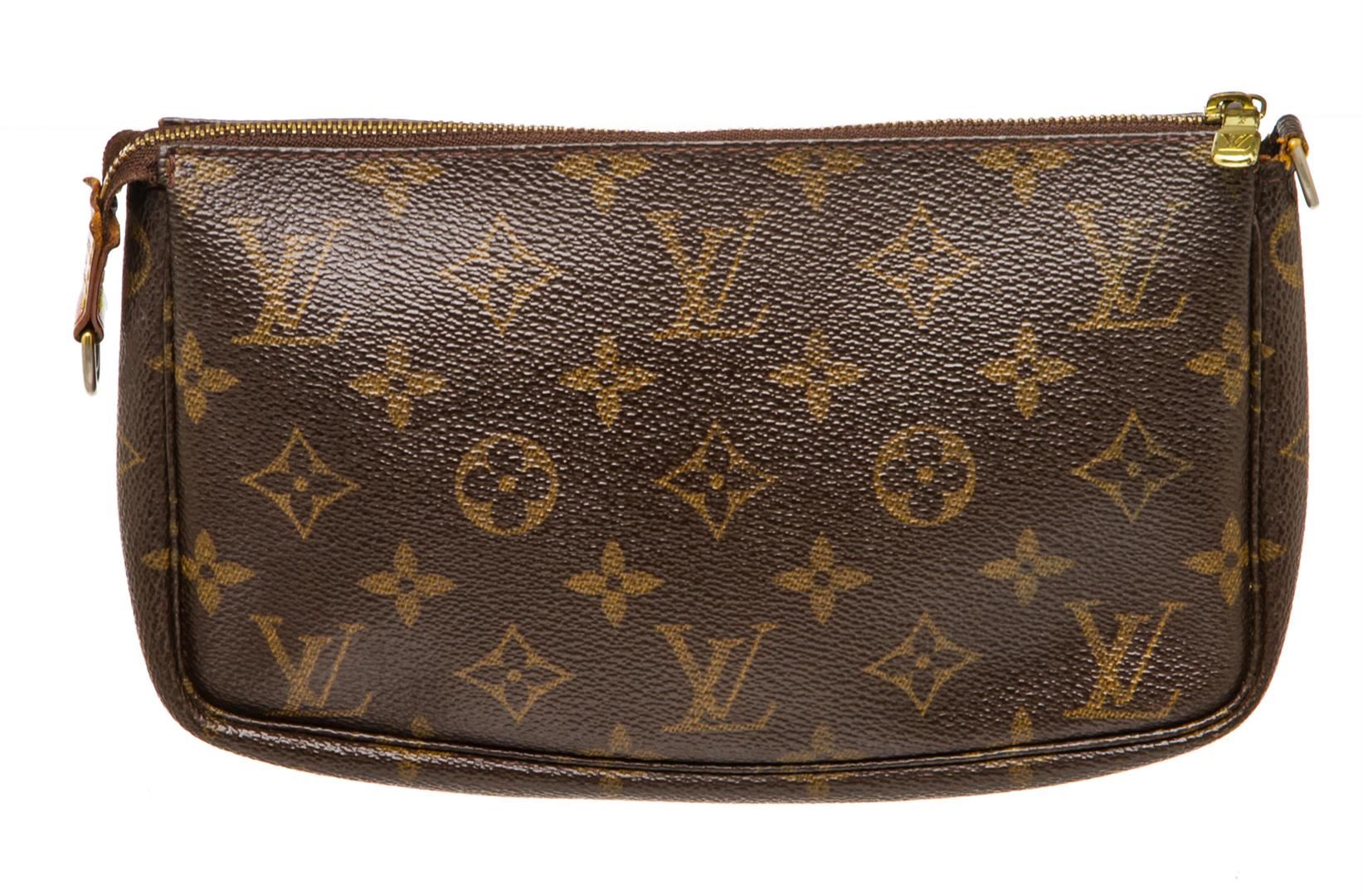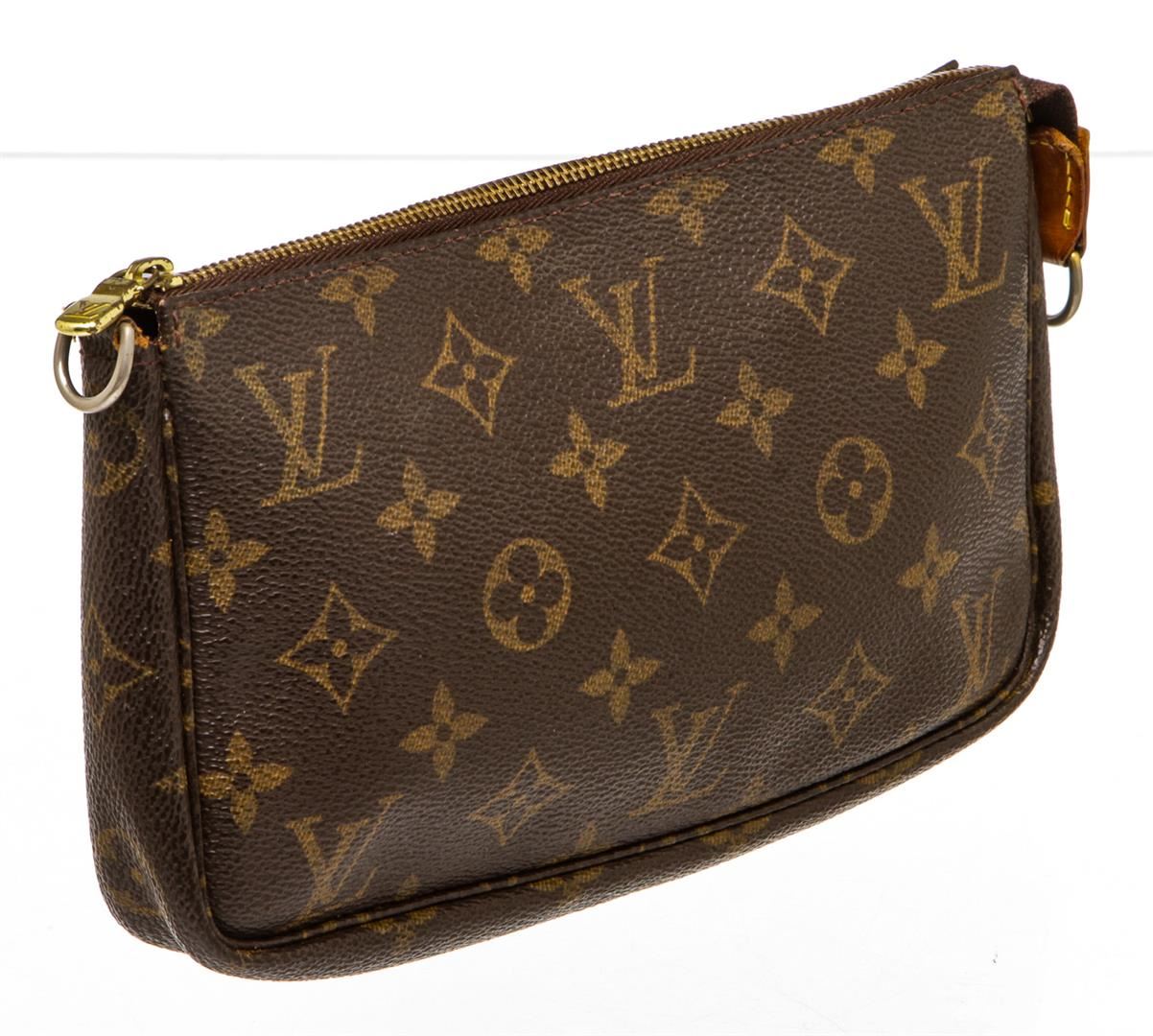 One Louis Vuitton Monogram Canvas Leather Pochette Bag. Brown and tan monogram coated canvas Louis Vuitton Pochette bag with brass hardware, tan vachetta leather trim, brown canvas lining and zip closure at top. Detachable strap NOT included.