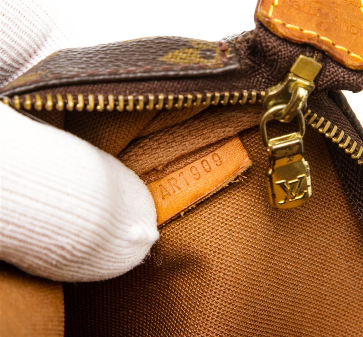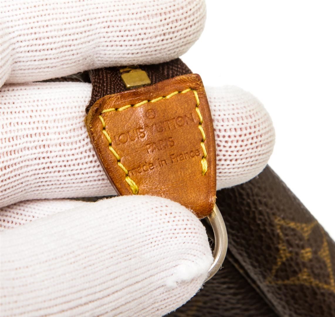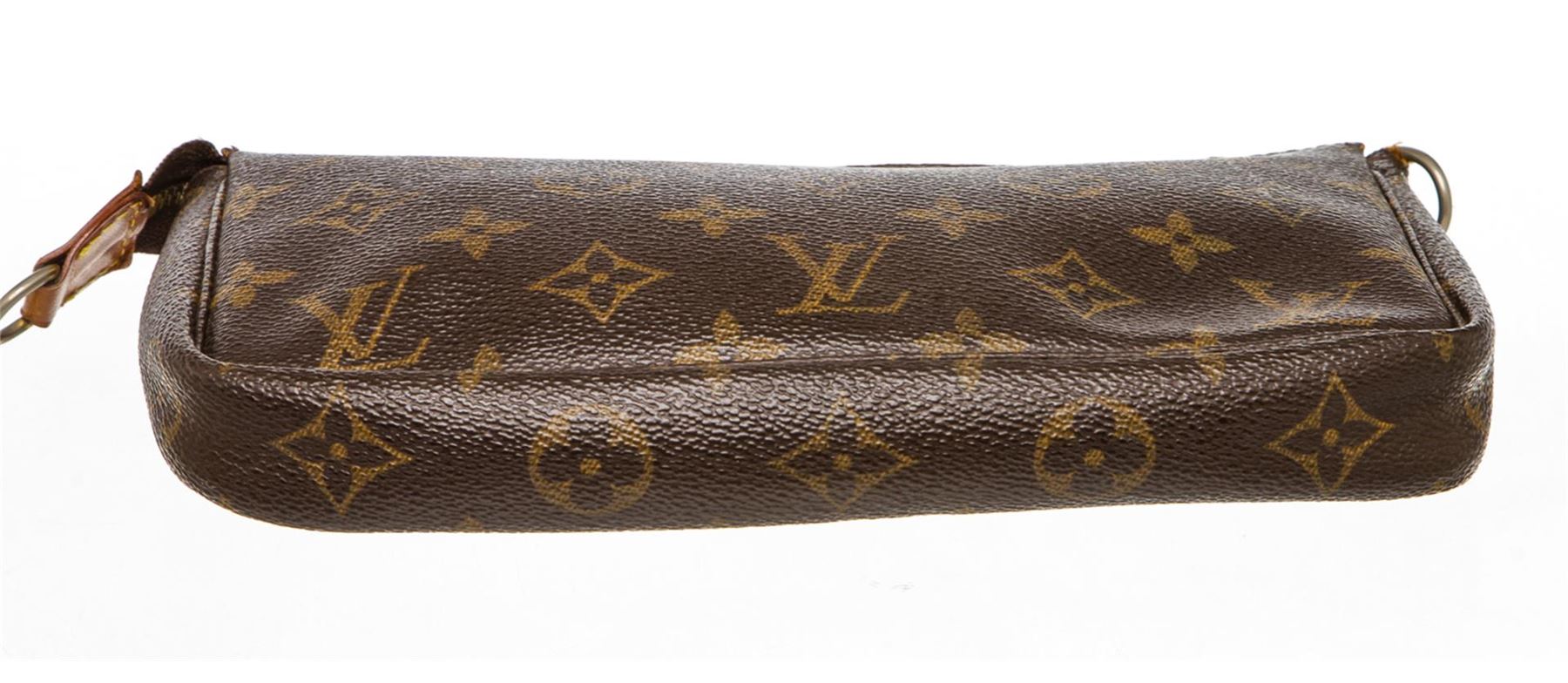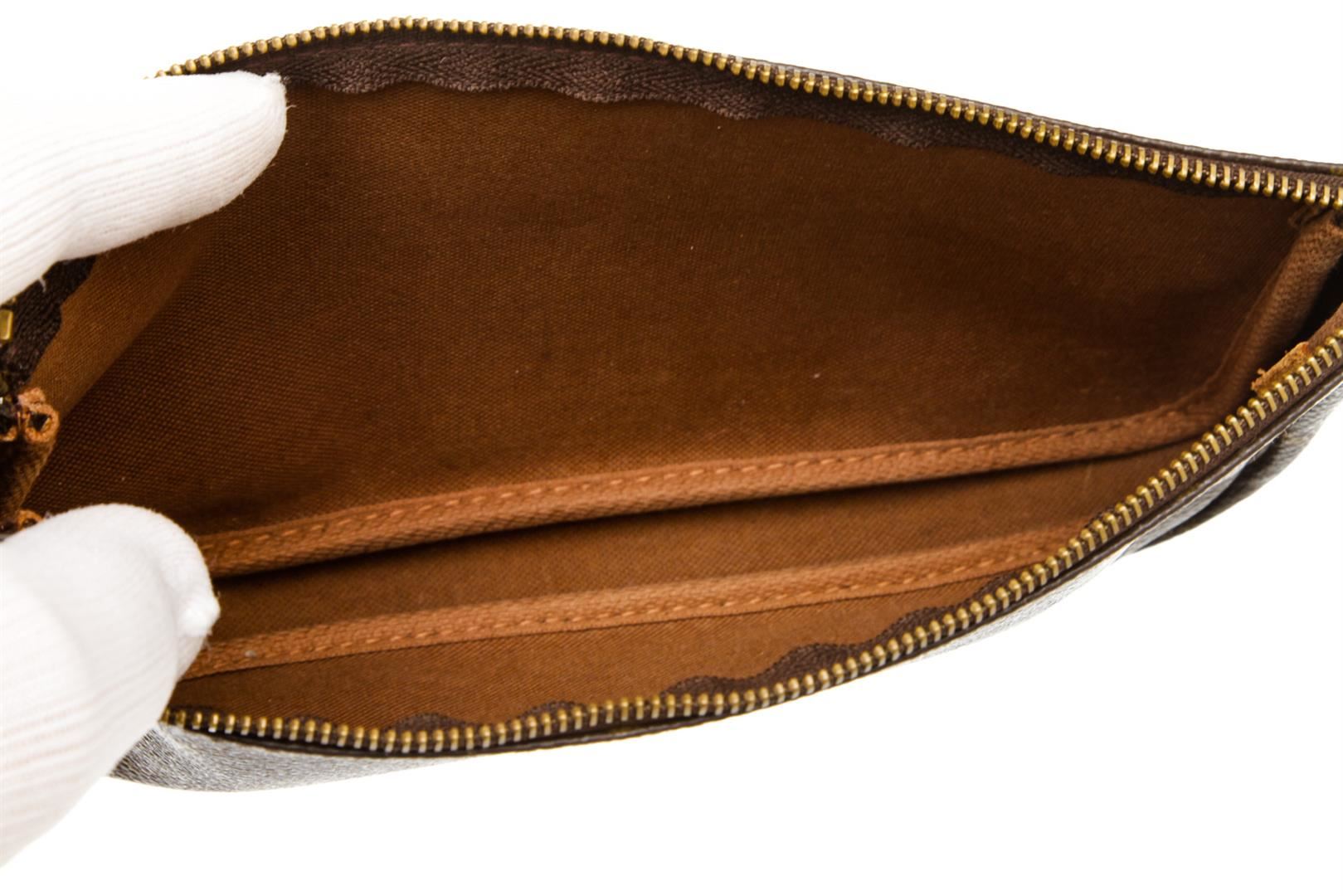One Louis Vuitton Monogram Canvas Leather Pochette Bag. Brown and tan monogram coated canvas Louis Vuitton Pochette bag with brass hardware, tan vachetta leather trim, brown canvas lining and zip closure at top. Detachable strap NOT included.