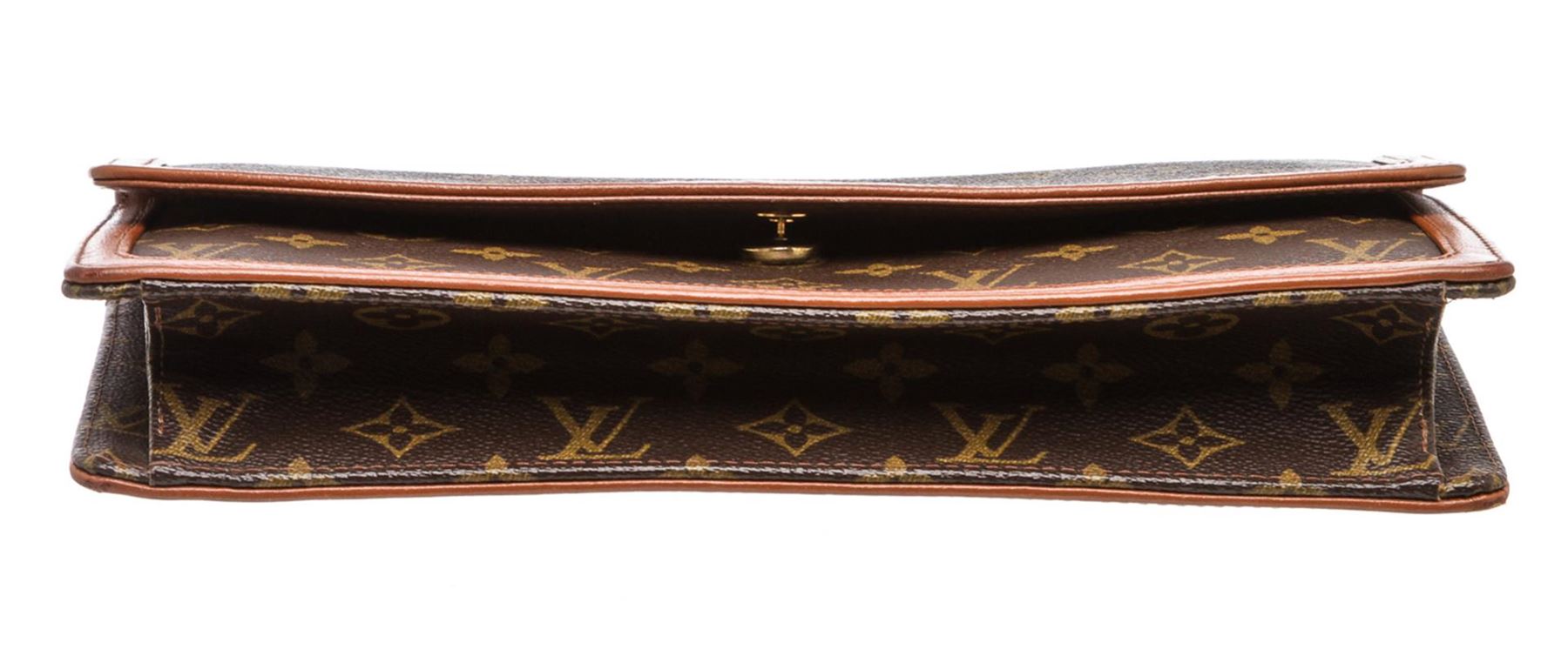 Louis Vuitton brown monogram coated canvas Pochette Dame clutch bag with brown leather trim, brown leather lining, interior zipper and slip pockets. Please note: Snap does not work. Authentic.