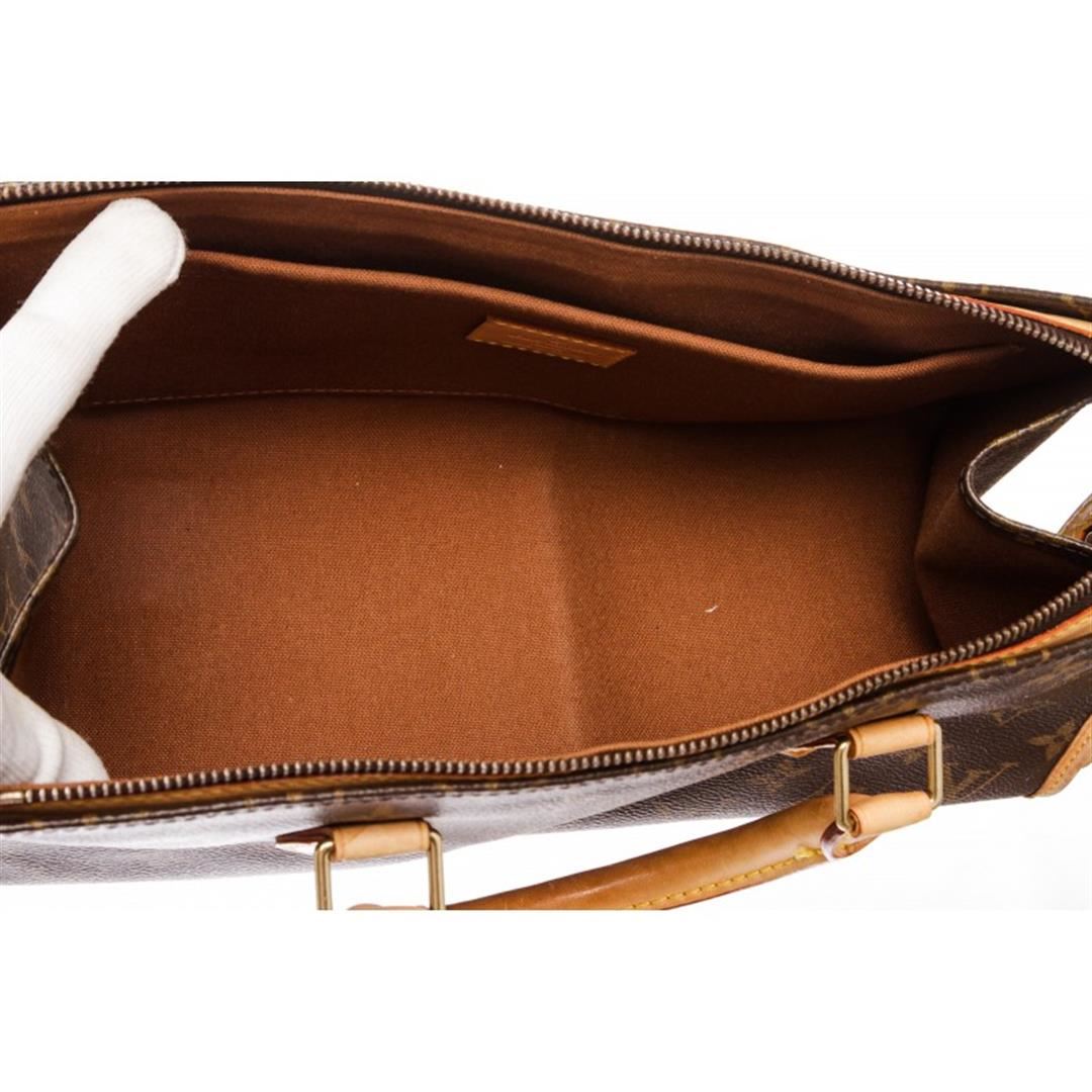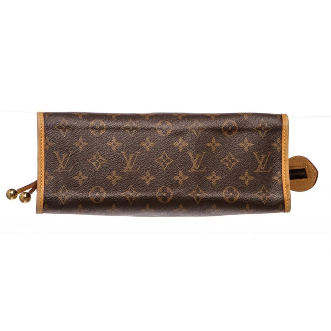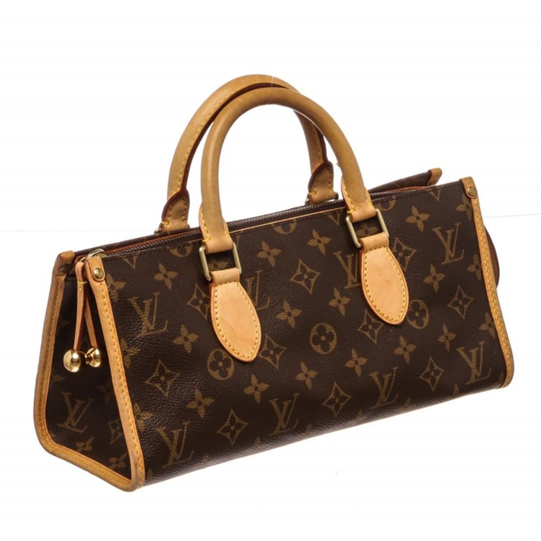 Brown and tan monogram coated canvas Louis Vuitton Popincourt bag with brass hardware, tan vachetta leather trim, dual rolled top handles, brown canvas lining, single slit pocket at interior wall and zip closure at top. Item is Pre-Owned.
