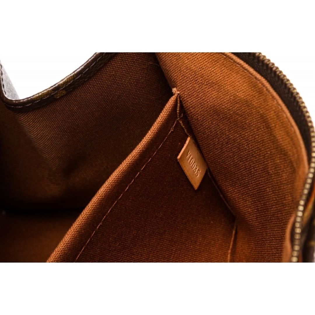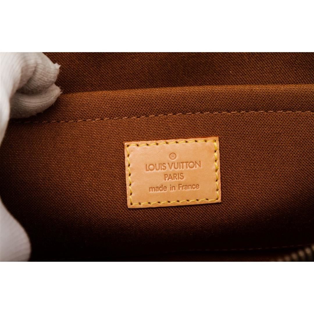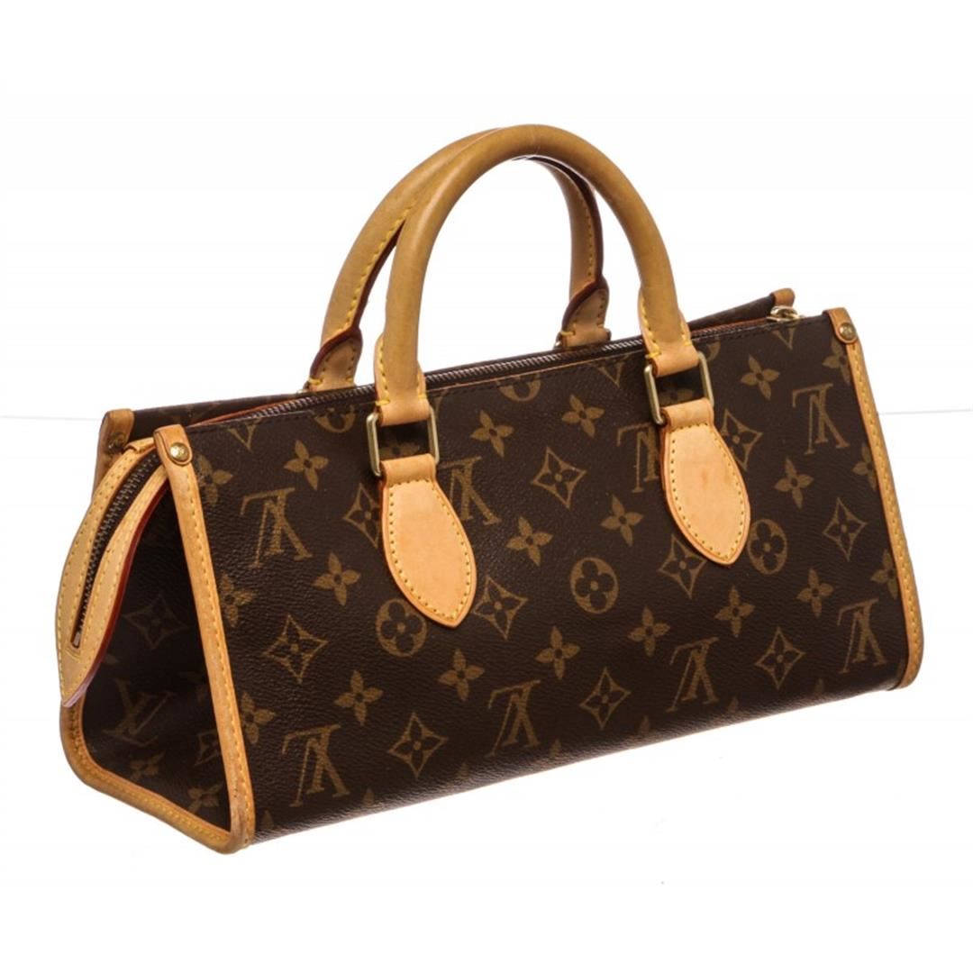 Brown and tan monogram coated canvas Louis Vuitton Popincourt bag with brass hardware, tan vachetta leather trim, dual rolled top handles, brown canvas lining, single slit pocket at interior wall and zip closure at top. Item is Pre-Owned.