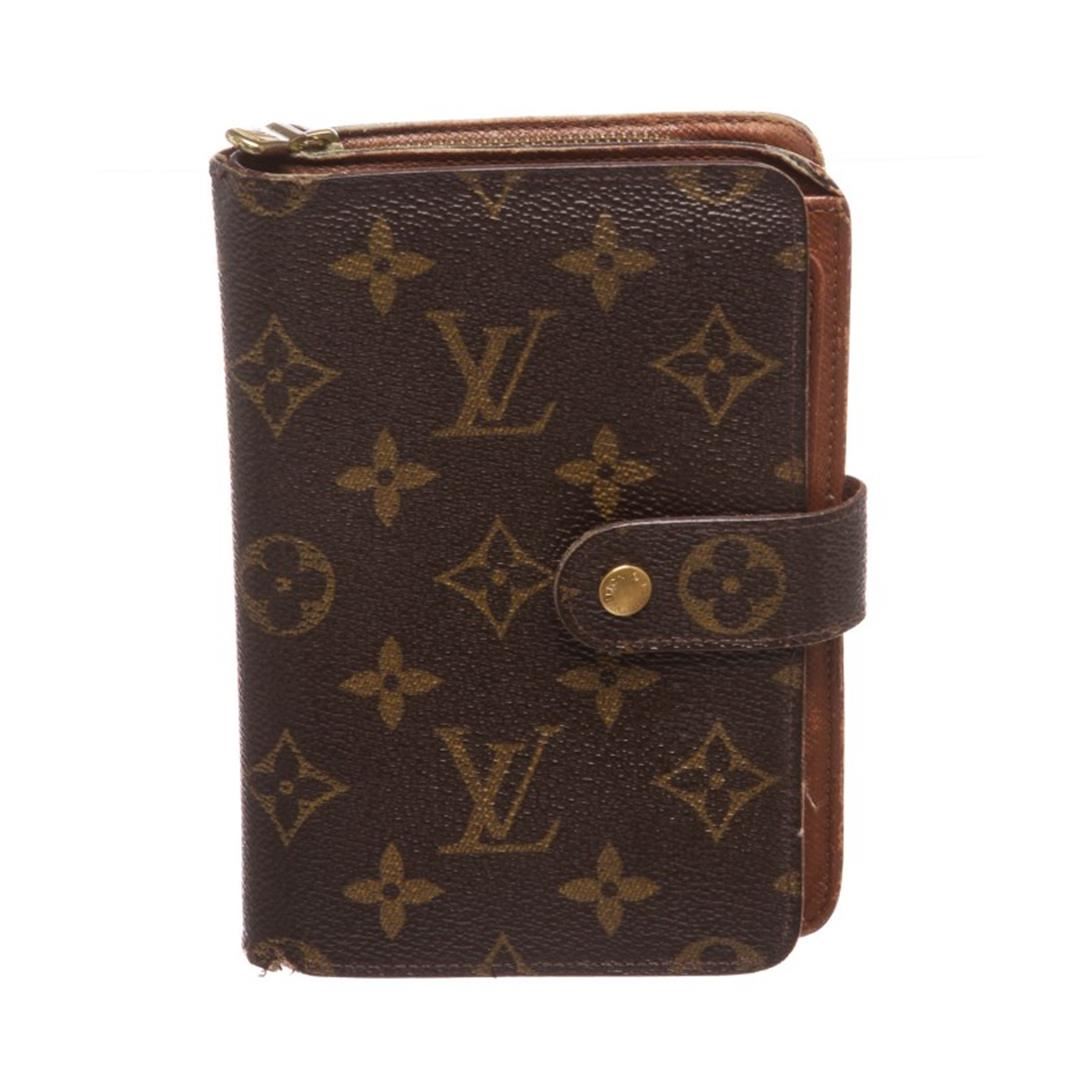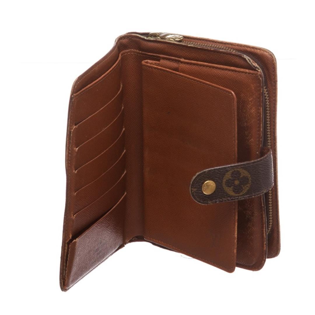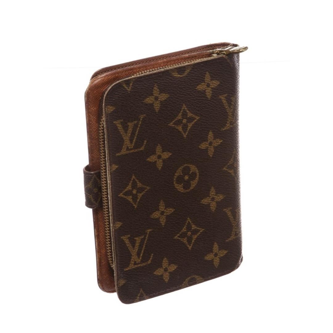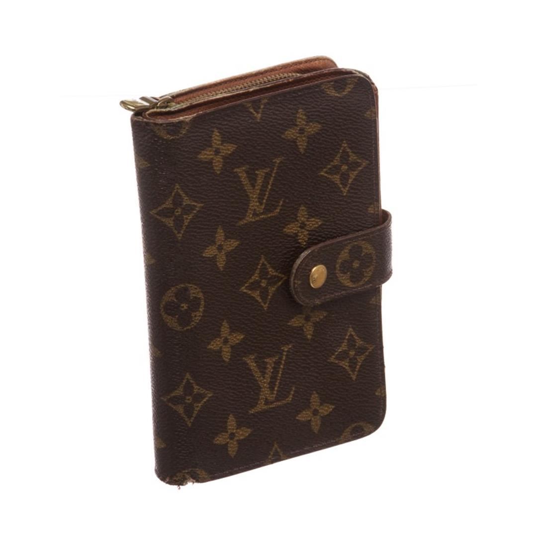 Brown and tan monogram coated canvas Louis Vuitton Porte-Papier Zippé wallet with brass hardware, zip compartment at back, leather lining, single cash slot, seven card slots, removable passport holder at interior and snap closure at side. Item is pre-owned.