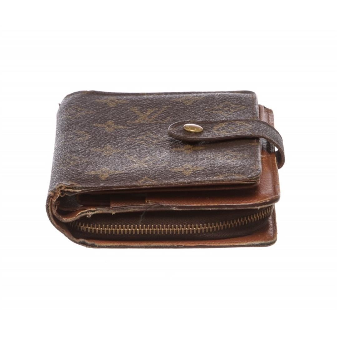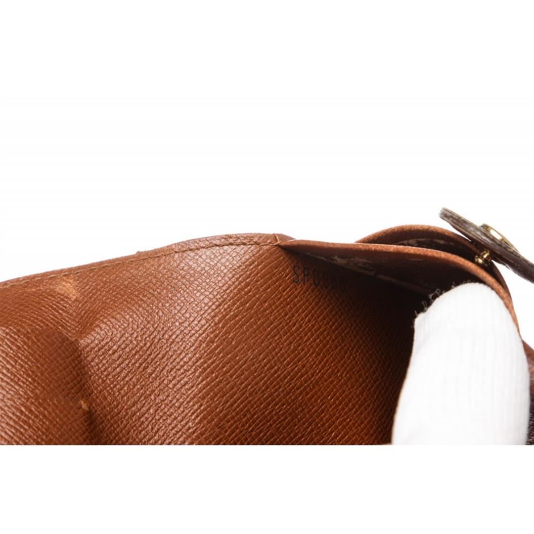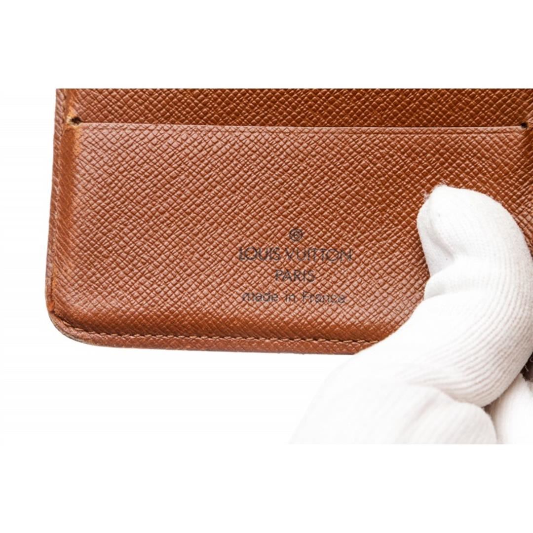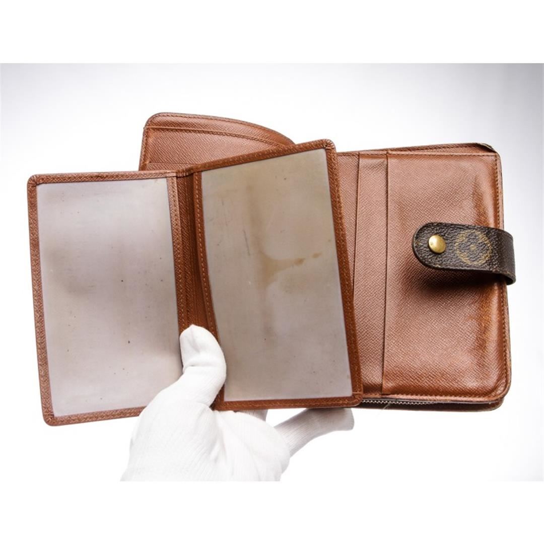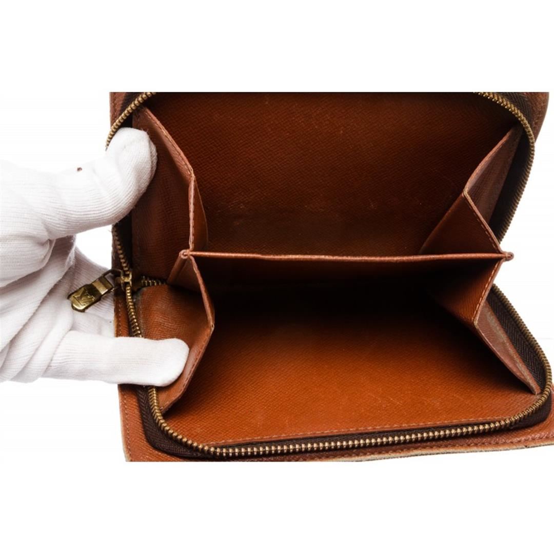Brown and tan monogram coated canvas Louis Vuitton Porte-Papier Zippé wallet with brass hardware, zip compartment at back, leather lining, single cash slot, seven card slots, removable passport holder at interior and snap closure at side. Item is pre-owned.