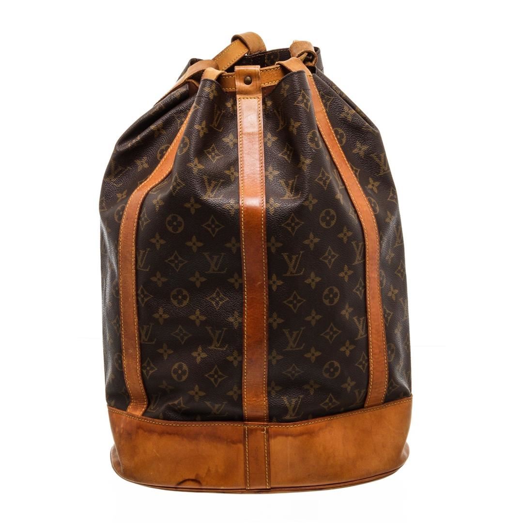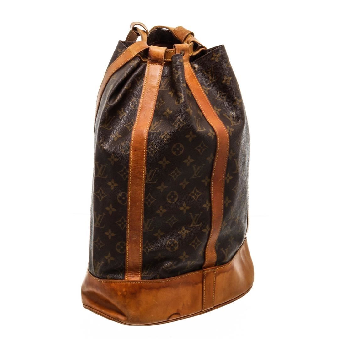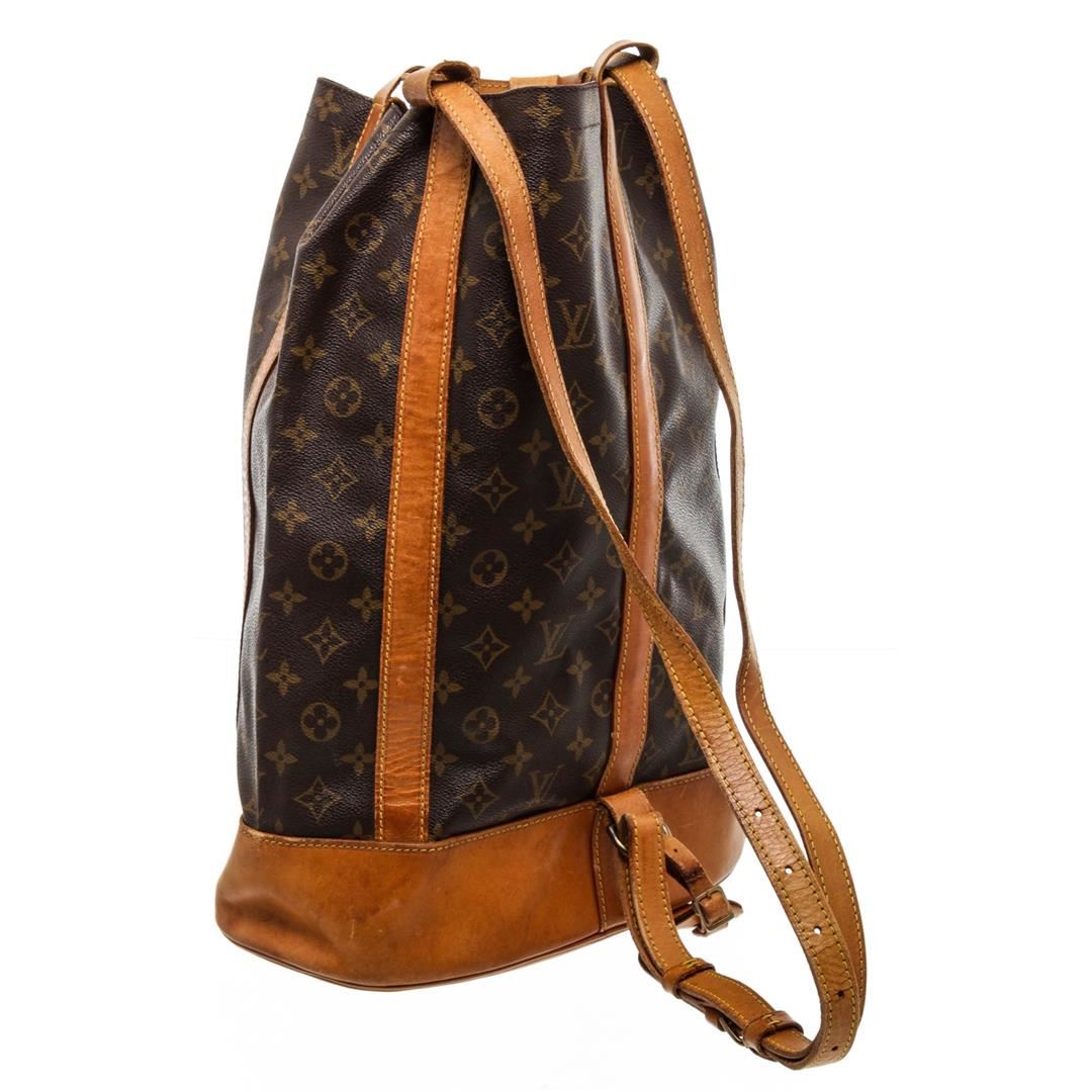 Brown and tan monogram coated canvas Louis Vuitton Randonnee backpack with brass hardware, tan vachetta leather trim featuring yellow contrast stitching, dual flat shoulder straps, brown woven interior lining and open top.