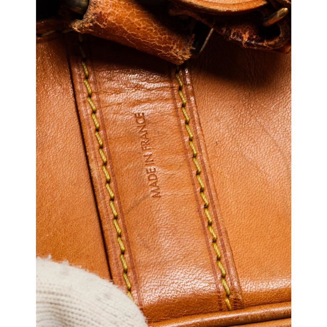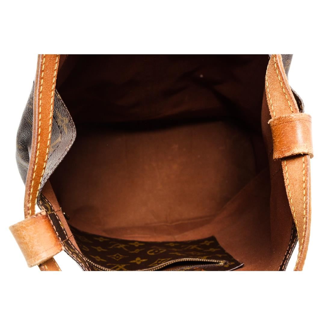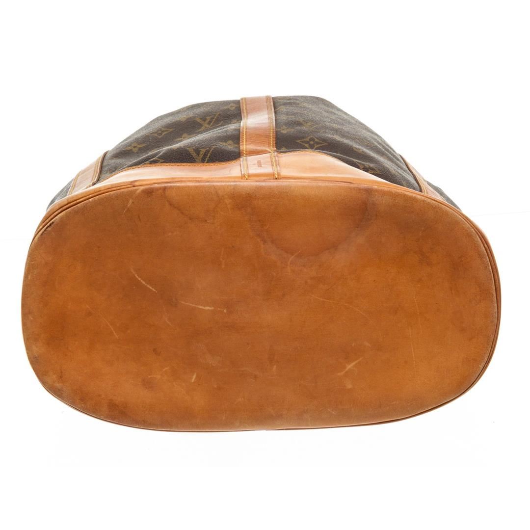 Brown and tan monogram coated canvas Louis Vuitton Randonnee backpack with brass hardware, tan vachetta leather trim featuring yellow contrast stitching, dual flat shoulder straps, brown woven interior lining and open top.