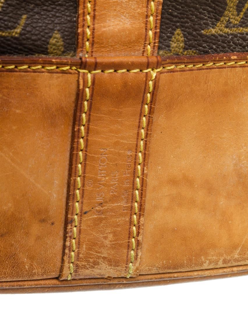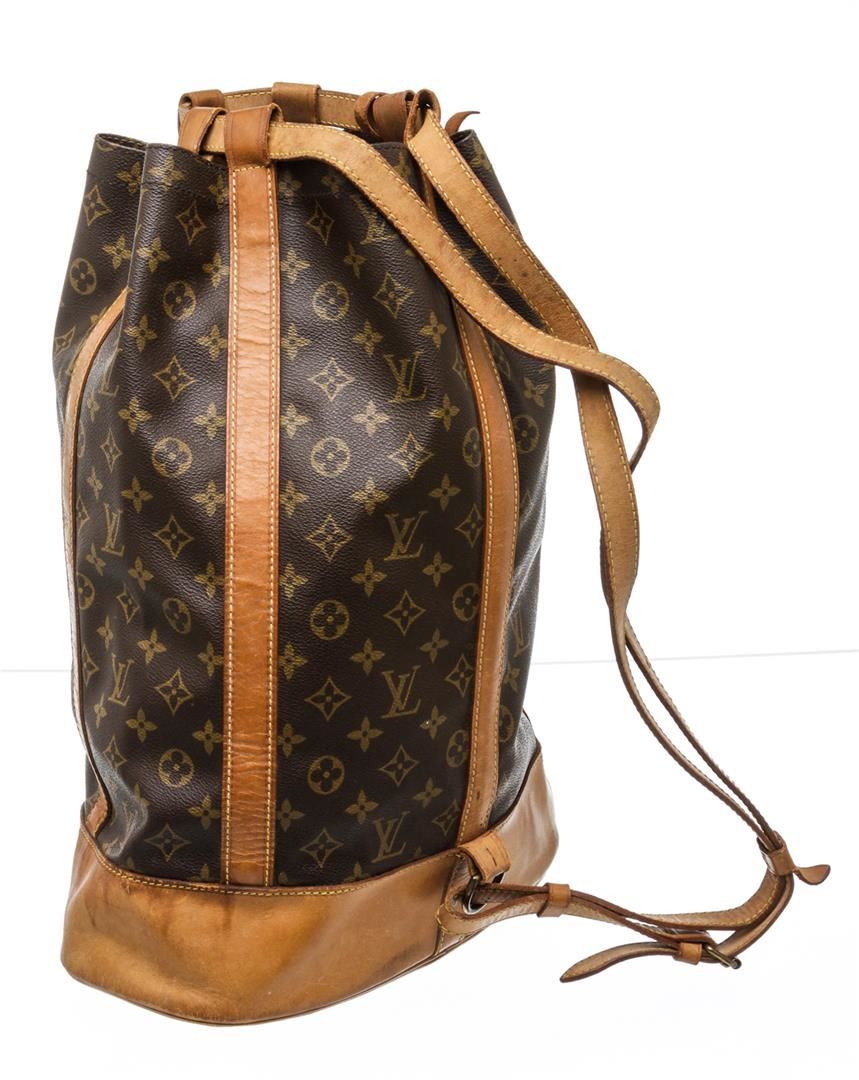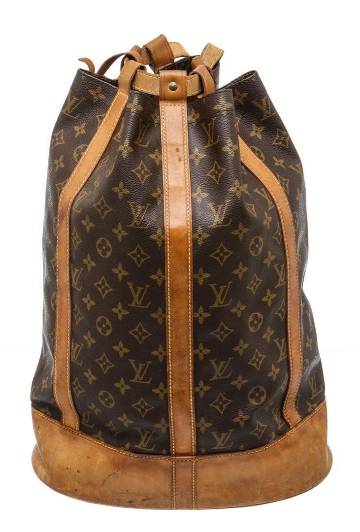 One Louis Vuitton Monogram Canvas Leather Randonne Backpack Bag. Brown and tan monogram coated canvas Louis Vuitton Randonnee backpack with brass hardware, tan vachetta leather trim featuring yellow contrast stitching, dual flat shoulder straps, brown woven interior lining and open top.