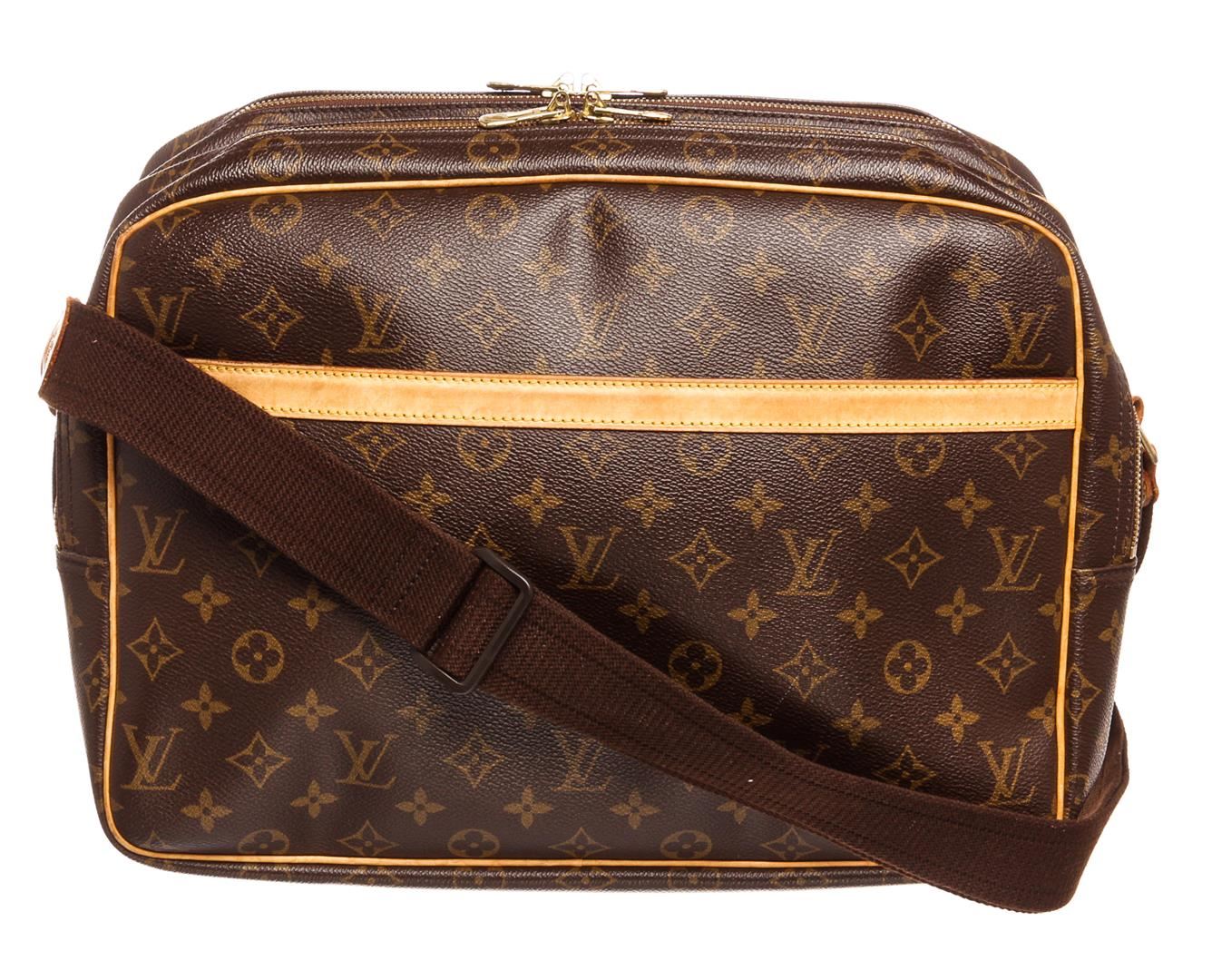 Brown and tan Monogram coated canvas Louis Vuitton Reporter GM with brass hardware, tan vachetta leather trim, adjustable flat shoulder strap, single exterior pocket, beige coated canvas interior, dual interior compartments, dual pockets at interior wall and dual zip closures at top.