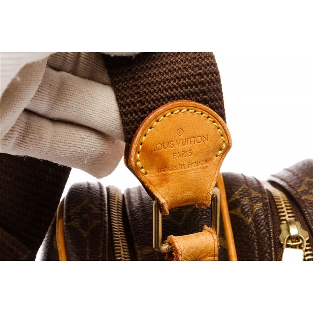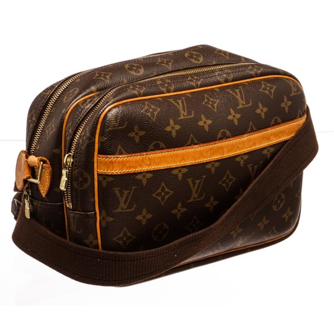 Brown and tan monogram coated canvas Louis Vuitton Reporter PM with brass hardware, tan vachetta leather accents, adjustable flat shoulder strap, single exterior pocket, beige coated canvas interior, dual interior compartments, single pocket at interior w