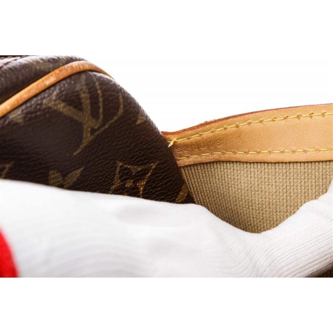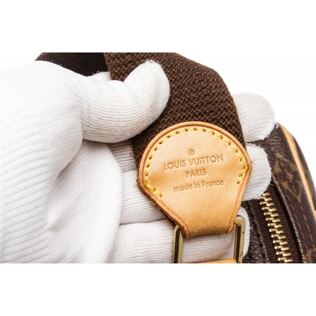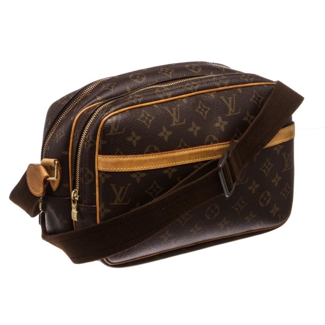 Brown and tan monogram coated canvas Louis Vuitton Reporter PM with brass hardware, tan vachetta leather accents, adjustable flat shoulder strap, single exterior pocket, beige coated canvas interior, dual interior compartments, single pocket at interior wall and dual zip closures at top. Item is Pre-Owned.