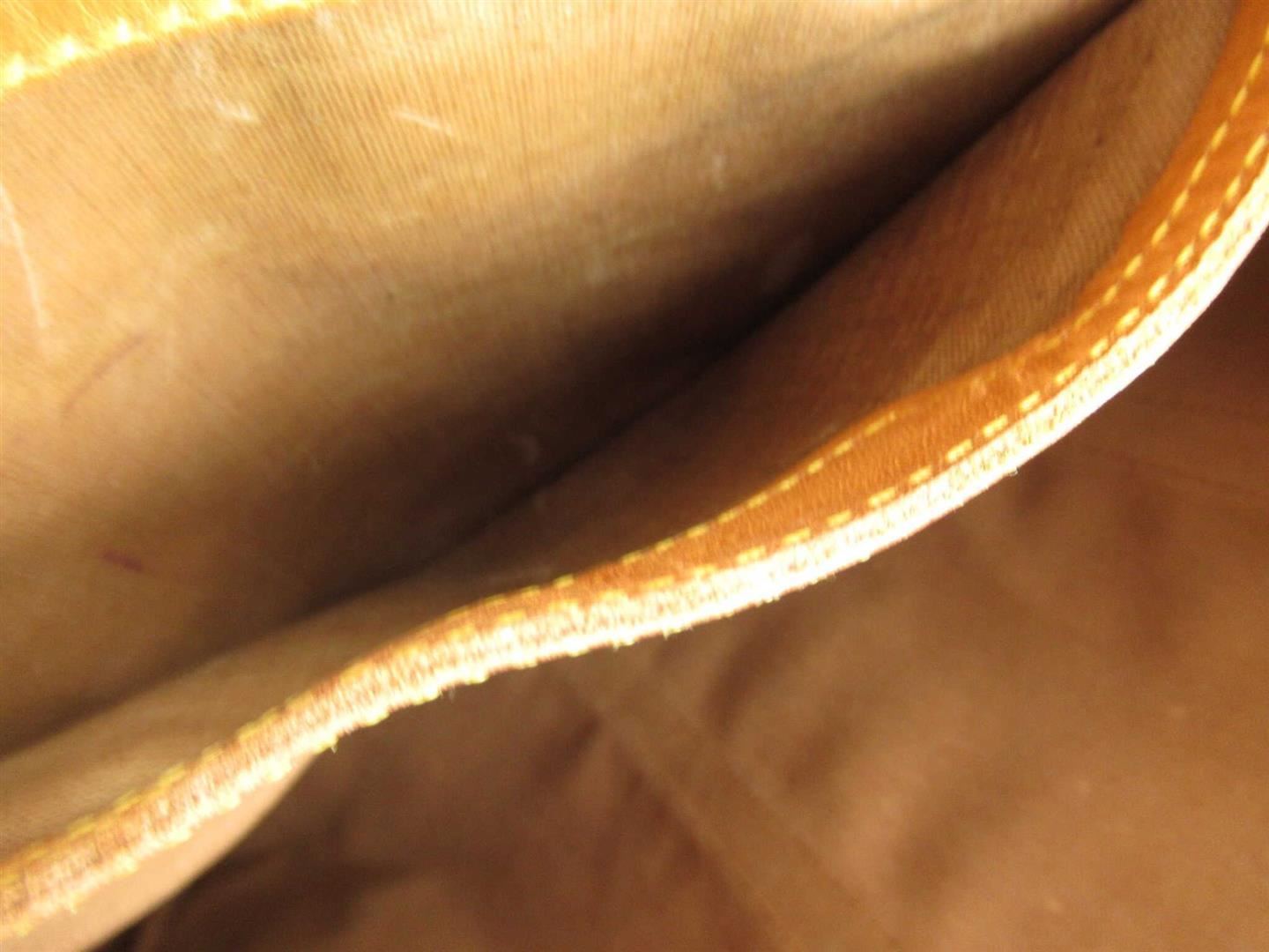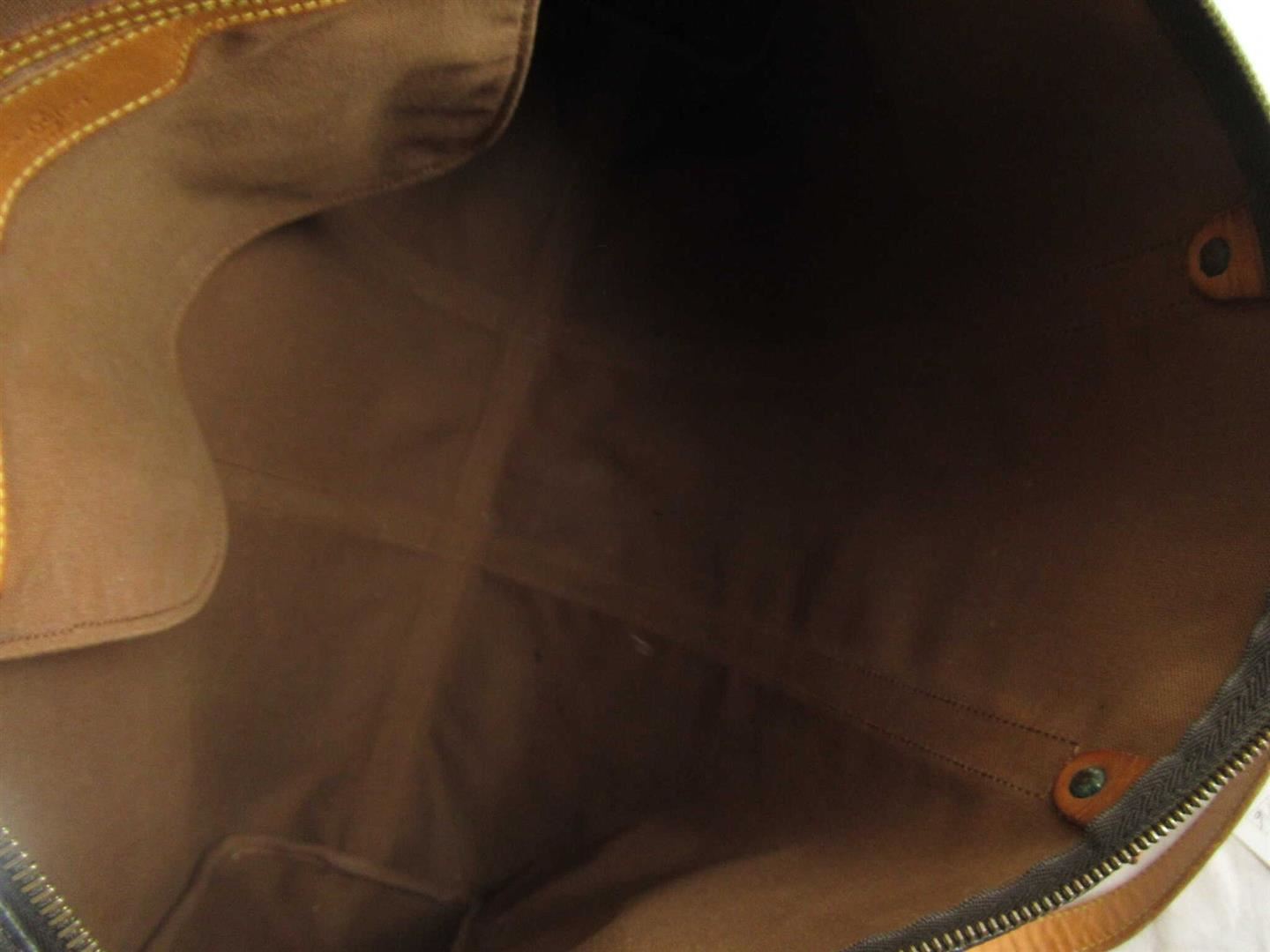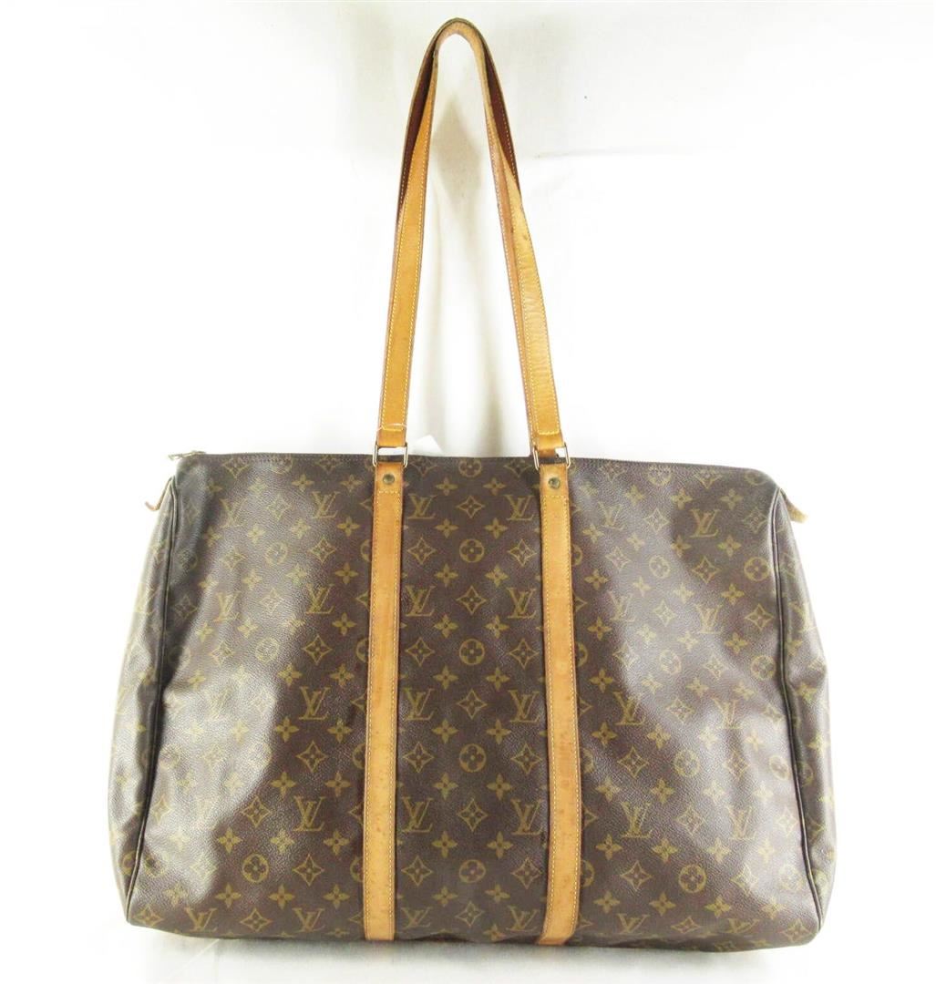 Brown and tan monogram Louis Vuitton Monogram Sac Flanerie 50 with brass hardware, tan vachetta leather trim, dual flat shoulder straps, brown canvas lining featuring single slit pocket and zip closure at top.