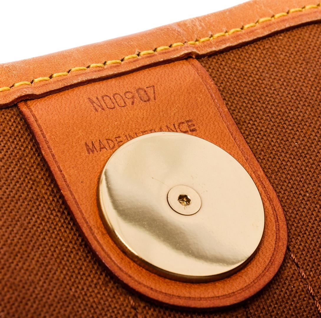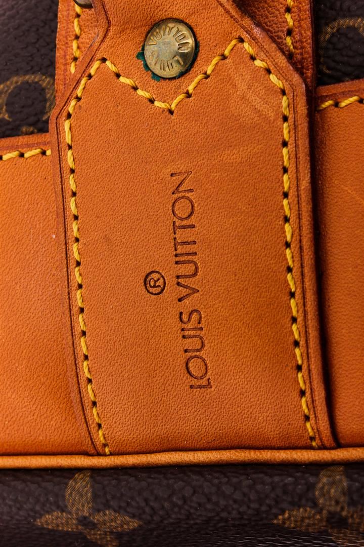 One Louis Vuitton Monogram Canvas Leather Sac Marin Bandouliere Bag. Brown and tan monogram coated canvas Louis Vuitton Sac Marin Bandoulière with brass hardware, tan vachetta leather trim, adjustable canvas shoulder strap, flat handle at side, brown canvas lining and lobster claw closure at side.