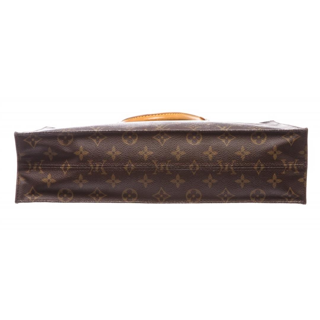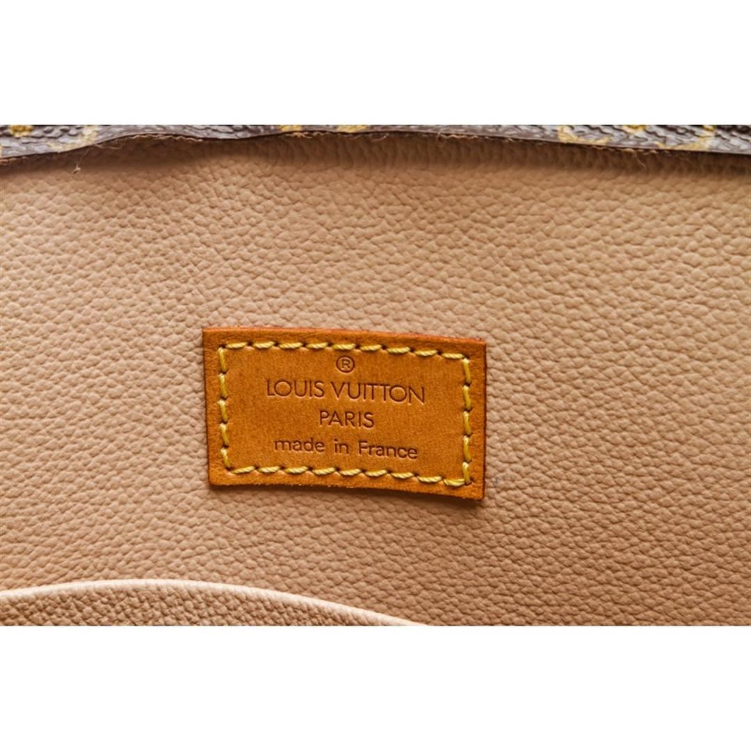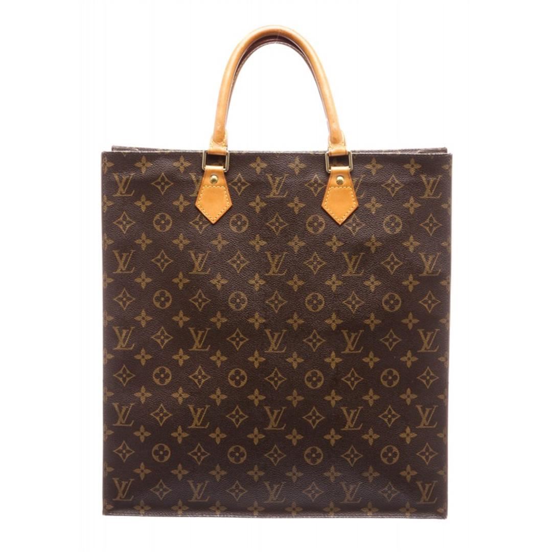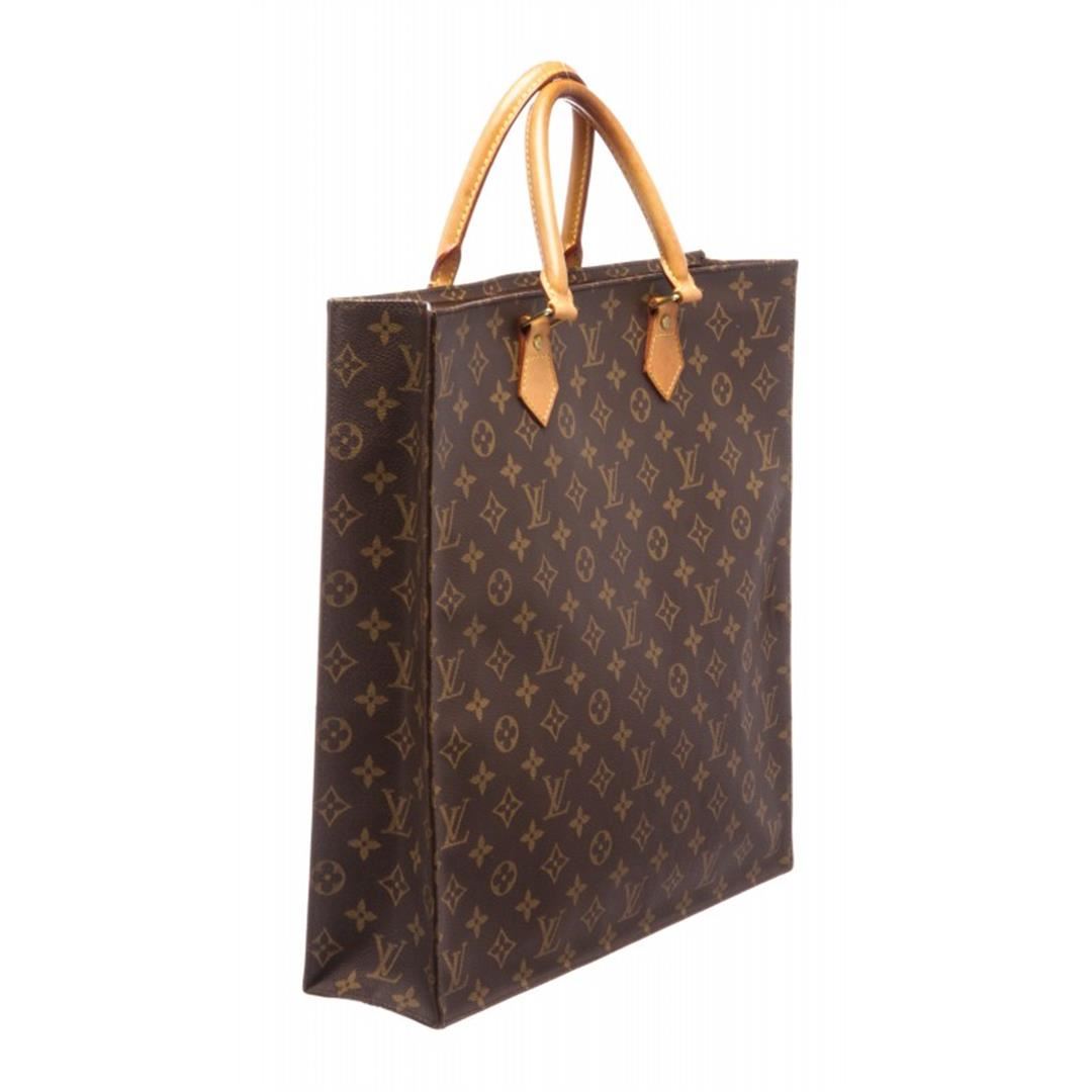 One Louis Vuitton Monogram Canvas Leather Sac Plat Tote Bag. Brown and tan monogram coated canvas Louis Vuitton Sac Plat with brass hardware, dual tan rolled vachetta leather handles, beige coated lining, singleit pocket at interior wall and open top.