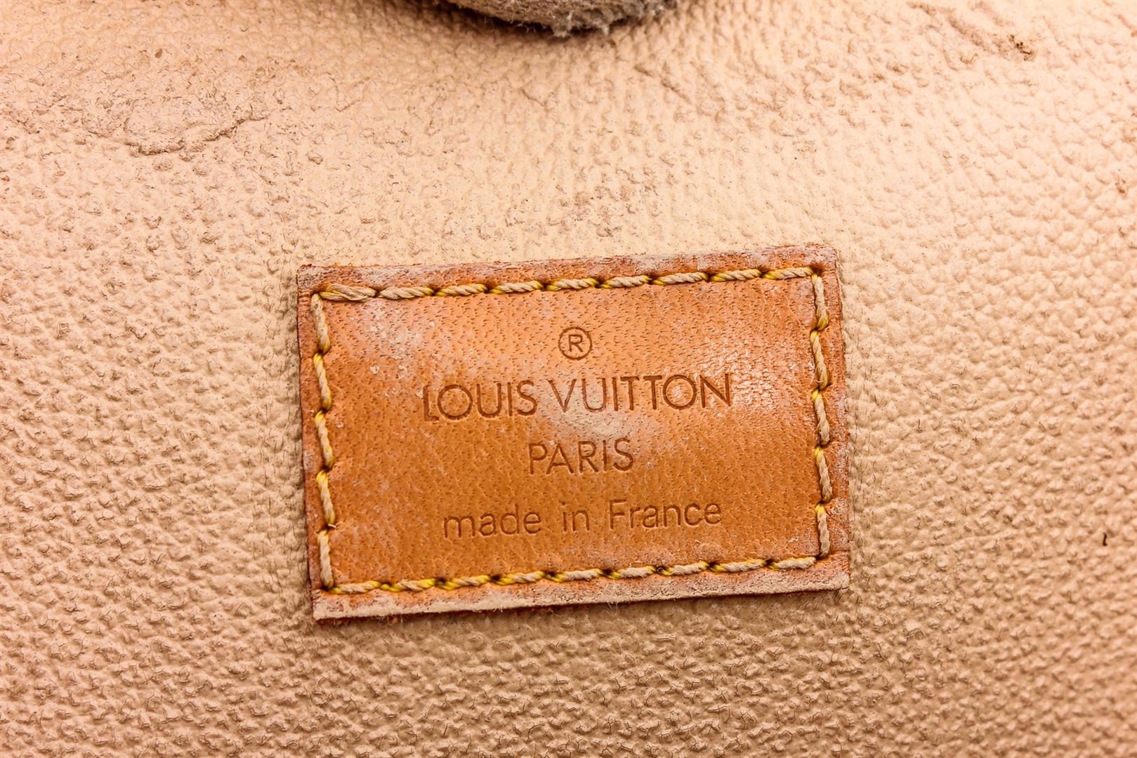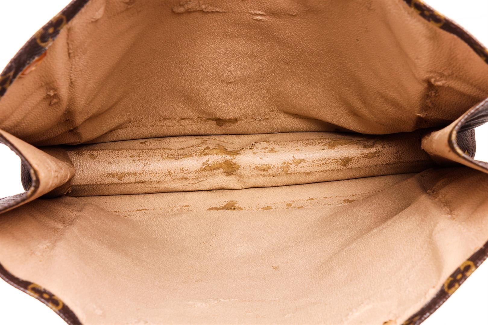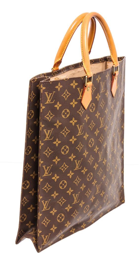 Brown and tan monogram coated canvas Louis Vuitton Sac Plat with brass hardware, dual tan rolled vachetta leather handles, beige coated lining, single slit pocket at interior wall and open top.