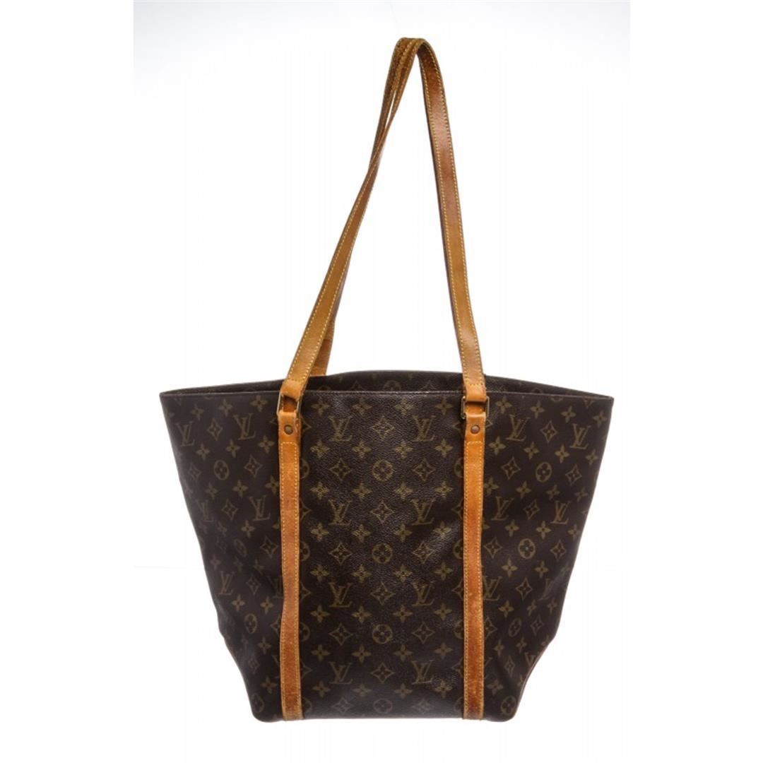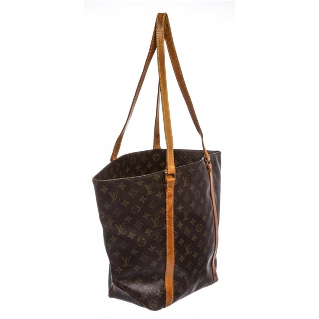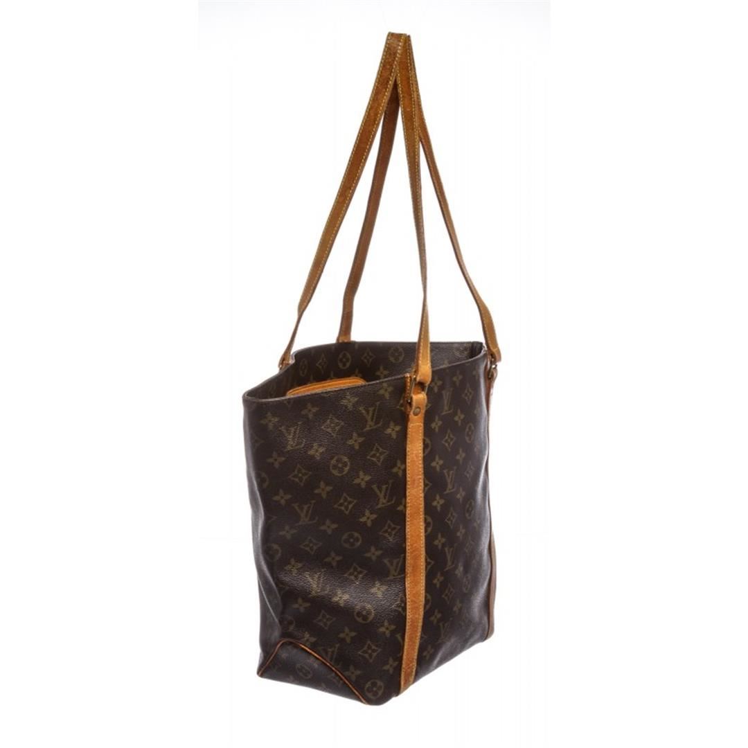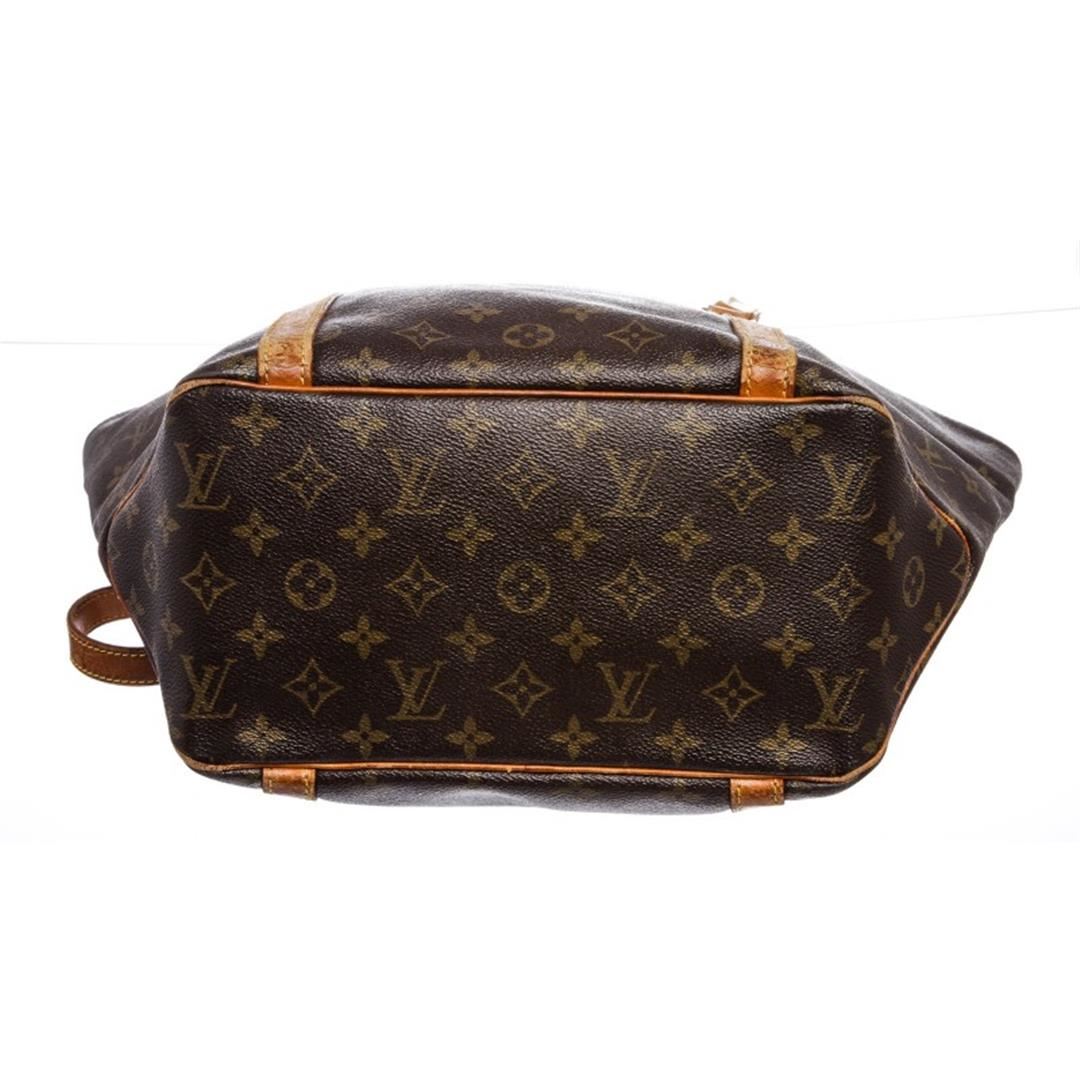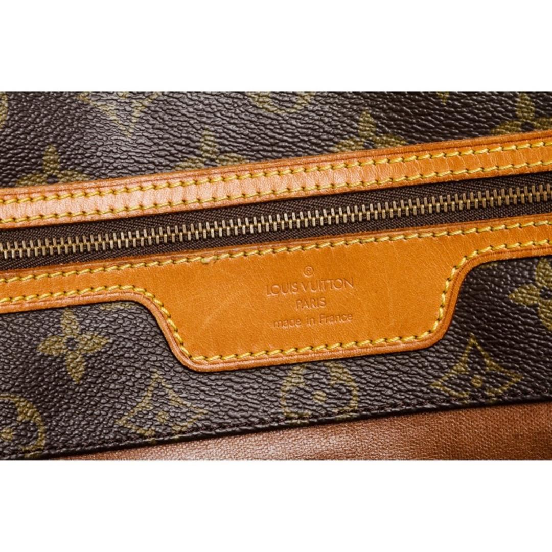 Brown and tan monogram coated canvas Louis Vuitton shopping tote with brass hardware, tan vachetta leather accents, dual flat shoulder straps, brown coated canvas lining and single zip pocket at interior wall.