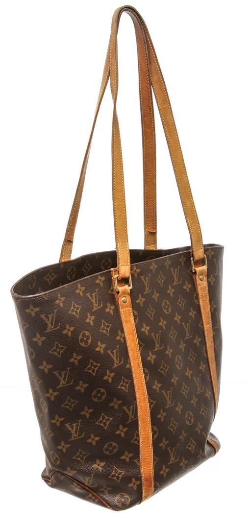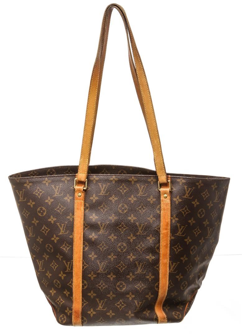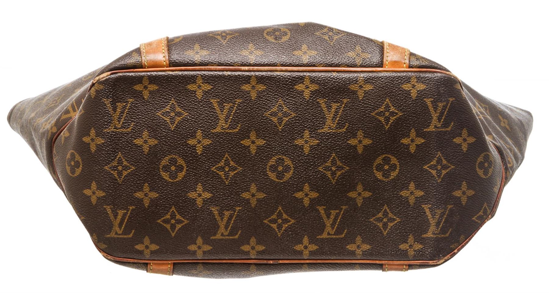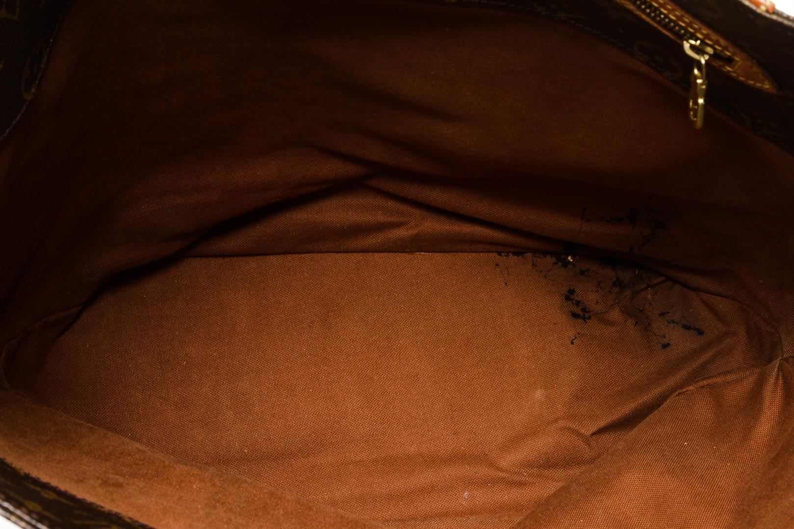 Brown and tan monogram coated canvas Louis Vuitton shopping tote with brass hardware, tan vachetta leather accents, dual flat shoulder straps, brown coated canvas lining and single zip pocket at interior wall.