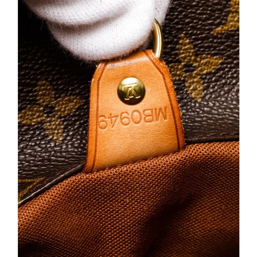 Brown and tan monogram coated canvas Louis Vuitton shopping tote with brass hardware, tan vachetta leather accents, dual flat shoulder straps, brown coated canvas lining and single zip pocket at interior wall.