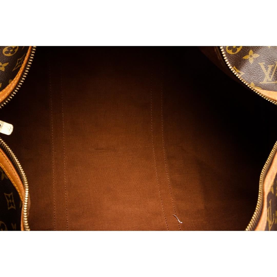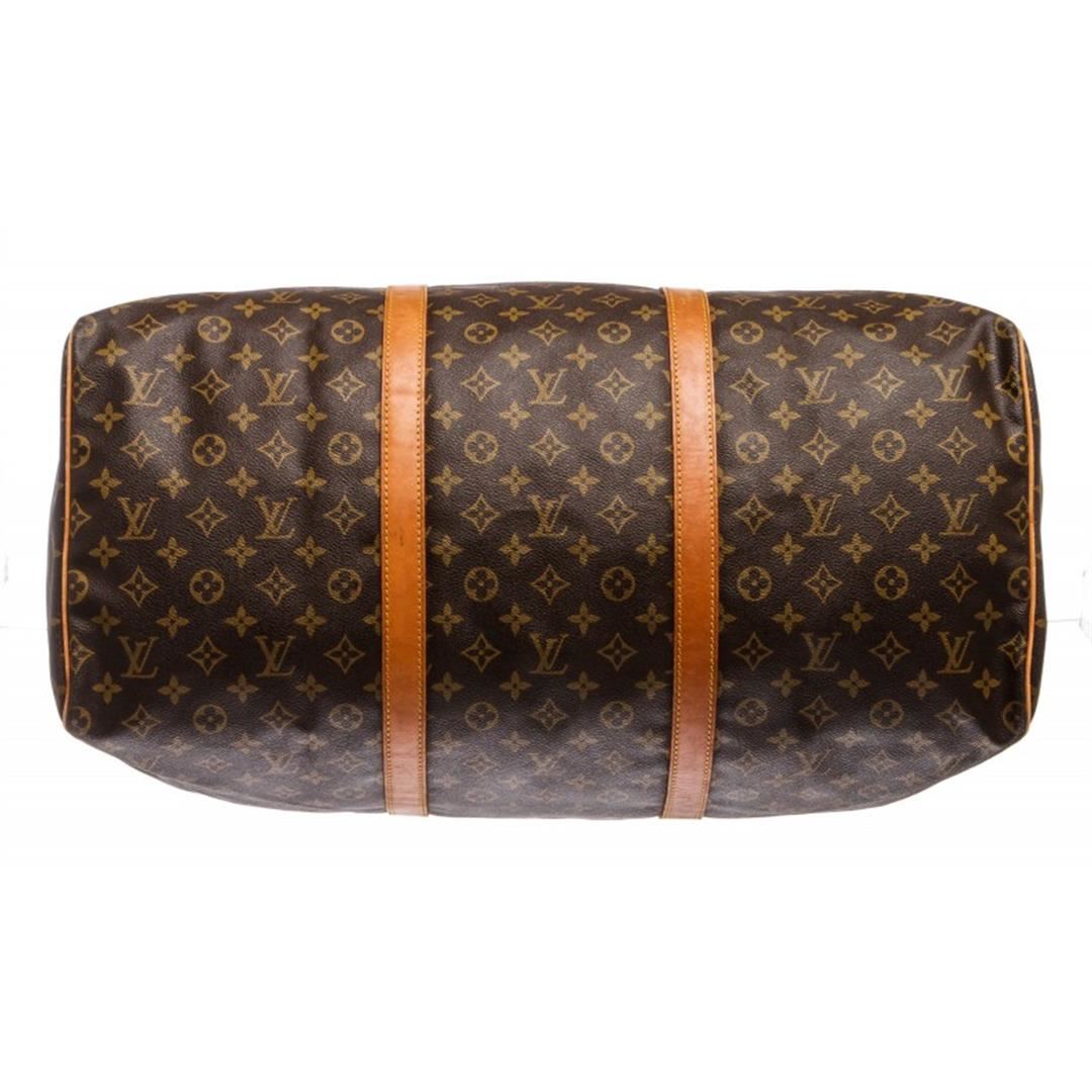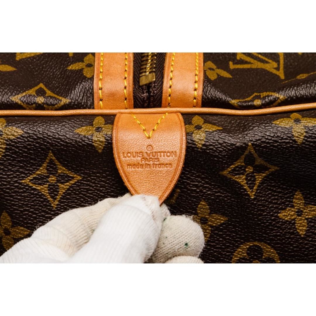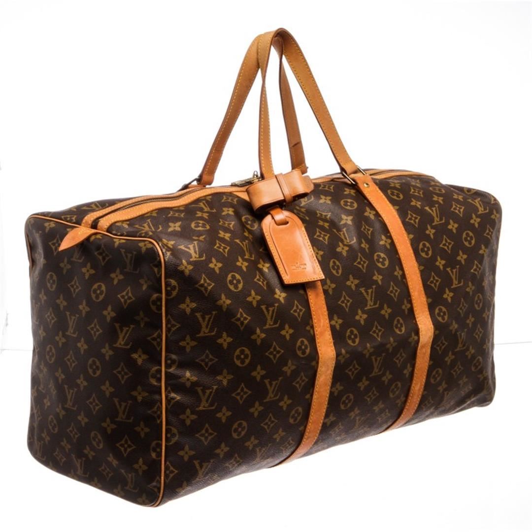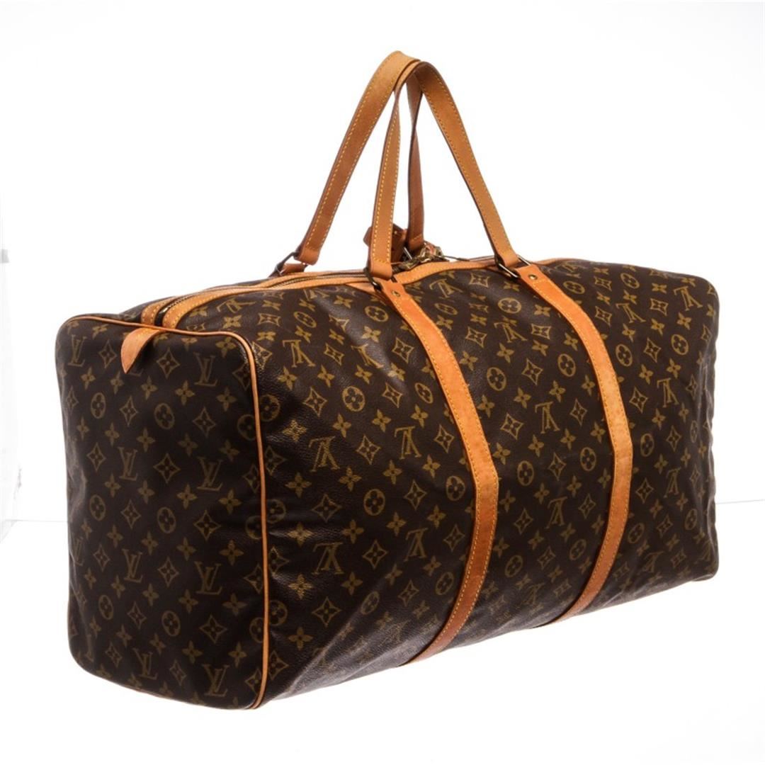 One Louis Vuitton Monogram Canvas Leather Sac Souple 55 cm Duffle Bag. Brown and tan monogram coated canvas Louis Vuitton Sac Souple 55 with brass hardware, tan vachetta leather accents, dual flat shoulder straps, brown canvas interior and two-way zip clo