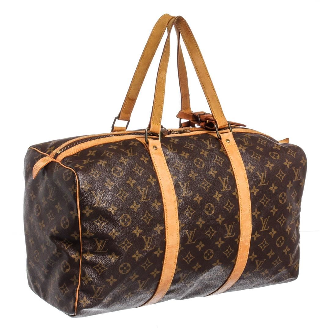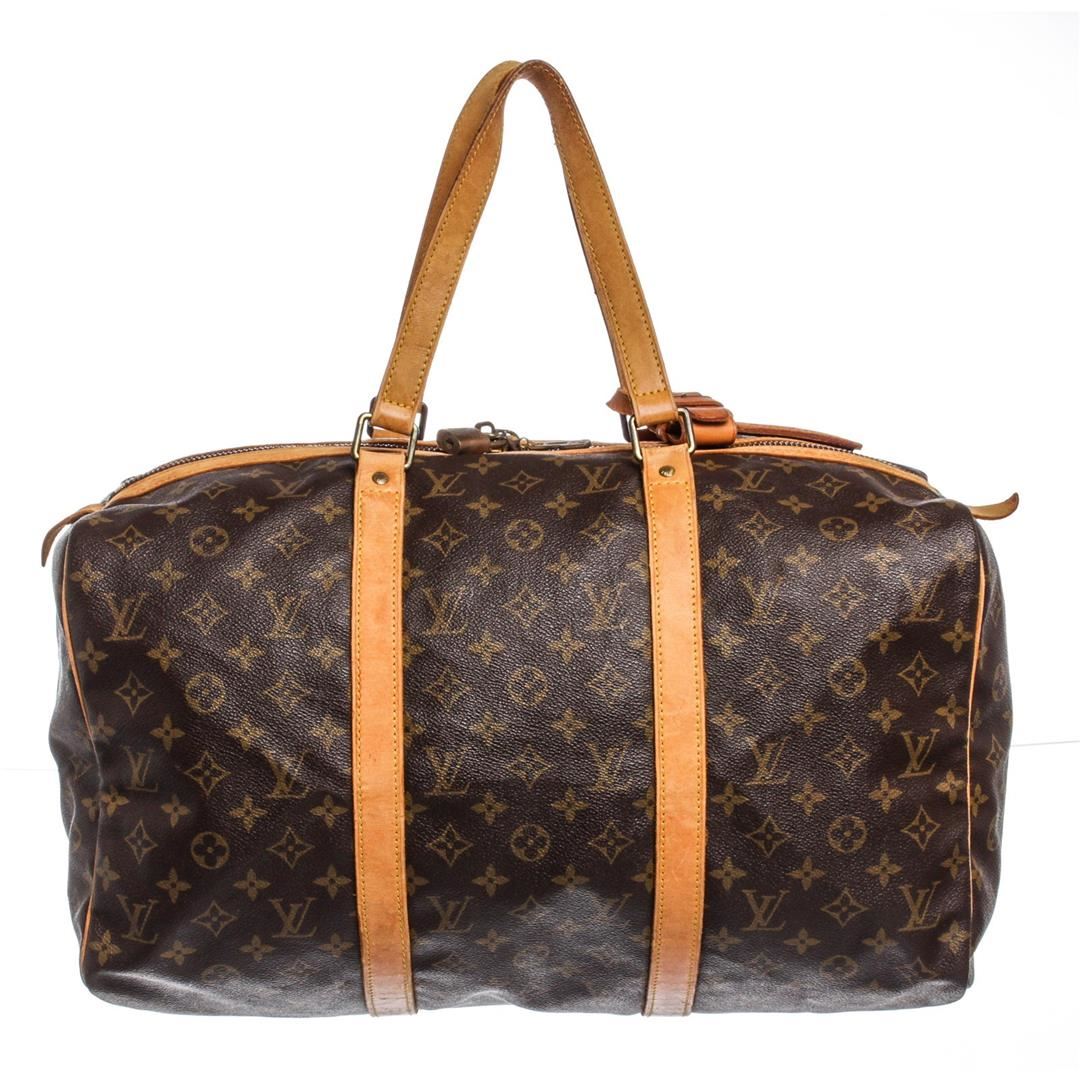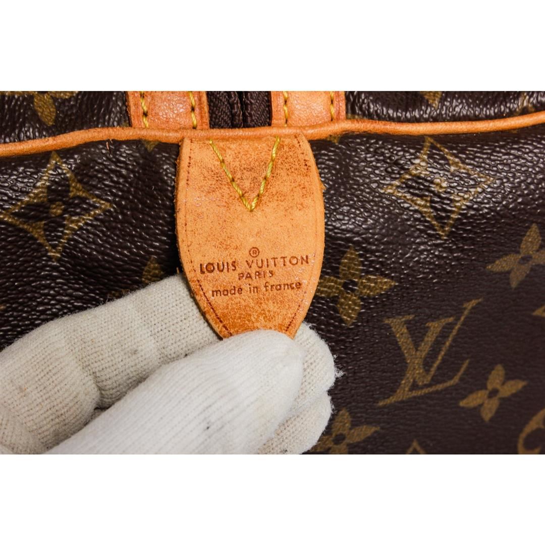 Brown and tan monogram coated canvas Louis Vuitton Sac Souple 55 with brass hardware, tan vachetta leather accents, dual flat shoulder straps, brown canvas interior and two-way zip closure at top.