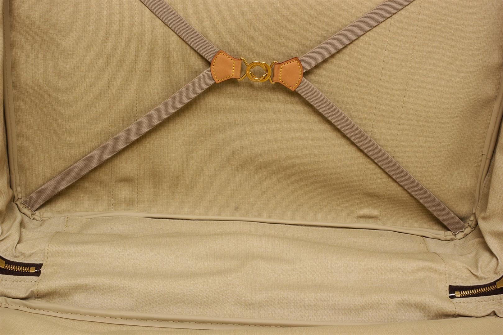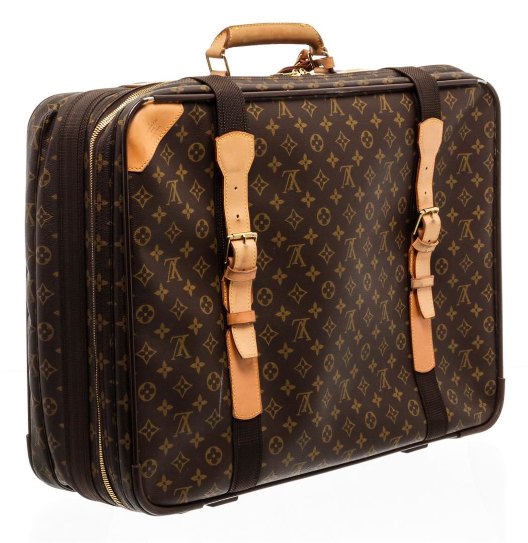 Brown and tan monogram coated canvas Louis Vuitton Satellite 60 with brass hardware, tan vachetta leather trim, single rolled top handle, protective feet at base, beige coated canvas interior, single interior slit pocket, compression straps with hook closures at interior wall, single clear ID window and two-way zip-around closure at exterior with additional dual buckle closures. Includes luggage tag. Please note: Coated wire trim is loose. Authentic.