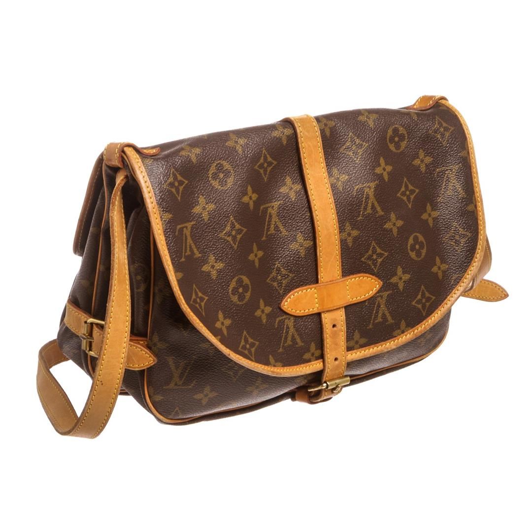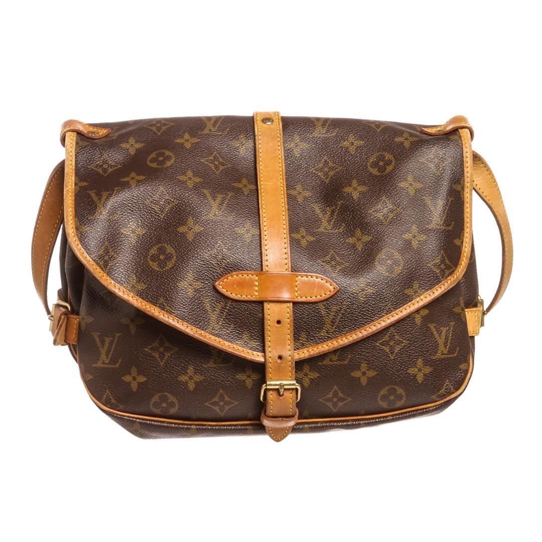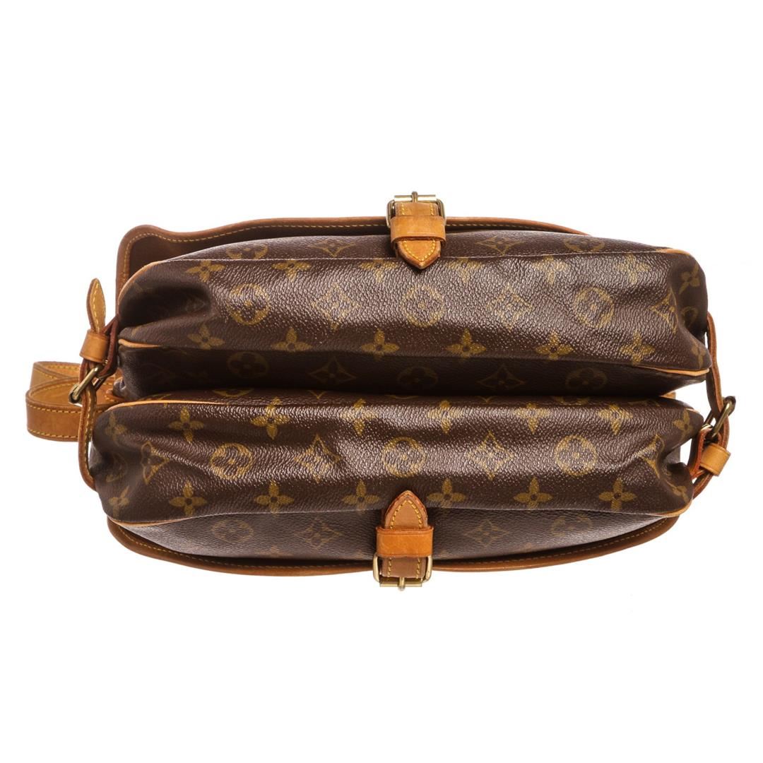 Brown and tan monogram coated canvas Louis Vuitton Saumur 30 with brass hardware, tan vachetta leather trim, adjustable flat shoulder strap, dual exterior compartments, brown canvas interior lining, single slit pocket at interior wall and dual buckle clos