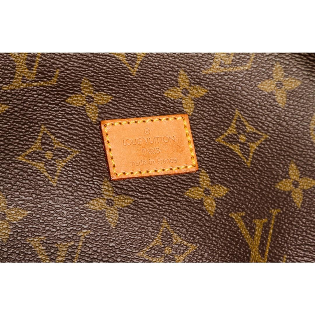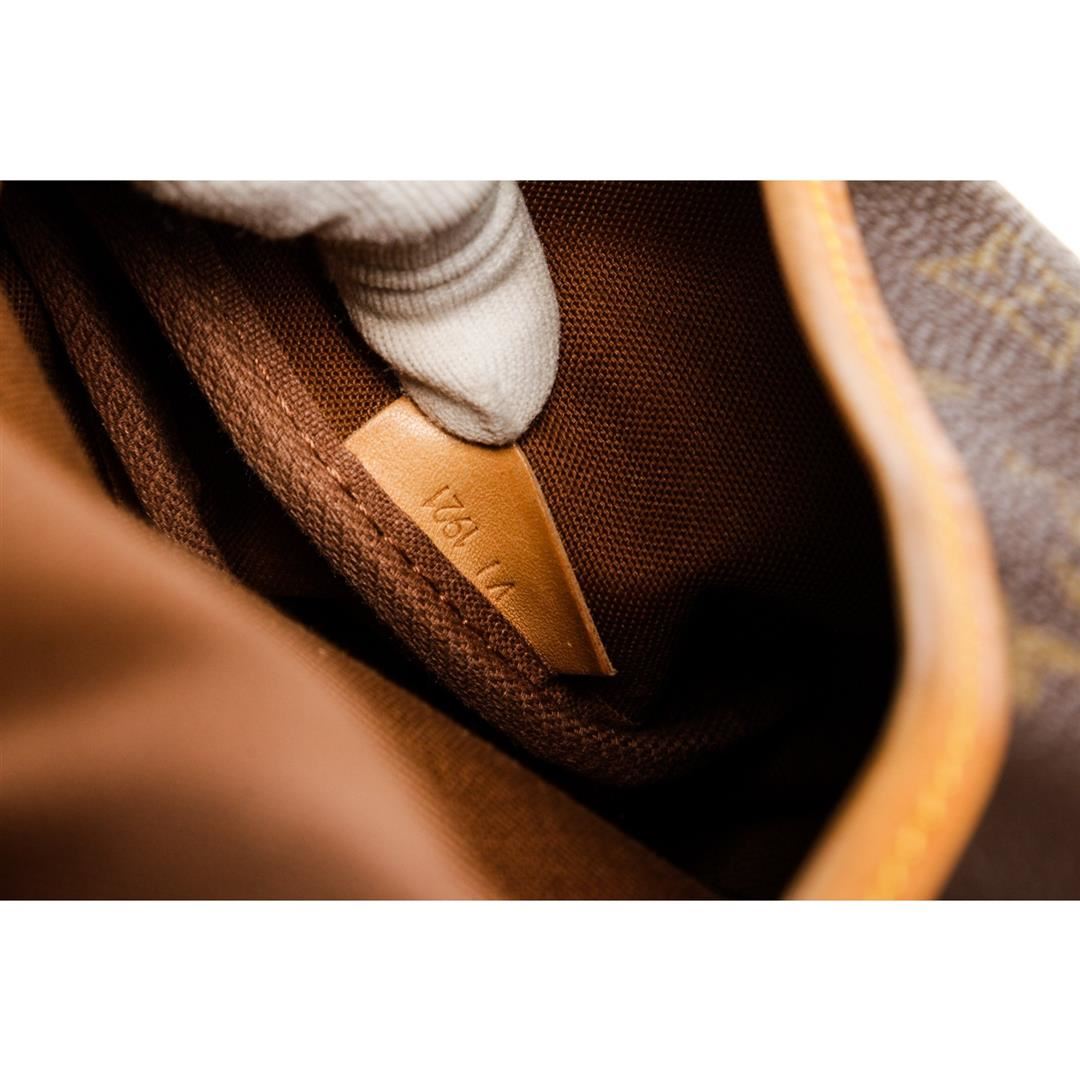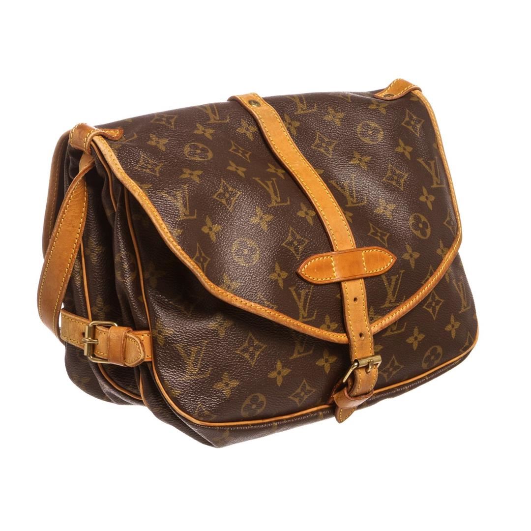 Brown and tan monogram coated canvas Louis Vuitton Saumur 30 with brass hardware, tan vachetta leather trim, adjustable flat shoulder strap, dual exterior compartments, brown canvas interior lining, single slit pocket at interior wall and dual buckle clos