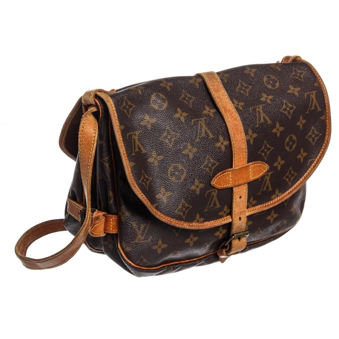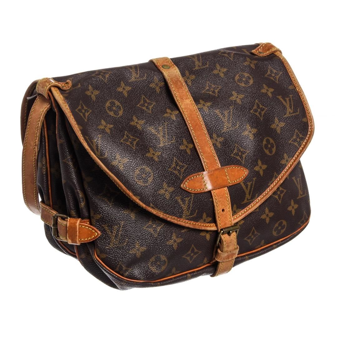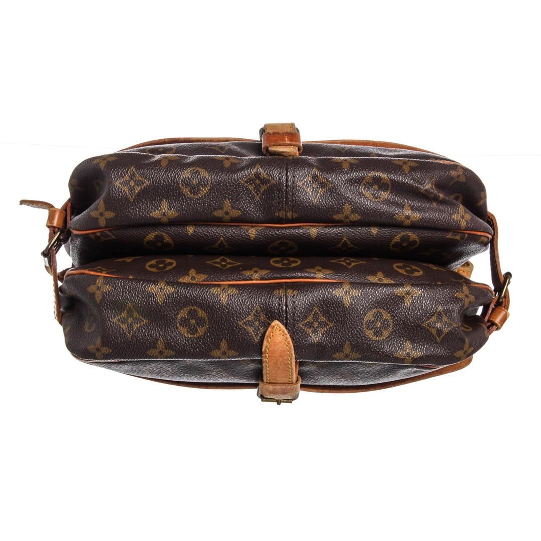 Brown and tan monogram coated canvas Louis Vuitton Saumur 30 with brass hardware, tan vachetta leather trim, adjustable flat shoulder strap, dual exterior compartments, brown canvas interior lining, single slit pocket at interior wall and dual buckle closures at front flaps.
