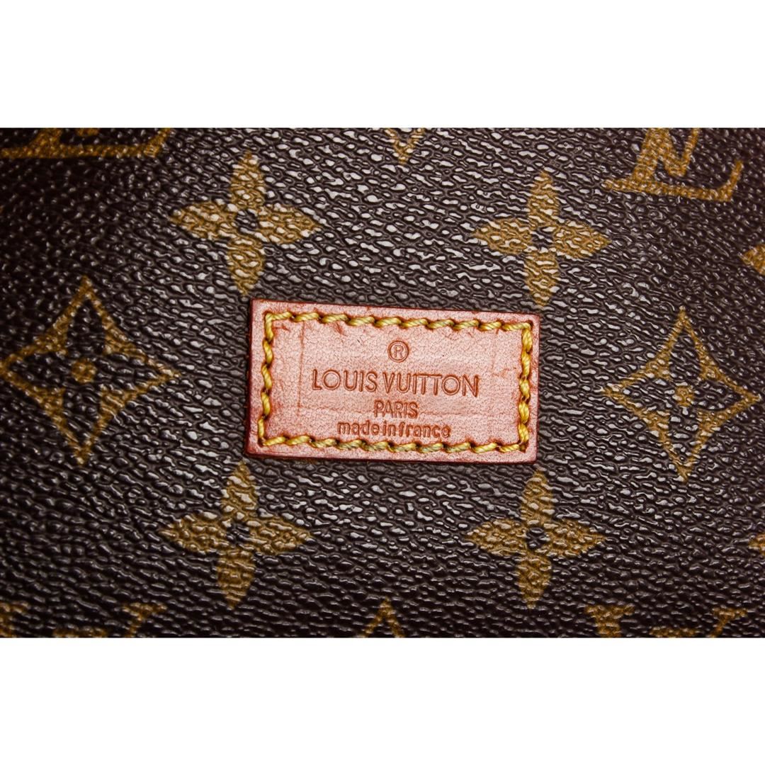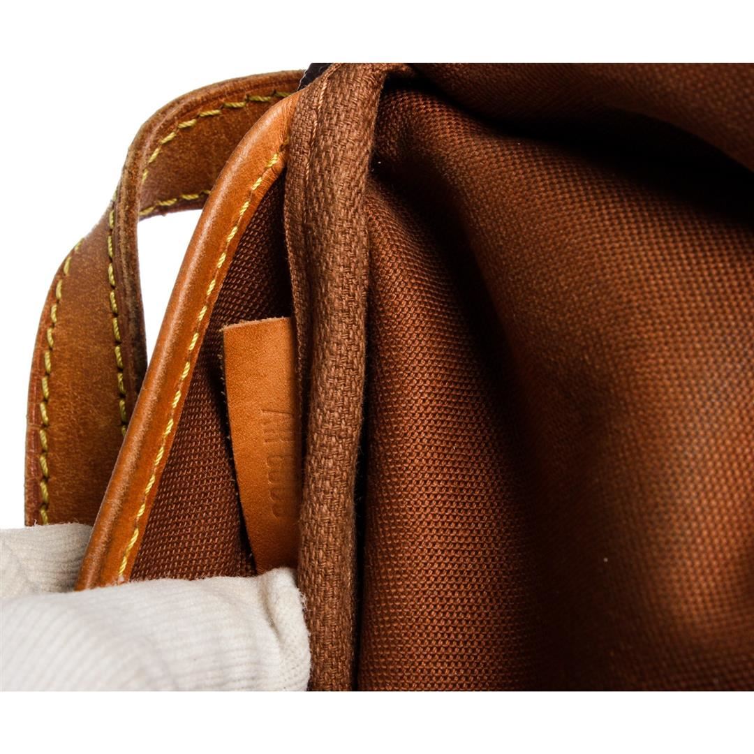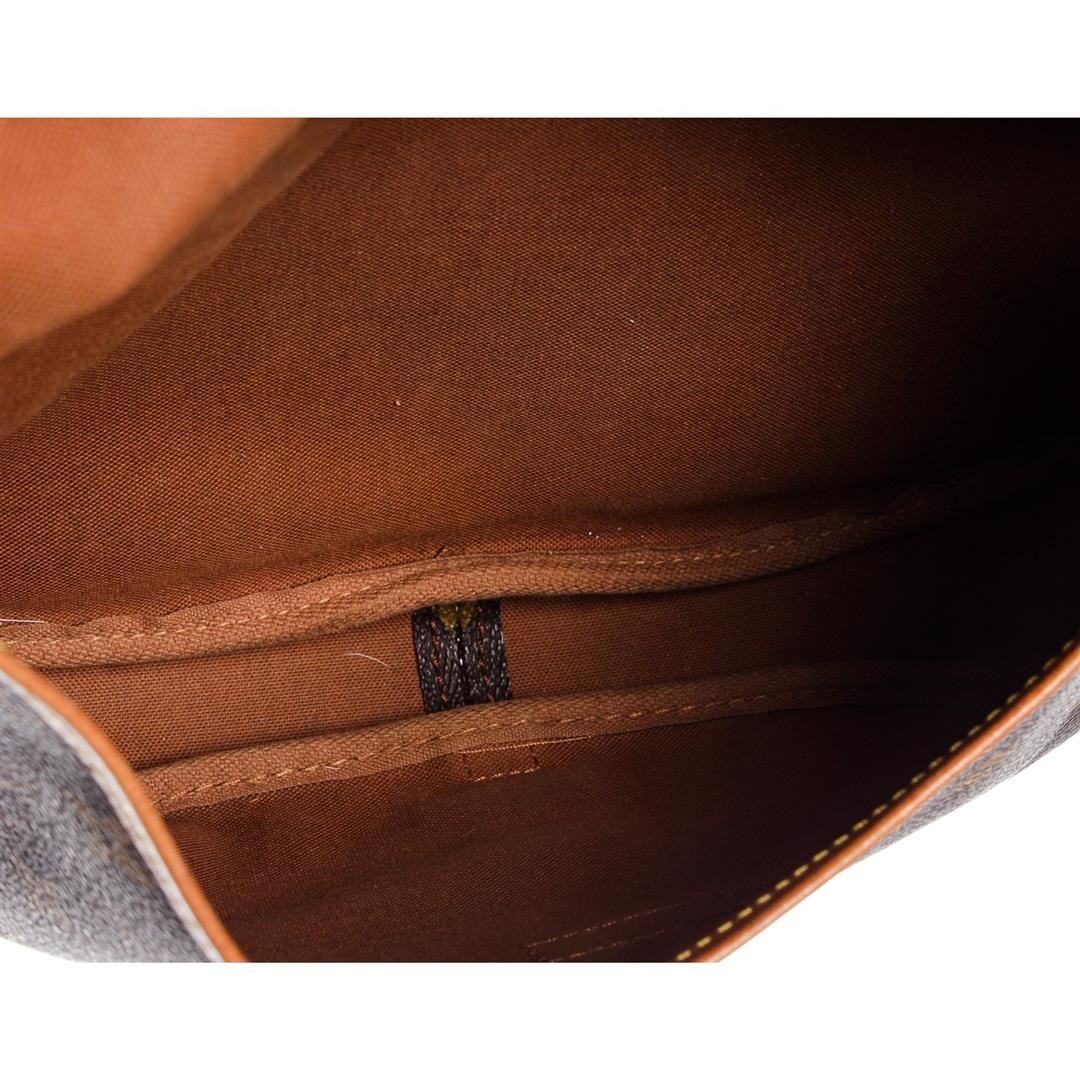 Brown and tan monogram coated canvas Louis Vuitton Saumur 30 with brass hardware, tan vachetta leather trim, adjustable flat shoulder strap, dual exterior compartments, brown canvas interior lining, single slit pocket at interior wall and dual buckle closures at front flaps.