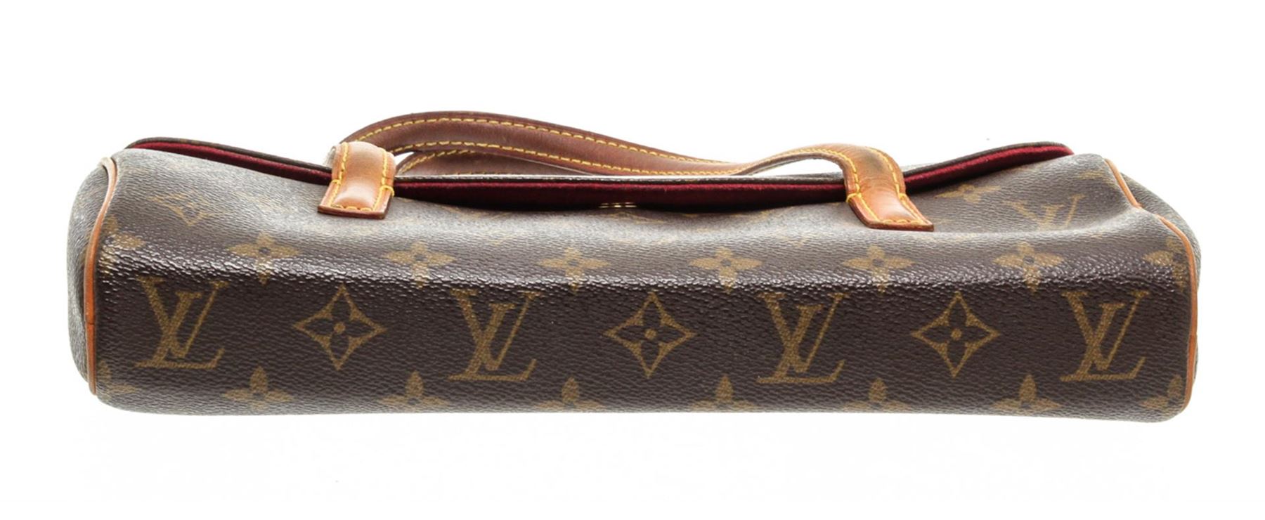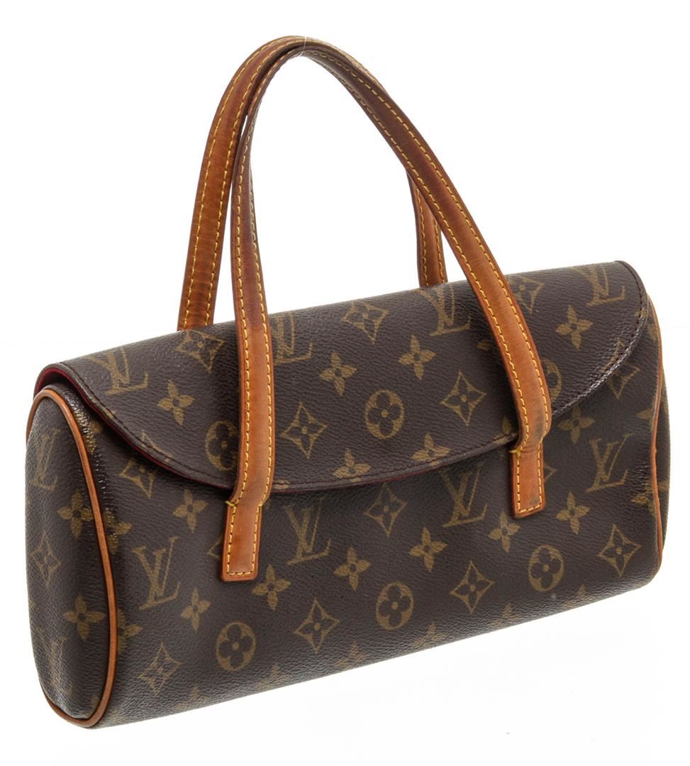 Brown and tan monogram coated canvas Louis Vuitton Sonatine bag with brass hardware, tan vachetta leather trim, dual flat top handles, crimson Alcantara lining, single open pocket at interior wall and magnetic snap closure at front flap.