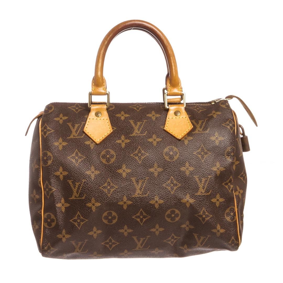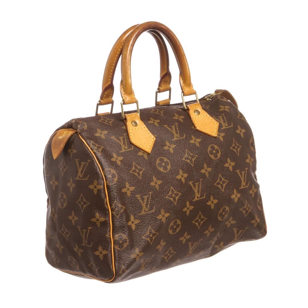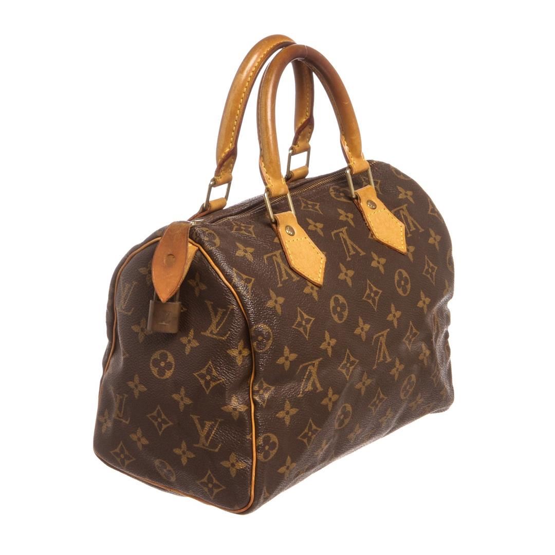 Brown and tan monogram coated canvas Louis Vuitton Speedy 25 with brass hardware, tan vachetta leather trim, dual rolled top handles, brown canvas lining, single slit pocket at interior wall and zip closure at top. Item is pre-owned.