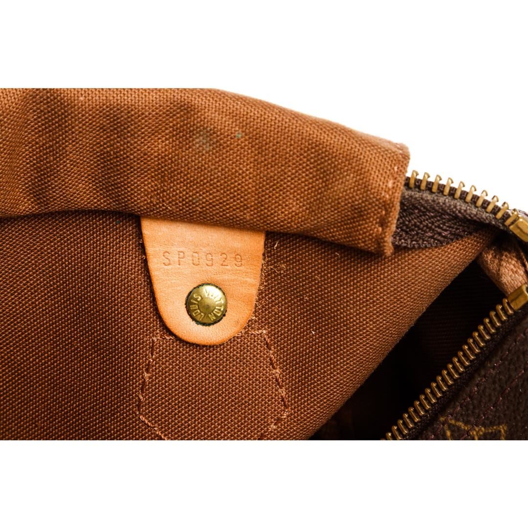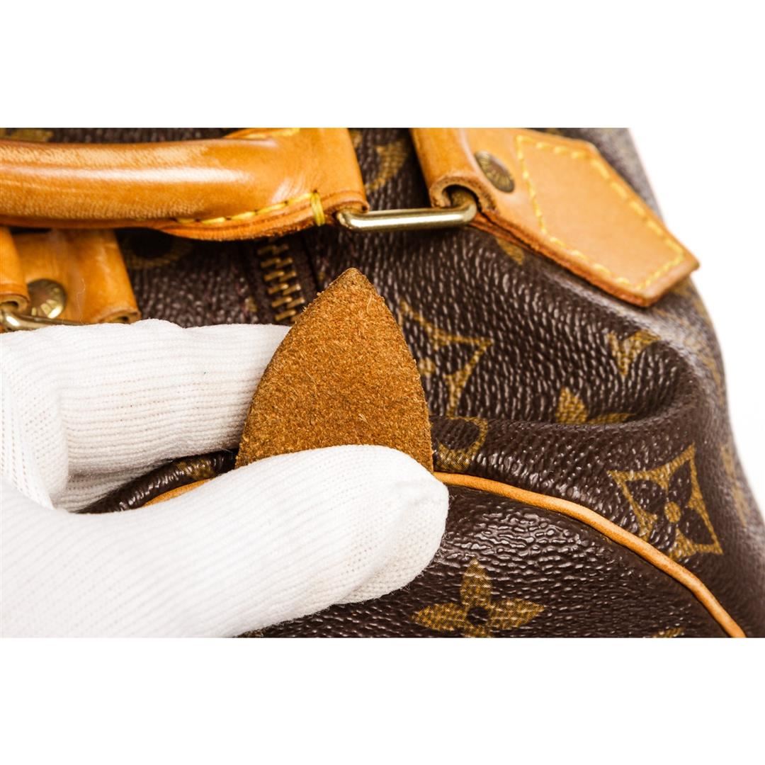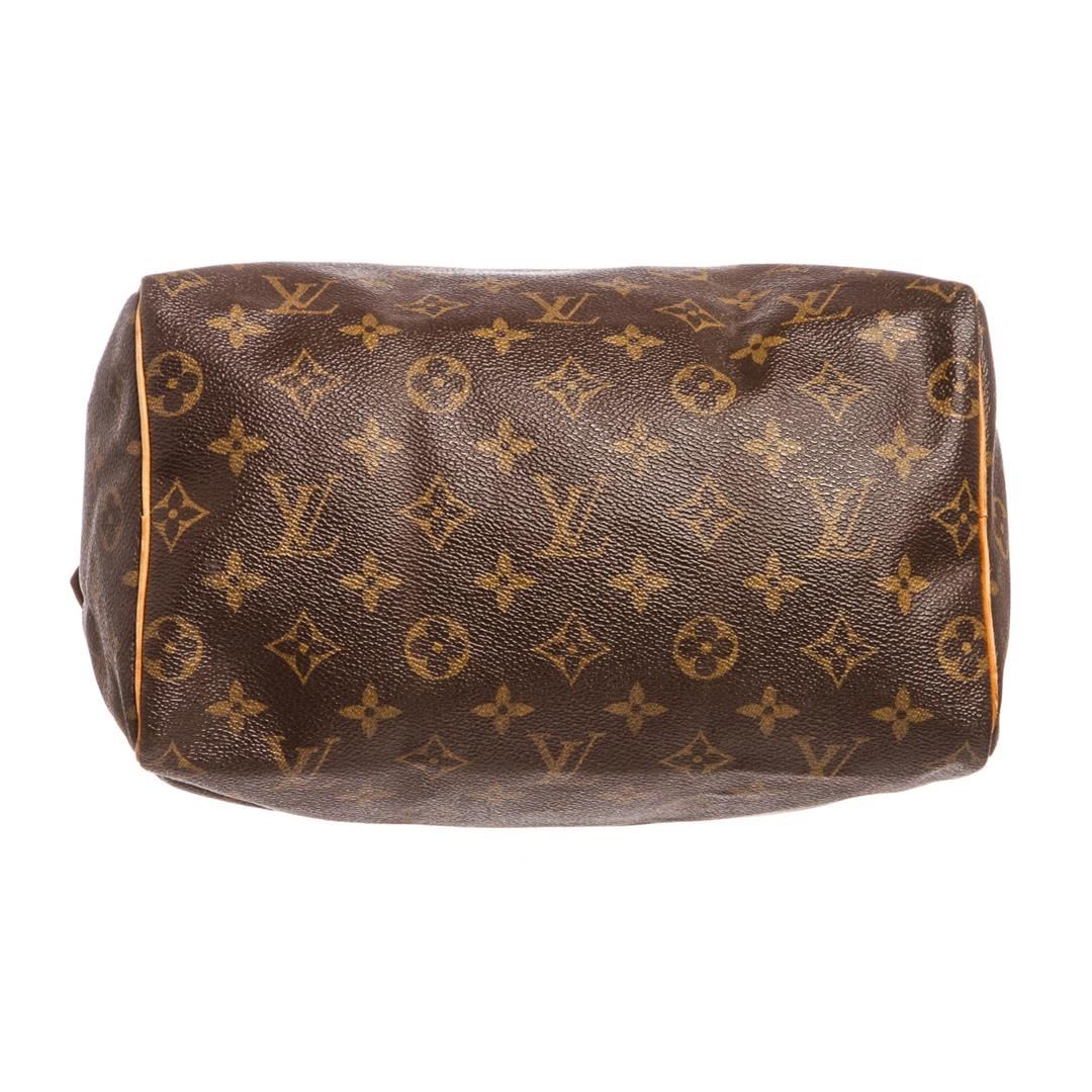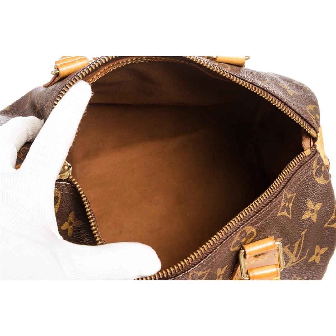 Brown and tan monogram coated canvas Louis Vuitton Speedy 25 with brass hardware, tan vachetta leather trim, dual rolled top handles, brown canvas lining, single slit pocket at interior wall and zip closure at top. Item is pre-owned.