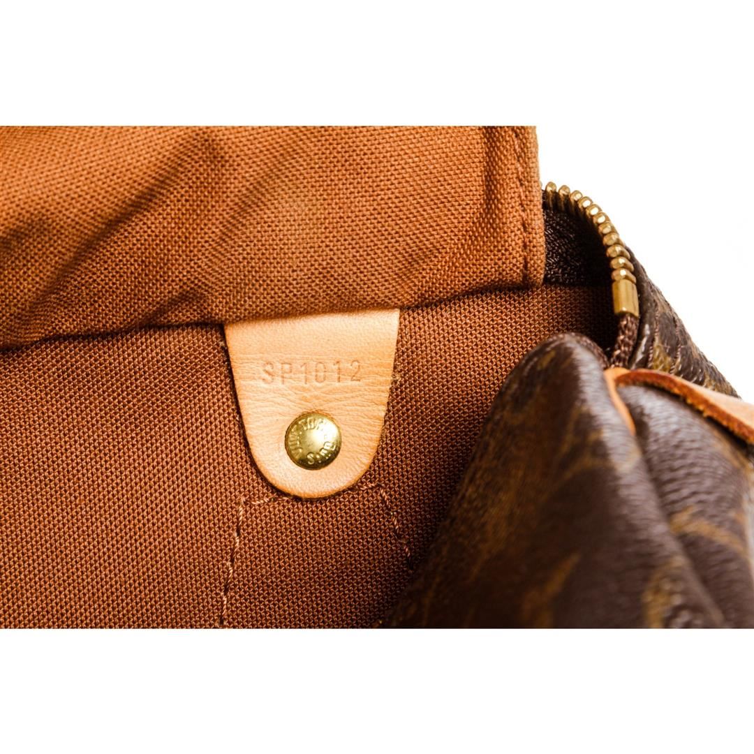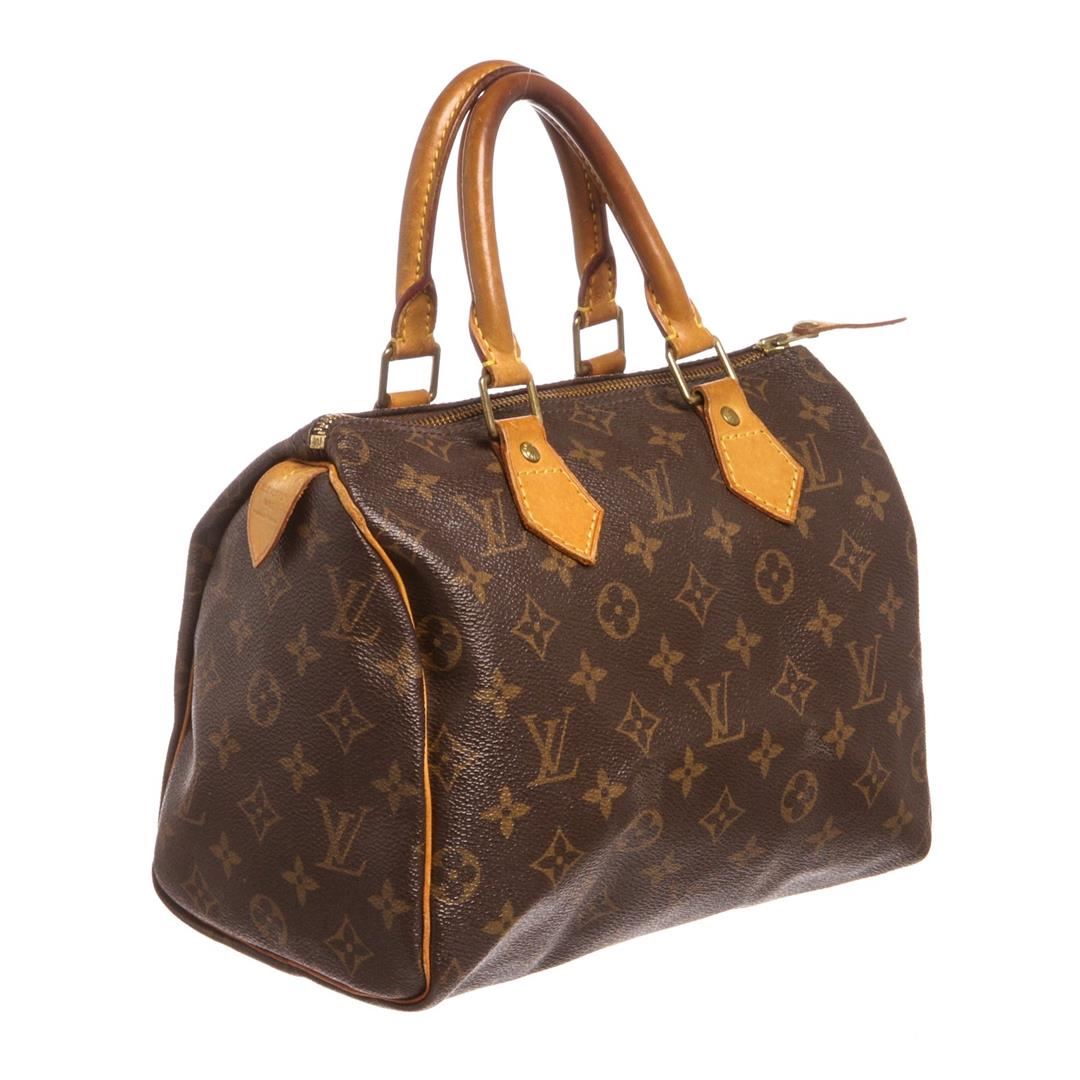 Brown and tan monogram coated canvas Louis Vuitton Speedy 25 with brass hardware, tan vachetta leather trim, dual rolled top handles, brown canvas lining, single slit pocket at interior wall and zip closure at top. Item is pre-owned. Item Dimensions: 10"x5.5"x8.5"xHandle Drop:3.5"/25.4cmx13.9cmx21.5cmxHandle Drop:8.8cm.