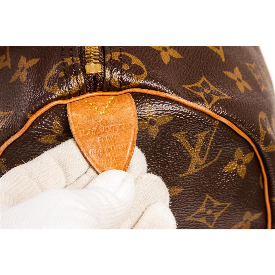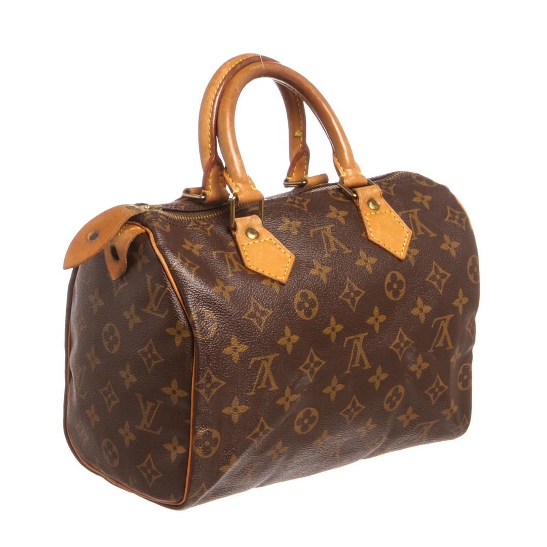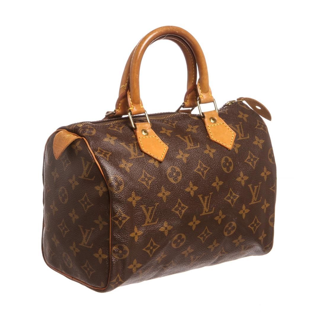 Brown and tan monogram coated canvas Louis Vuitton Speedy 25 with brass hardware, tan vachetta leather trim, dual rolled top handles, brown canvas lining, single slit pocket at interior wall and zip closure at top. Item is pre-owned. Item Dimensions: 10"x5.5"x8.5"xHandle Drop:3.5"/25.4cmx13.9cmx21.5cmxHandle Drop:8.8cm.