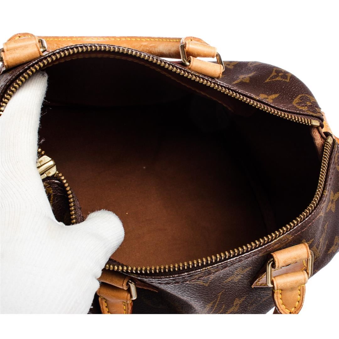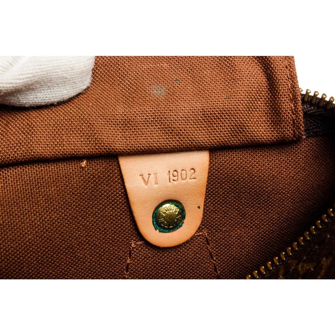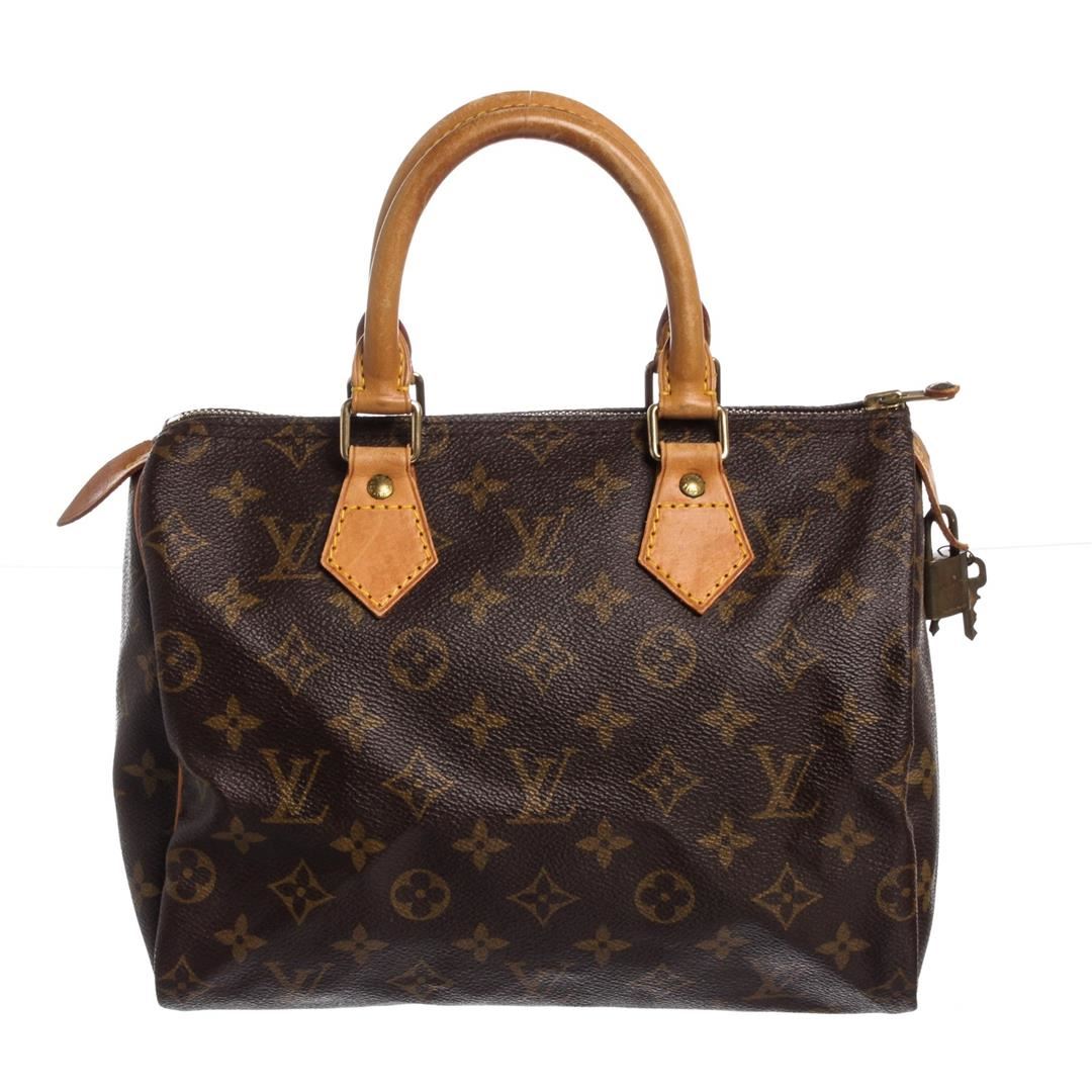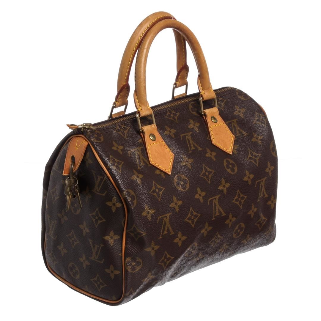 Brown and tan monogram coated canvas Louis Vuitton Speedy 25 with brass hardware, tan vachetta leather trim, dual rolled top handles, brown canvas lining, single slit pocket at interior wall and zip closure at top.