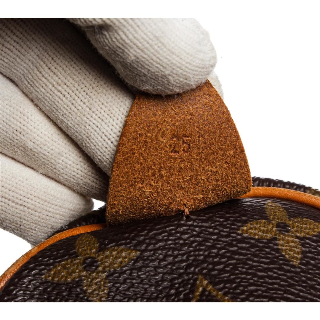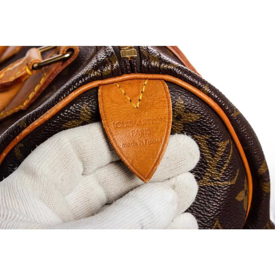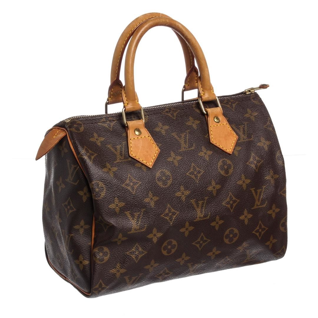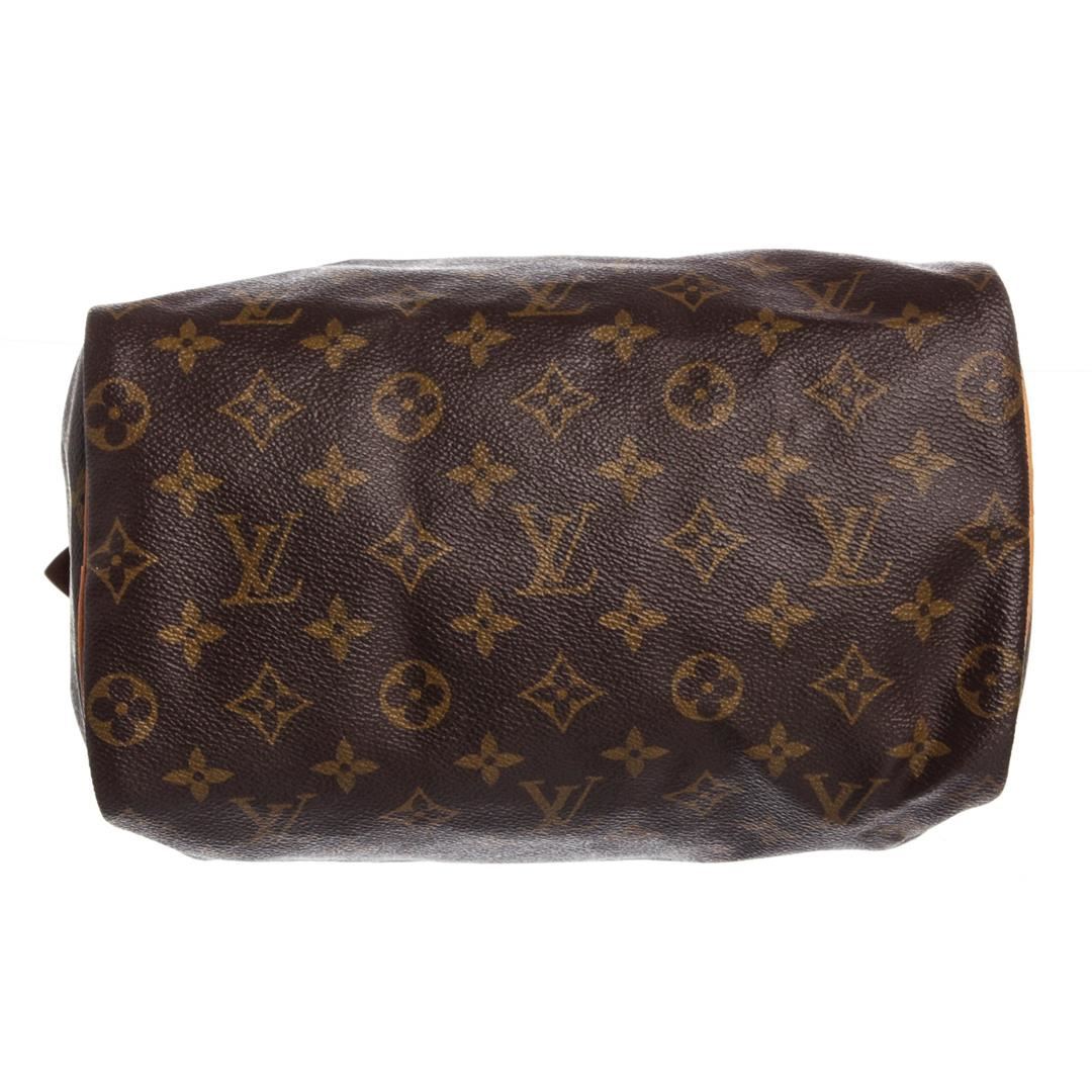 Brown and tan monogram coated canvas Louis Vuitton Speedy 25 with brass hardware, tan vachetta leather trim, dual rolled top handles, brown canvas lining, single slit pocket at interior wall and zip closure at top.