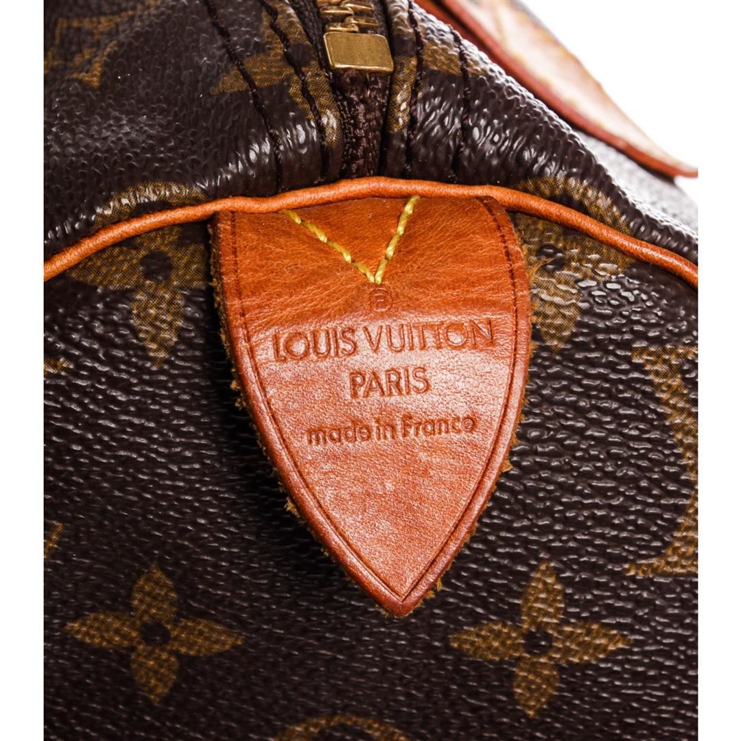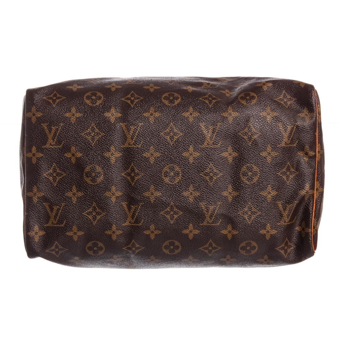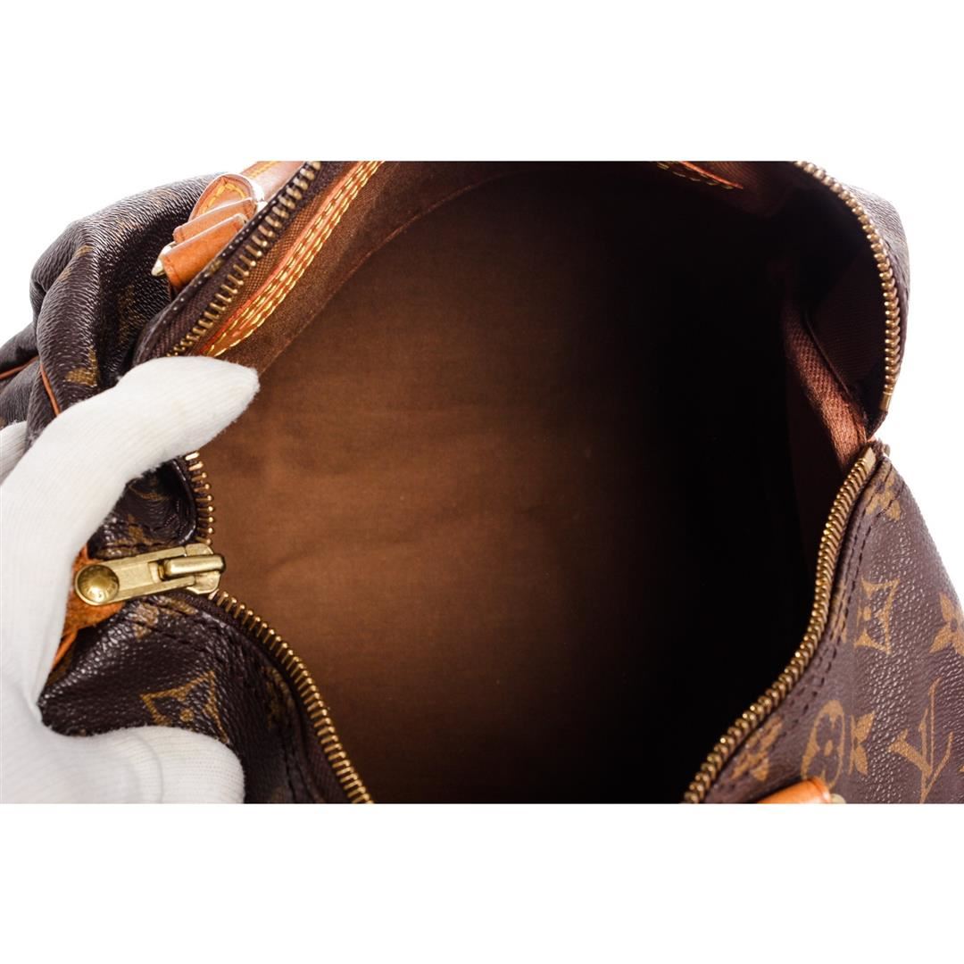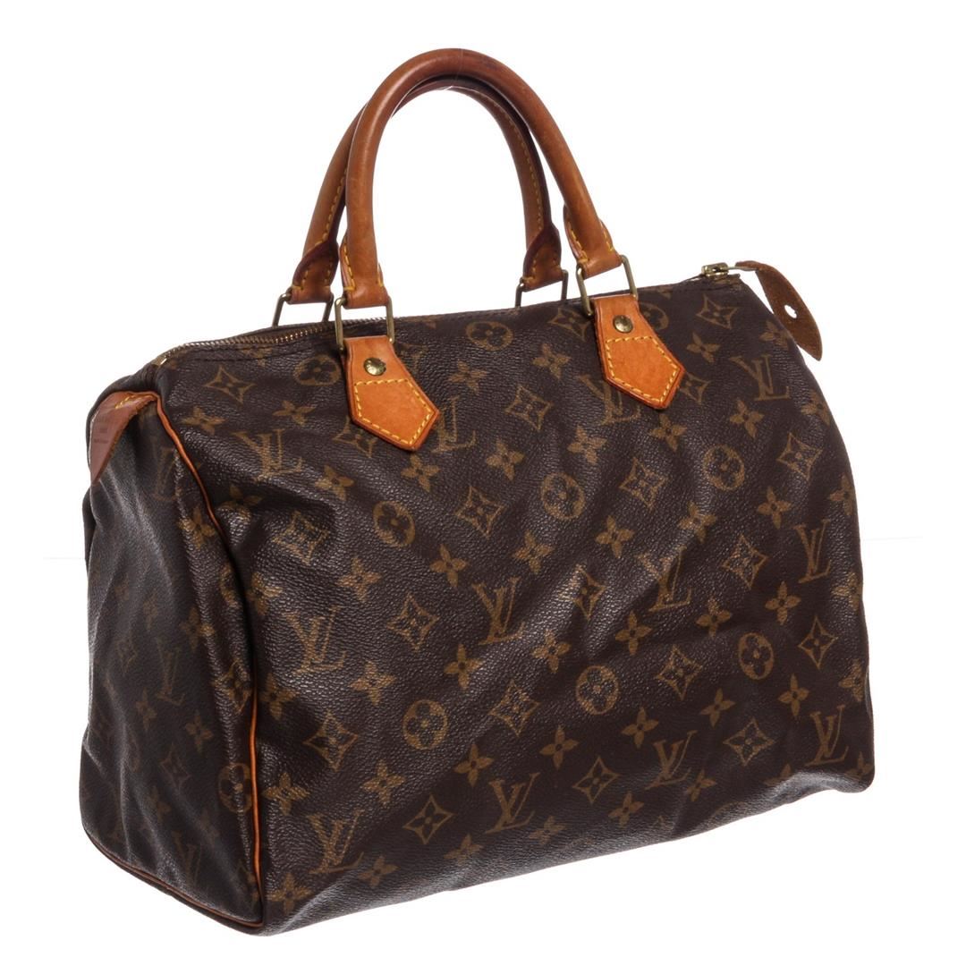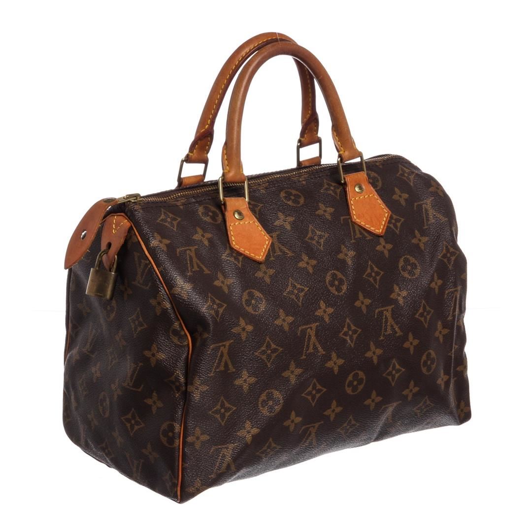 Brown and tan monogram coated canvas Louis Vuitton Speedy 30 with brass hardware, tan vachetta leather trim, dual rolled top handles, brown canvas lining, single slit pocket at interior wall and zip closure at top.