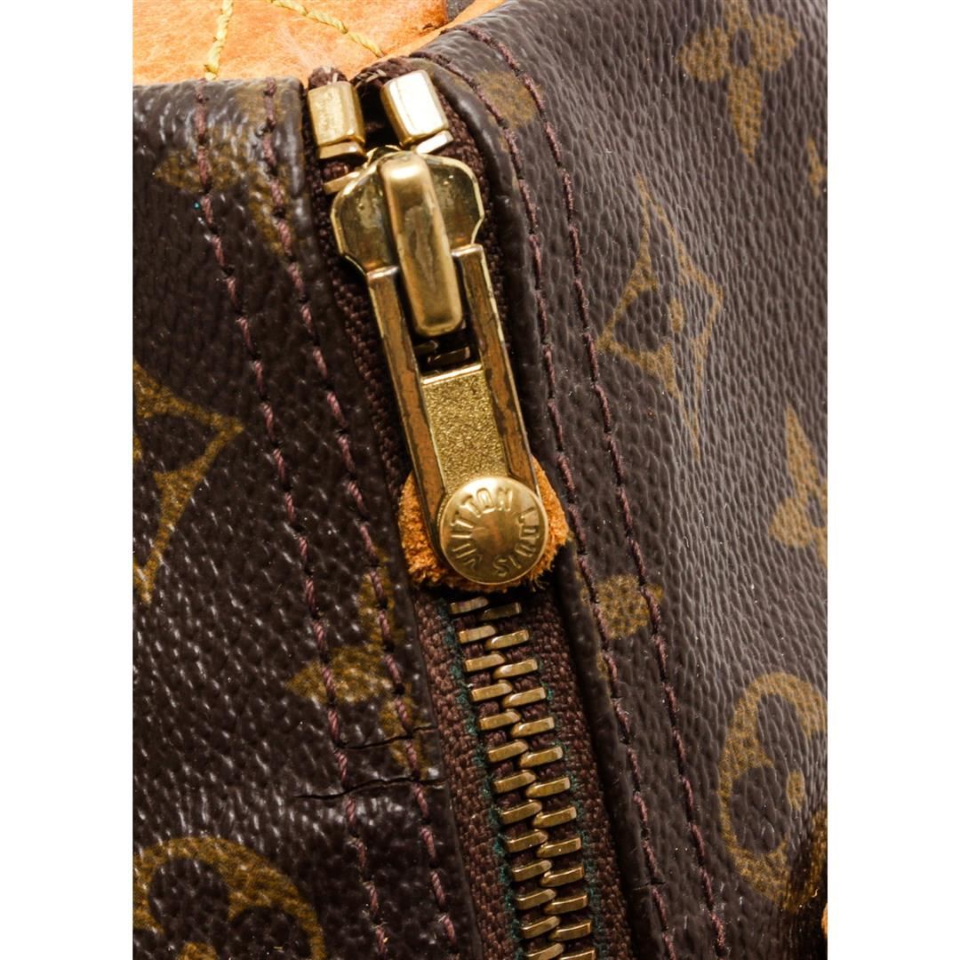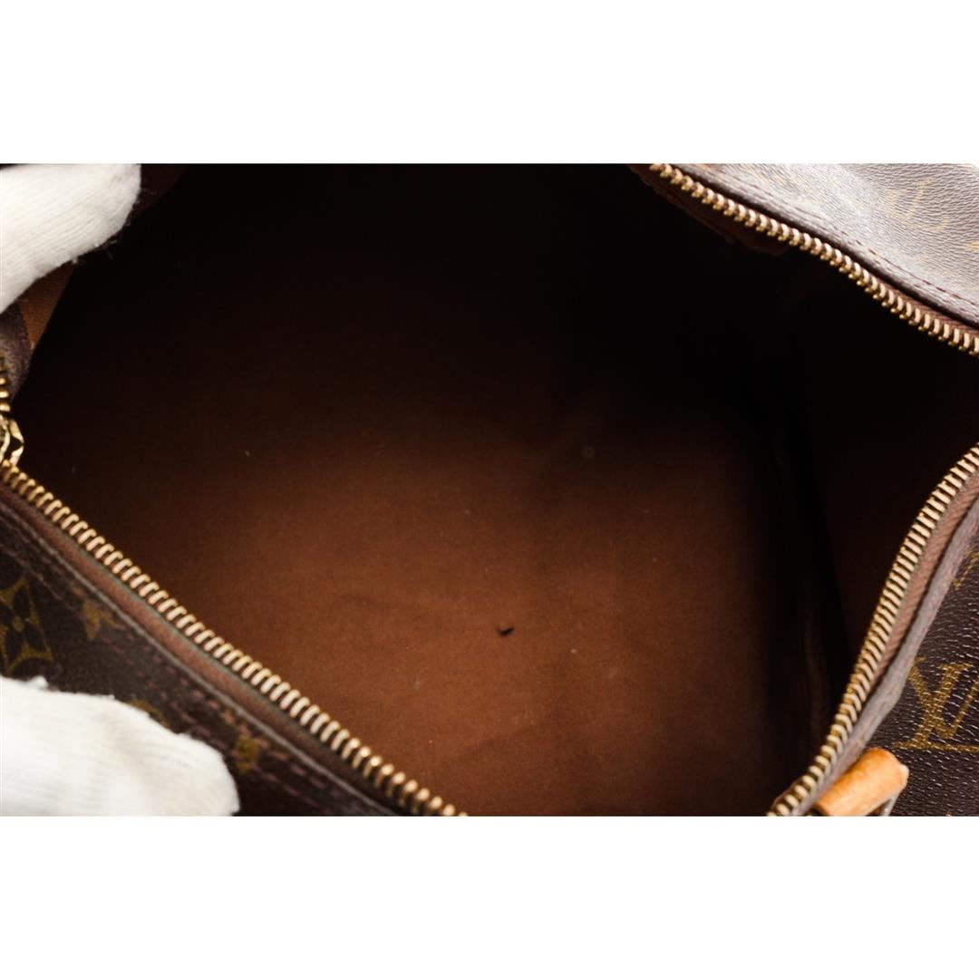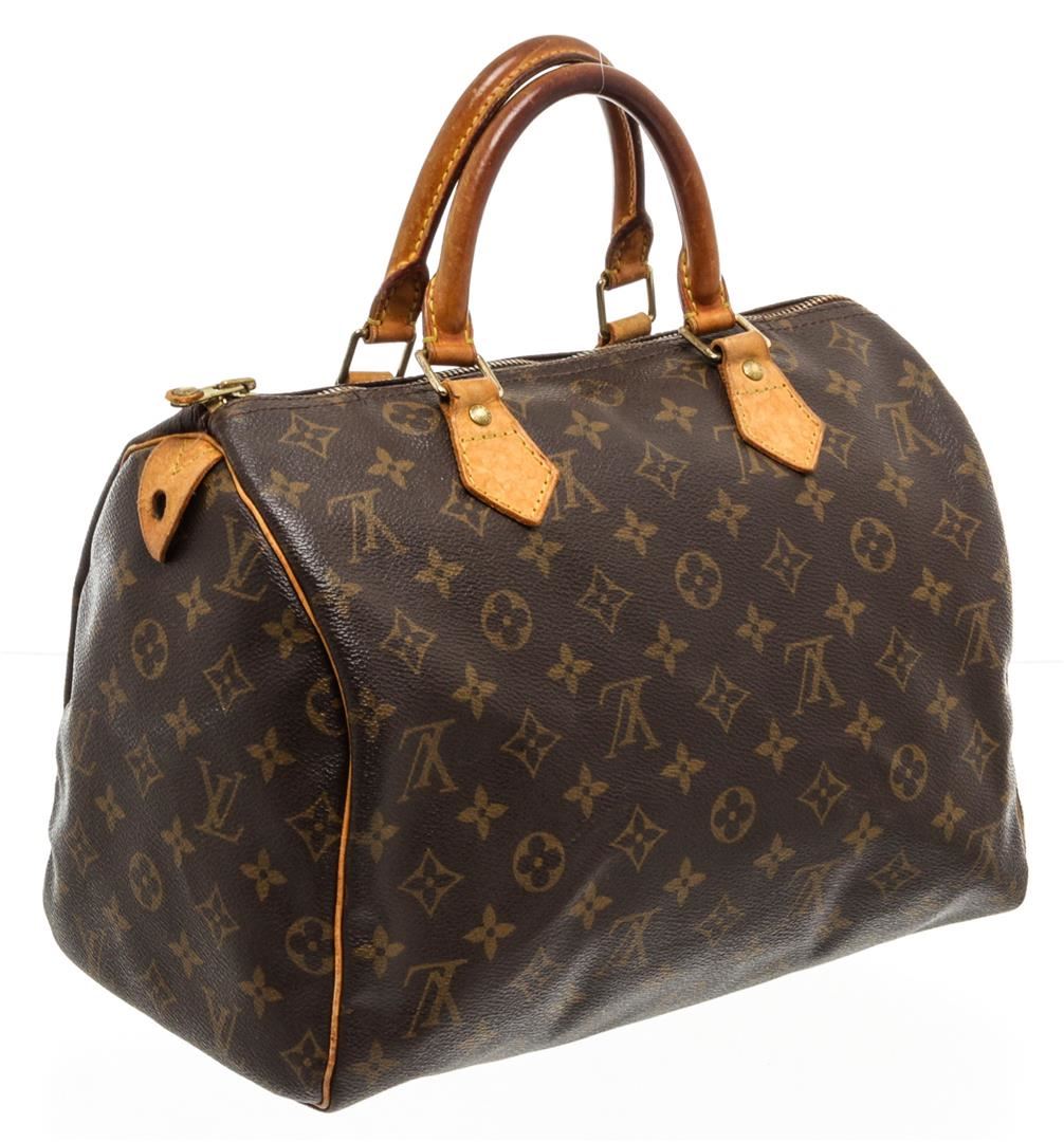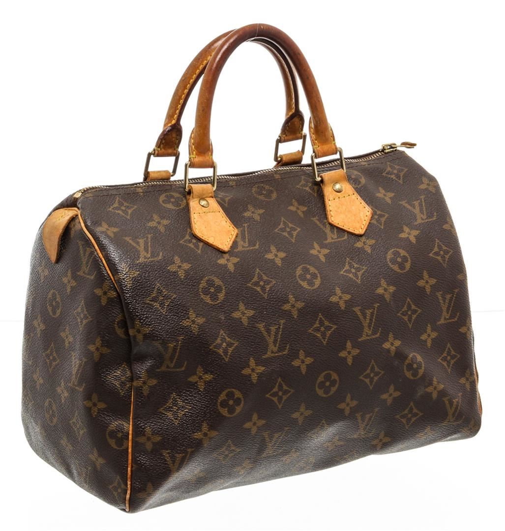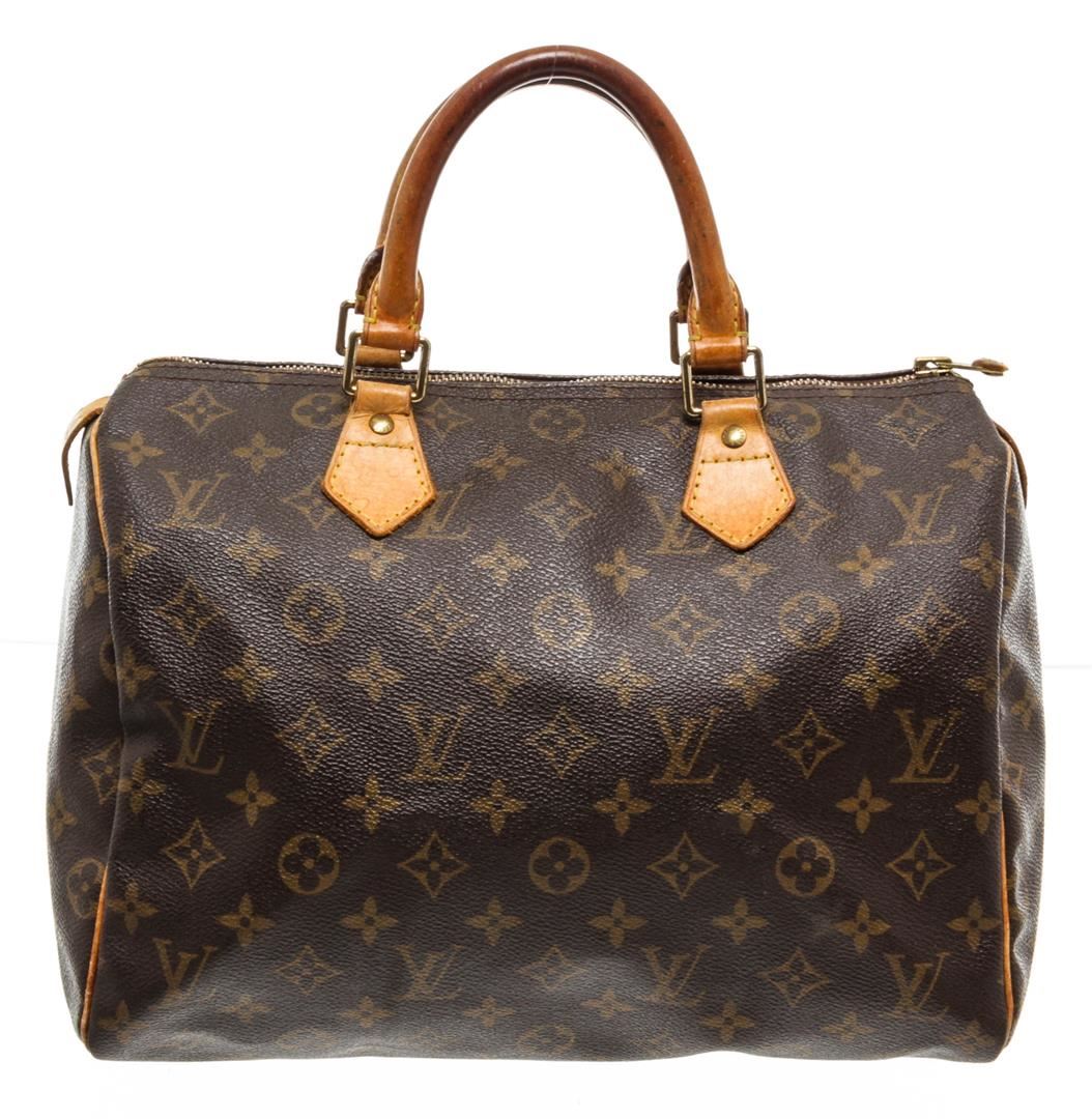 Brown and tan monogram coated canvas Louis Vuitton Speedy 30 with brass hardware, tan vachetta leather trim, dual rolled top handles, brown canvas lining, single slit pocket at interior wall and zip closure at top.