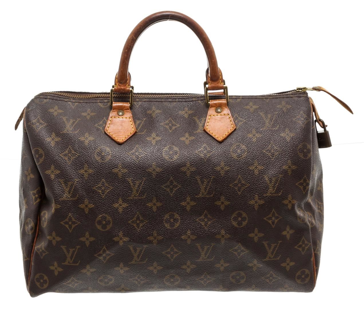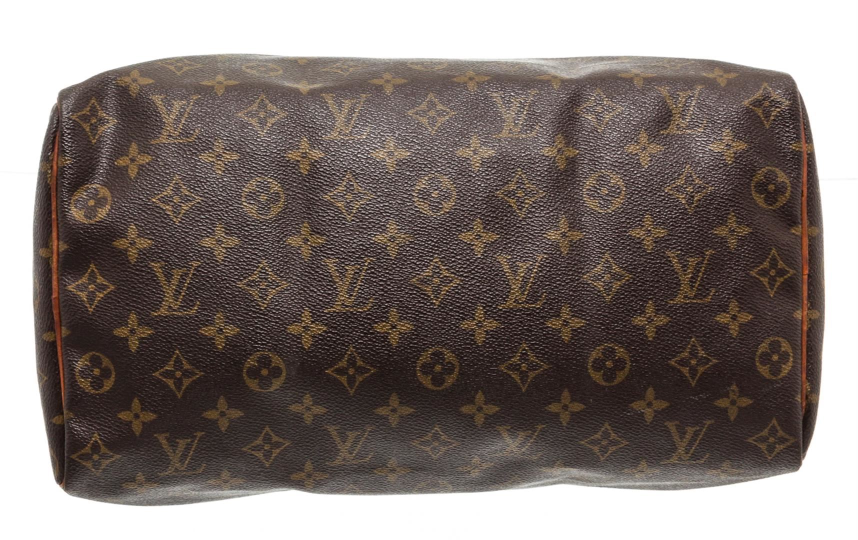 Brown and tan monogram coated canvas Louis Vuitton Speedy 30 with brass hardware, tan vachetta leather trim, dual rolled top handles, brown canvas lining, single slit pocket at interior wall and zip closure at top.