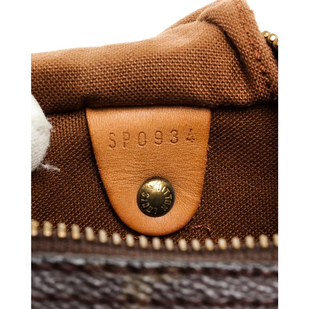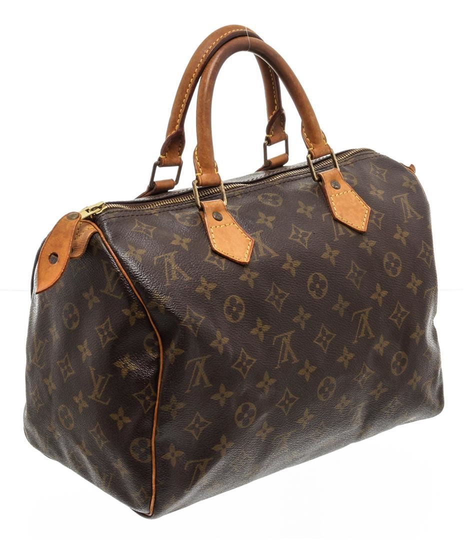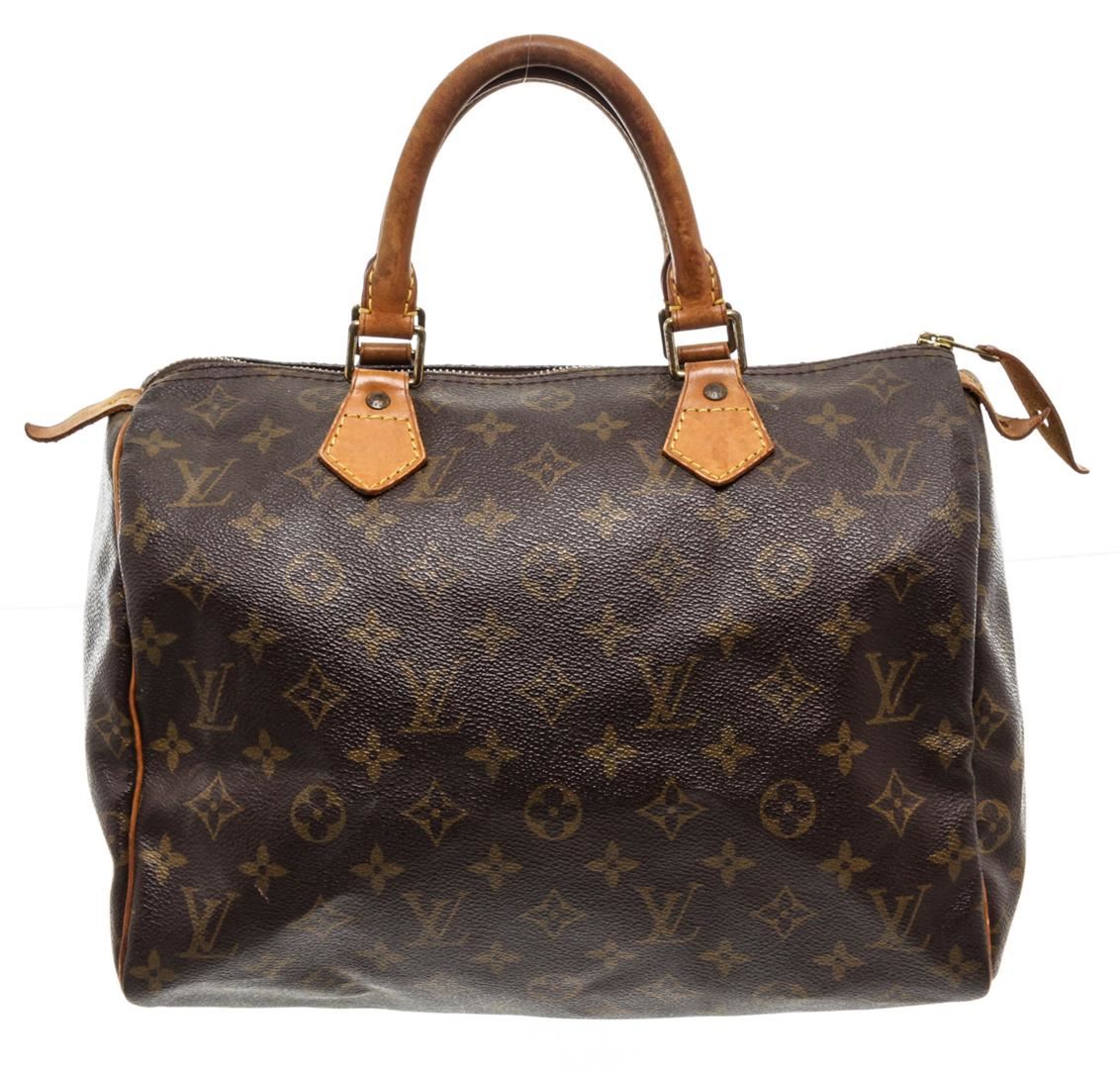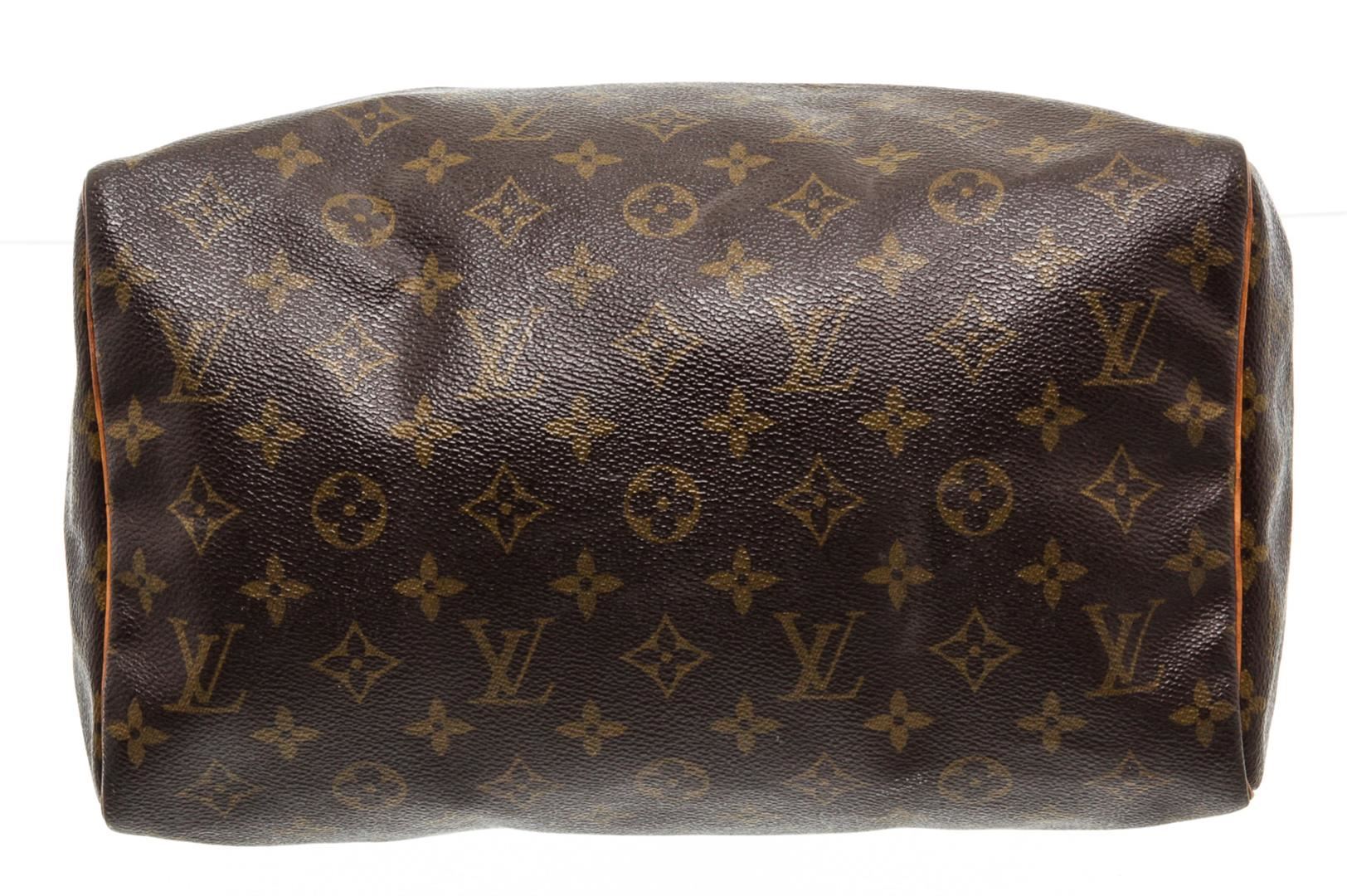 Brown and tan monogram coated canvas Louis Vuitton Speedy 30 with brass hardware, tan vachetta leather trim, dual rolled top handles, brown canvas lining, single slit pocket at interior wall and zip closure at top.