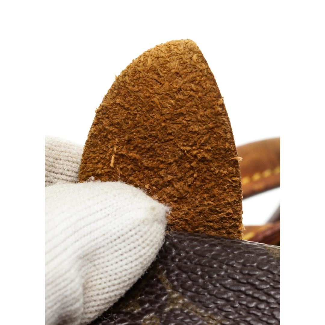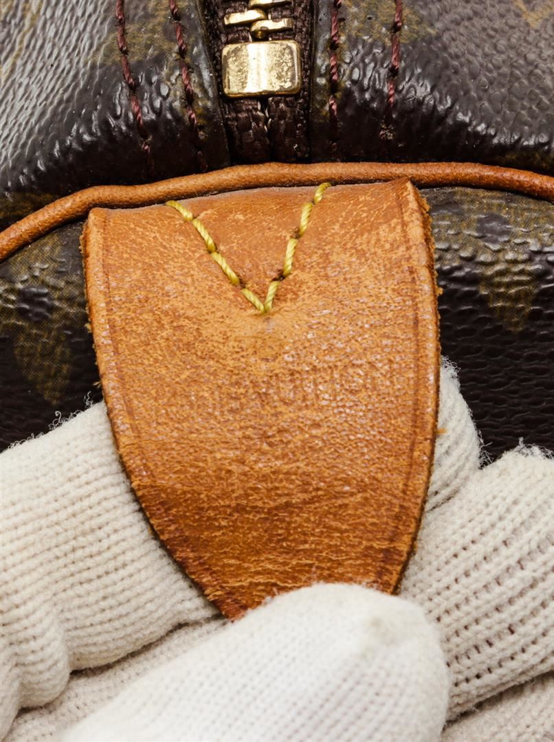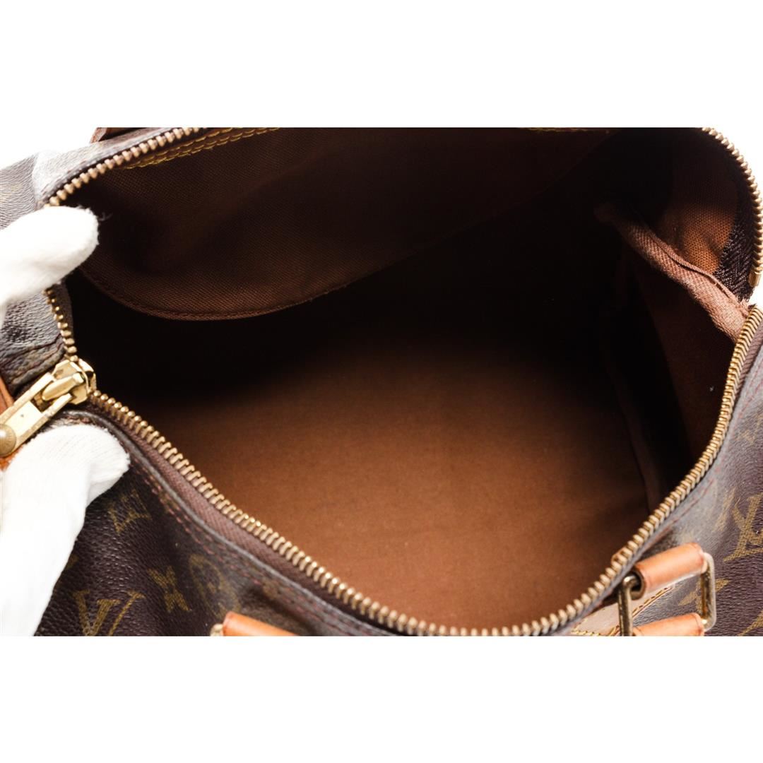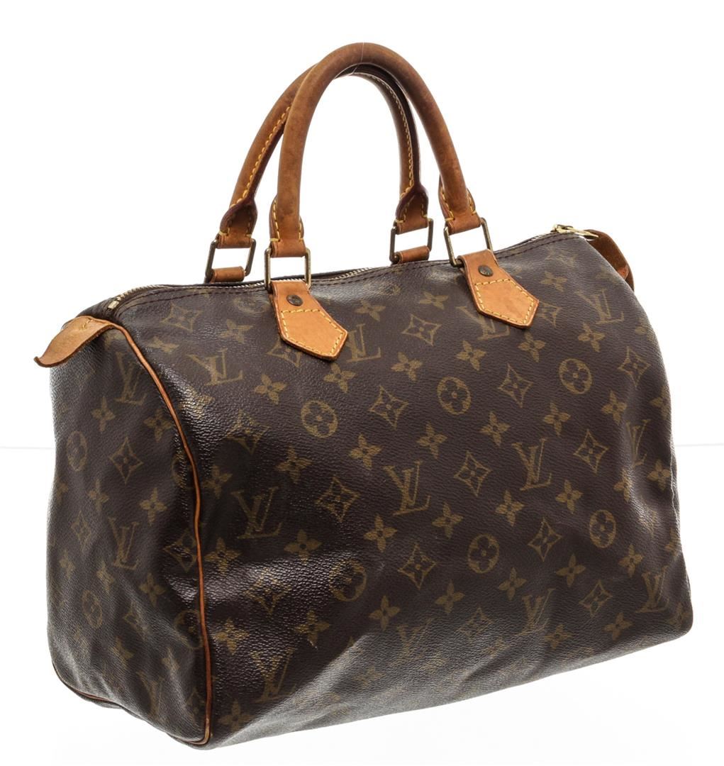 Brown and tan monogram coated canvas Louis Vuitton Speedy 30 with brass hardware, tan vachetta leather trim, dual rolled top handles, brown canvas lining, single slit pocket at interior wall and zip closure at top.