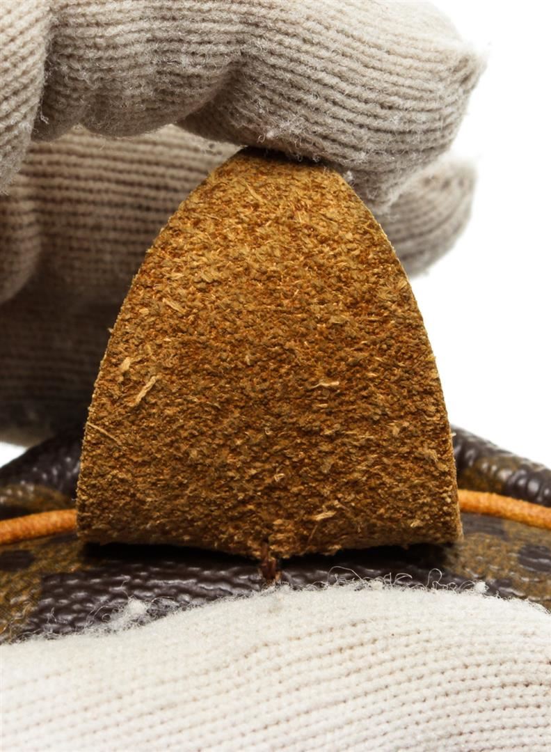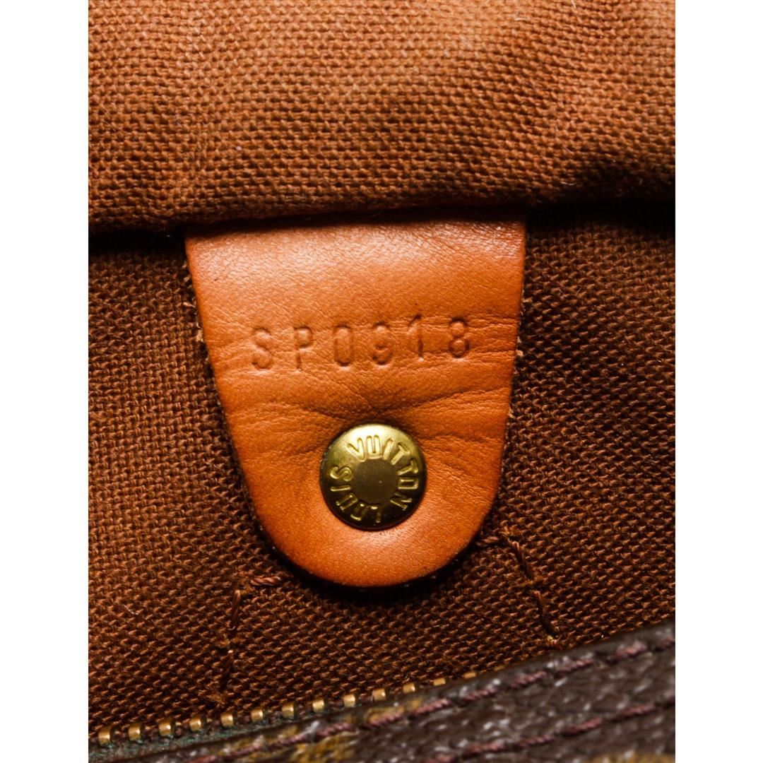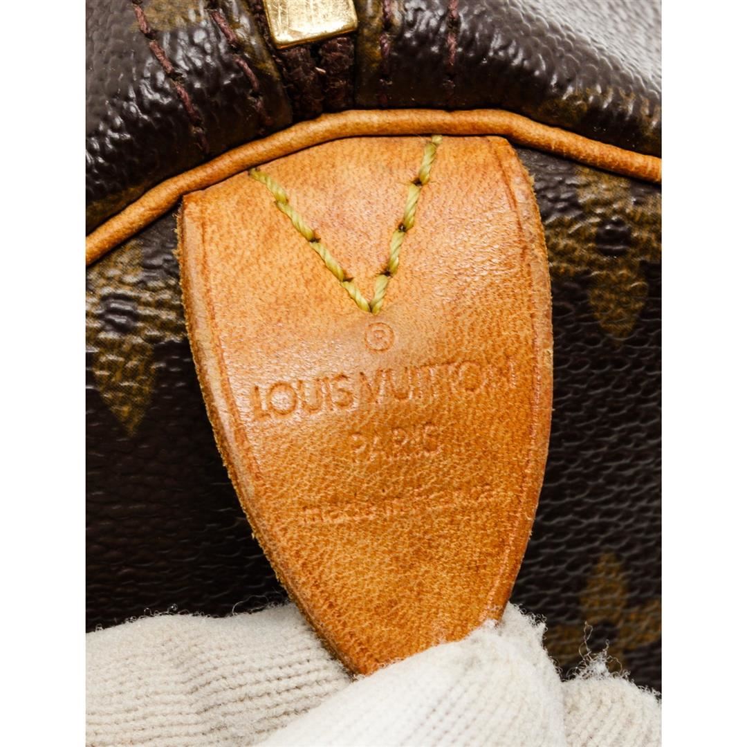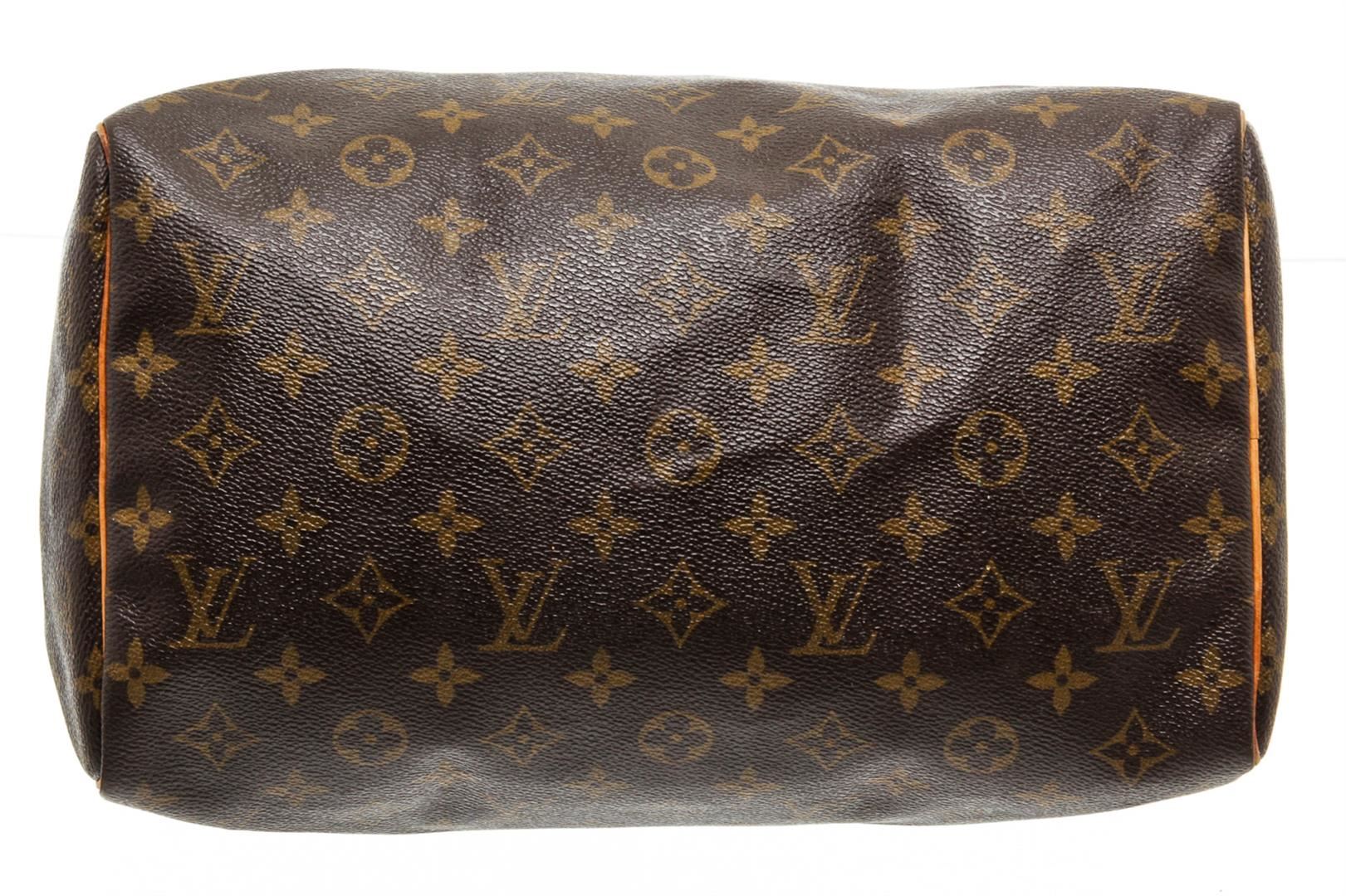 Brown and tan monogram coated canvas Louis Vuitton Speedy 30 with brass hardware, tan vachetta leather trim, dual rolled top handles, brown canvas lining, single slit pocket at interior wall and zip closure at top.
