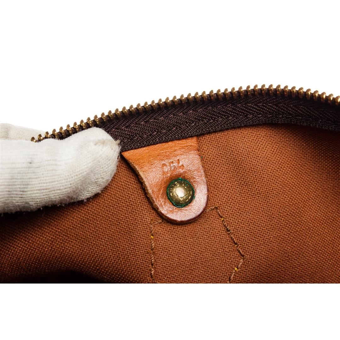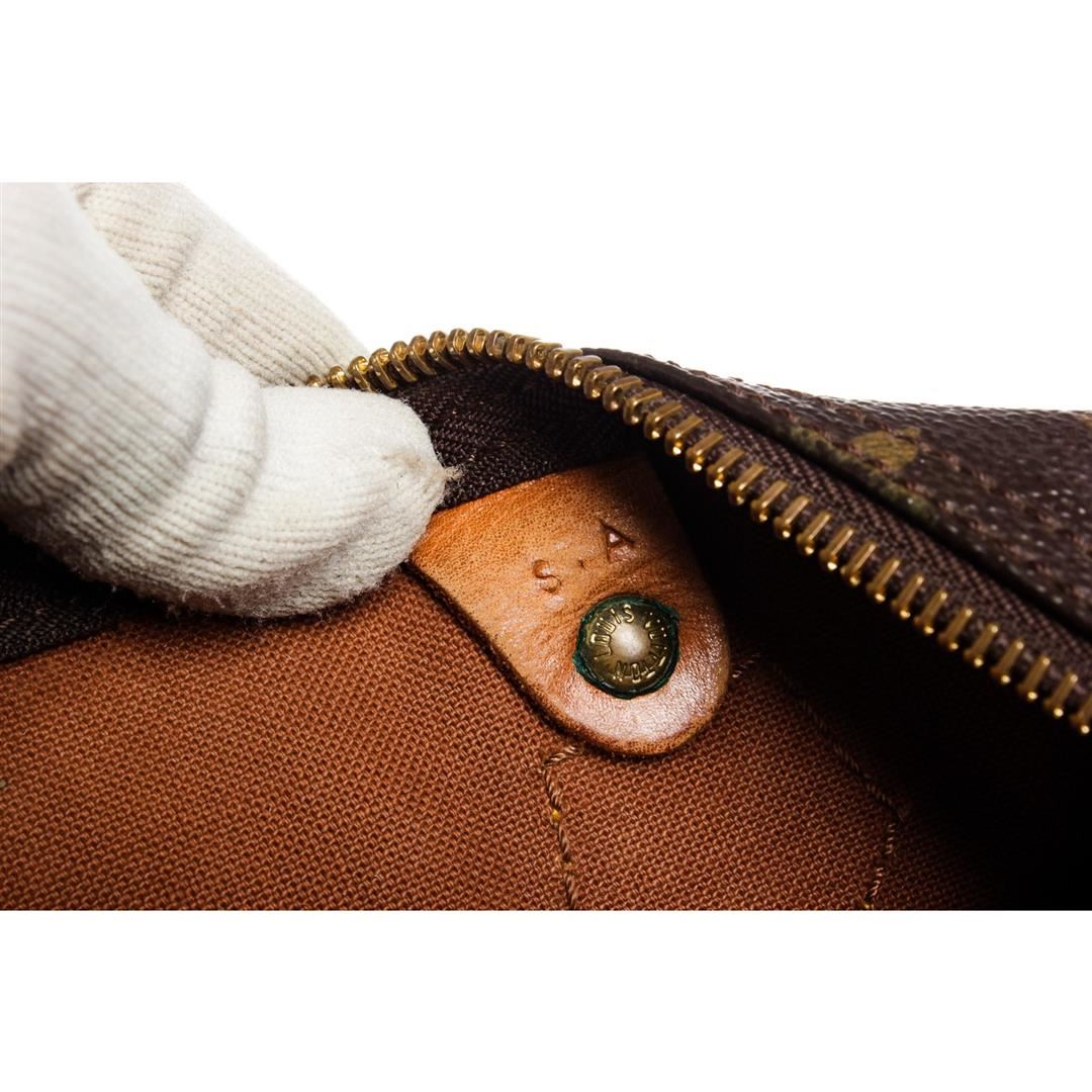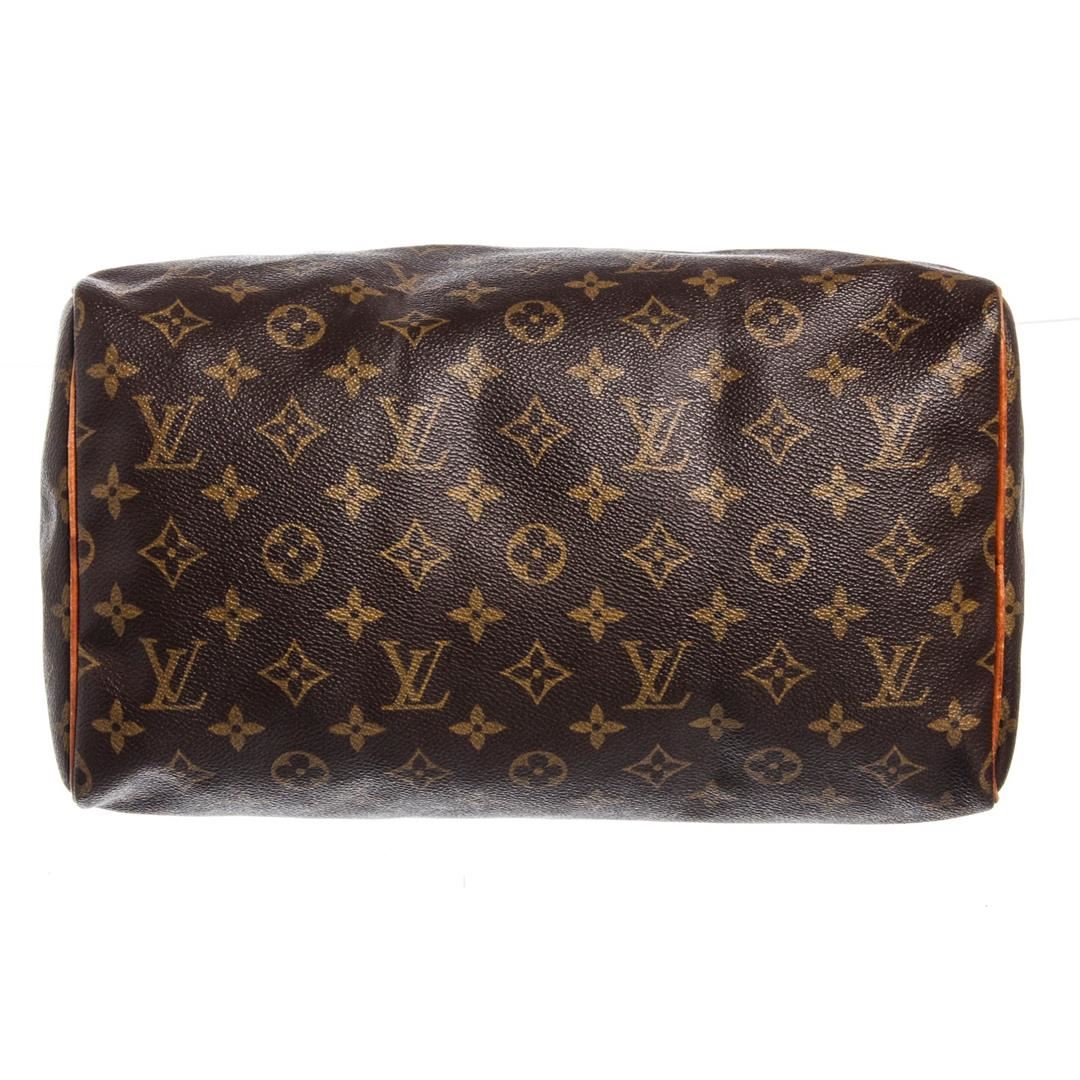 Brown and tan monogram coated canvas Louis Vuitton Speedy 30 with brass hardware, tan vachetta leather trim, dual rolled top handles, brown canvas lining, single slit pocket at interior wall and zip closure at top.