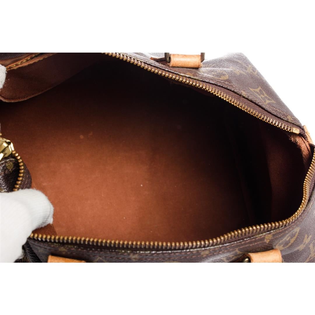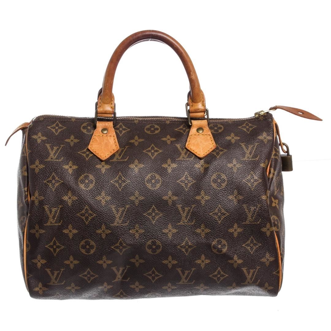 Brown and tan monogram coated canvas Louis Vuitton Speedy 30 with brass hardware, tan vachetta leather trim, dual rolled top handles, brown canvas lining, single slit pocket at interior wall and zip closure at top.
