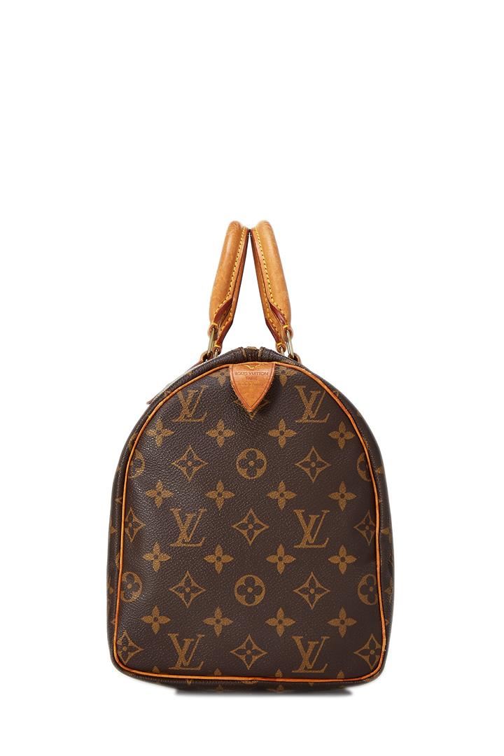 One Louis Vuitton Monogram Canvas Leather Speedy 30 cm Bag. Brown and tan monogram coated canvas Louis Vuitton Speedy with brass hardware, tan vachetta leather trim, dual rolled top handles, brown canvas lining, single slit pocket at interior wall and zip closure at top.