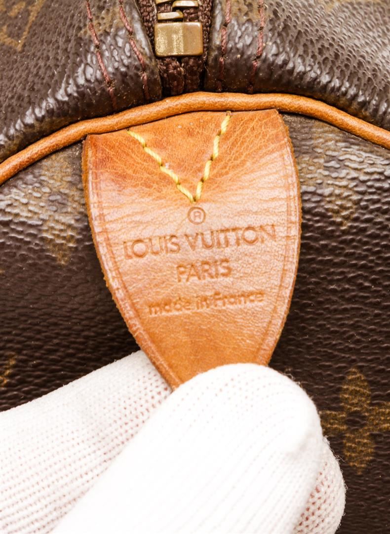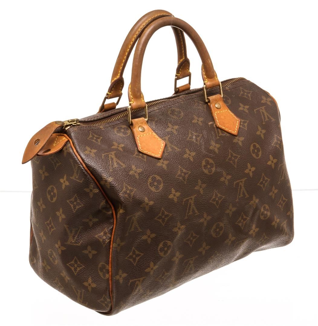 One Louis Vuitton Monogram Canvas Leather Speedy 30 cm Bag. Brown and tan monogram coated canvas Louis Vuitton Speedy with brass hardware, tan vachetta leather trim, dual rolled top handles, brown canvas lining, single slit pocket at interior wall and zip closure at top.