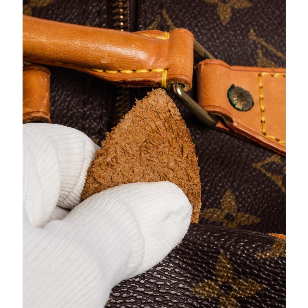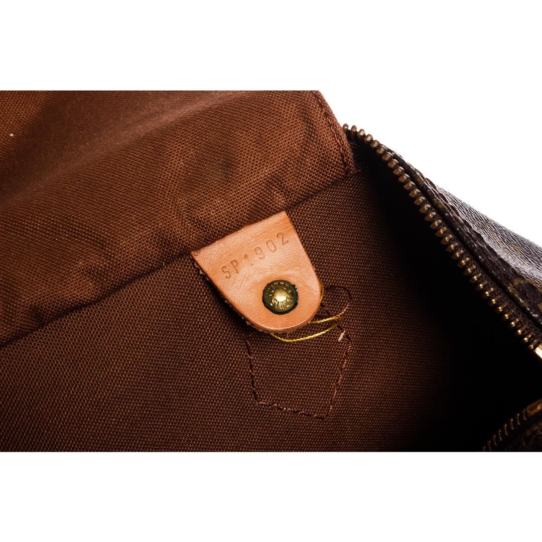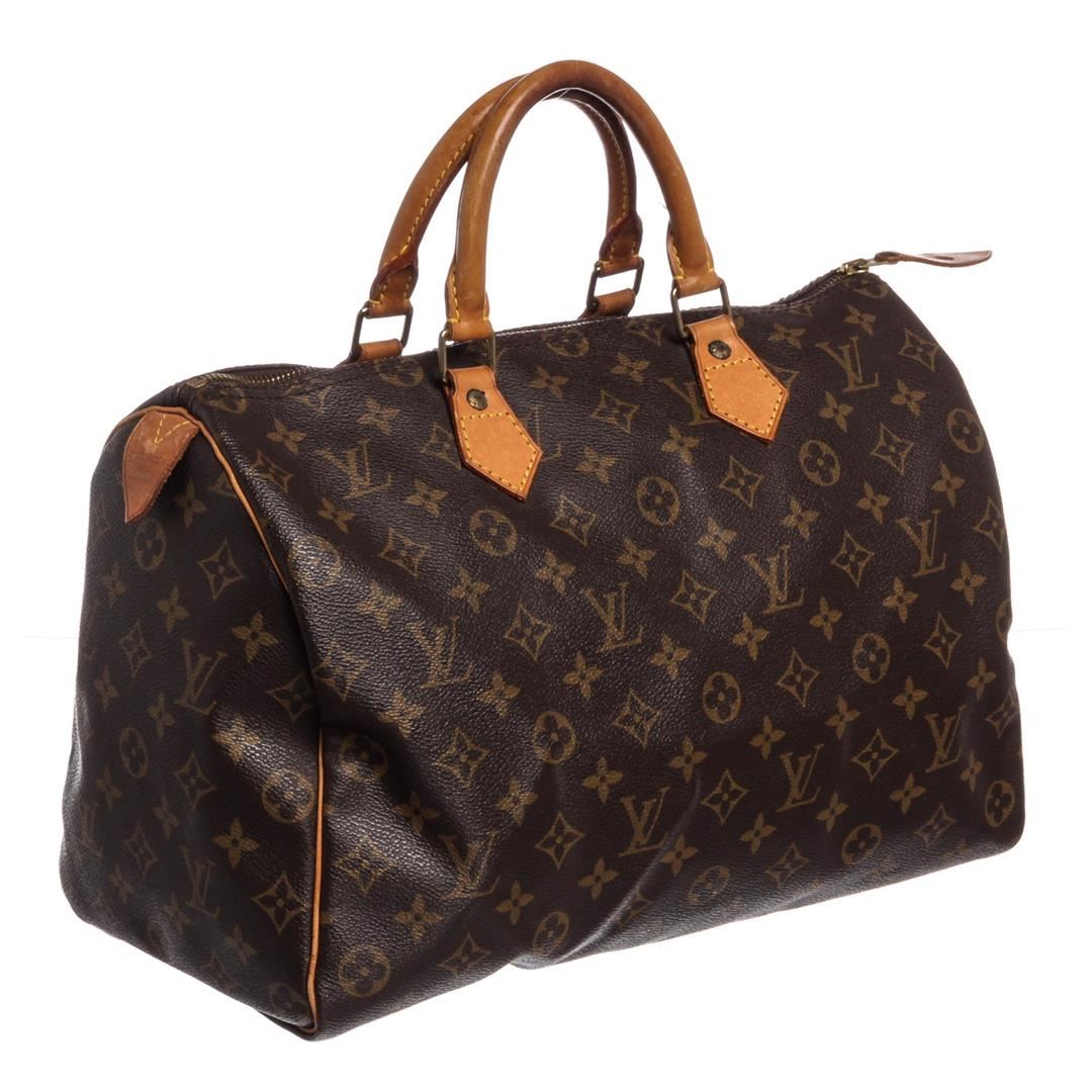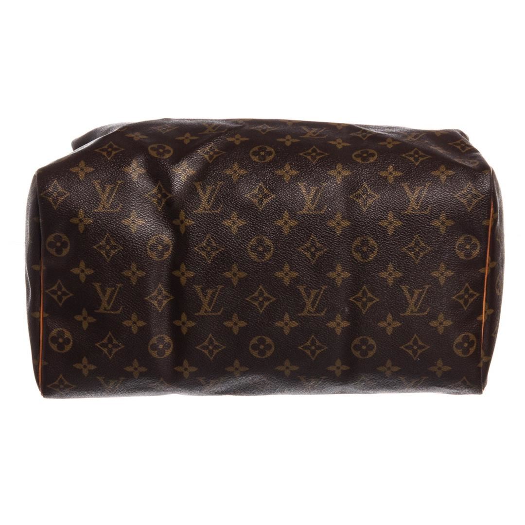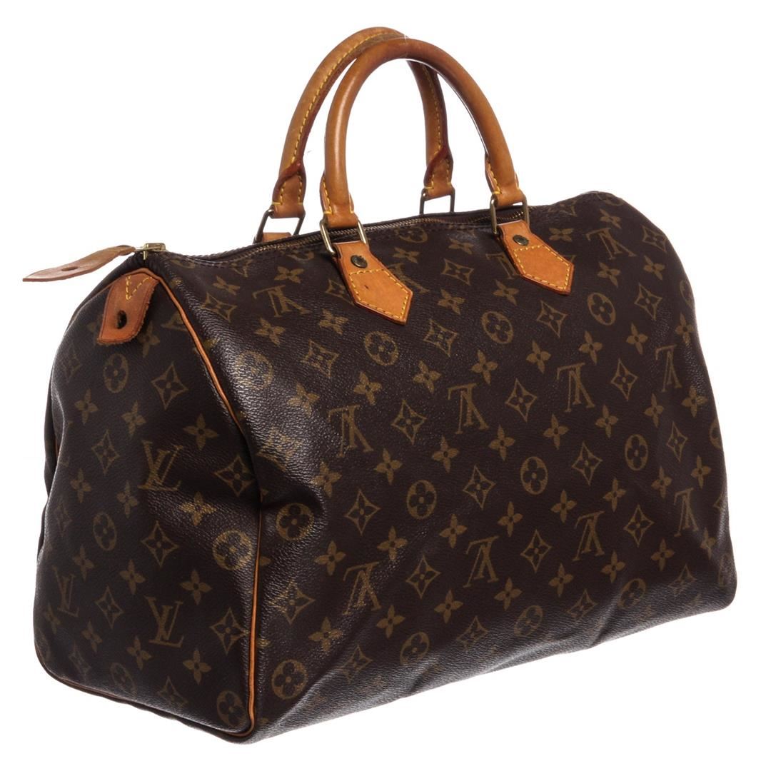 Brown and tan monogram coated canvas Louis Vuitton Speedy 35 with brass hardware, tan vachetta leather trim, dual rolled handles, brown canvas lining, single slit pocket at interior wall and zip closure at top.