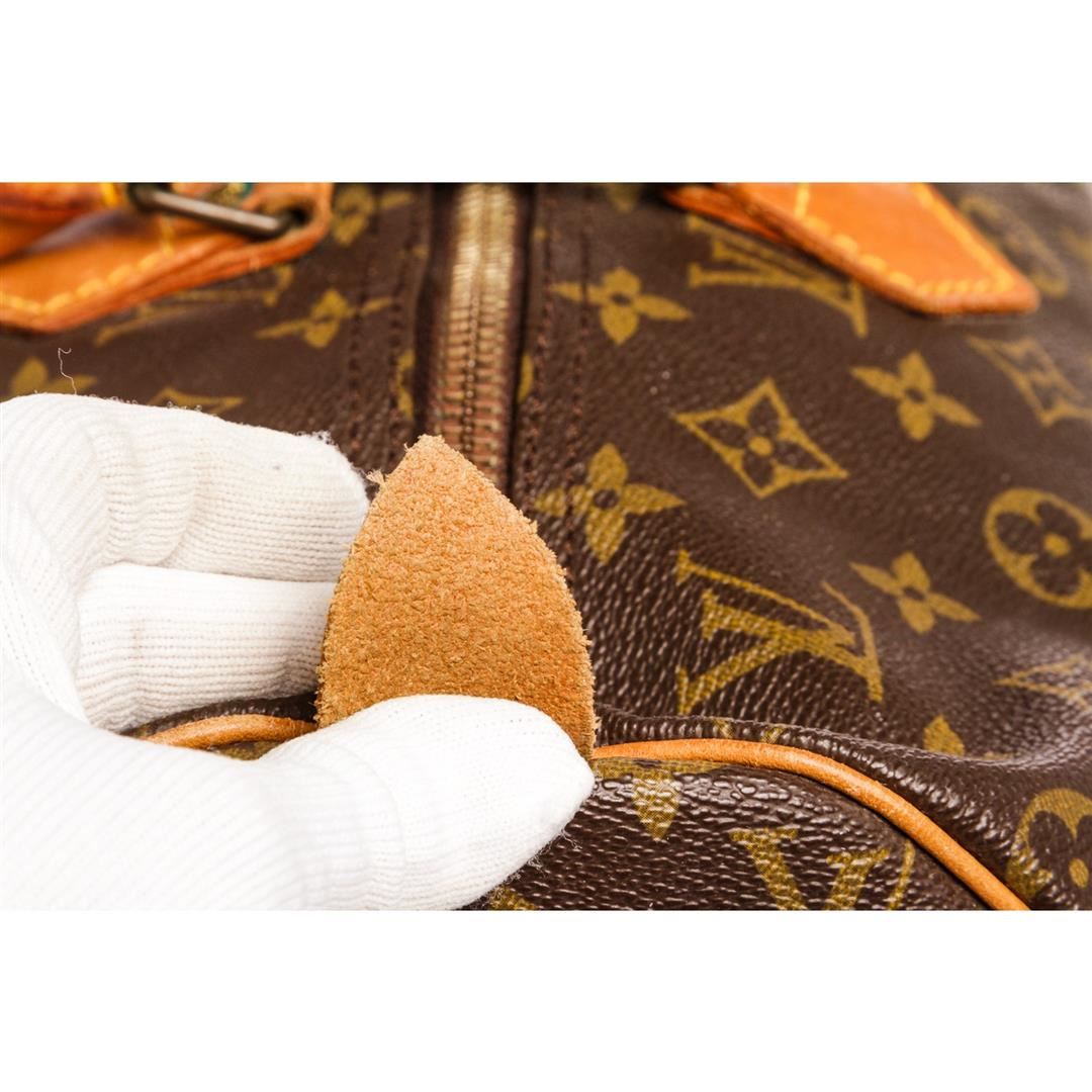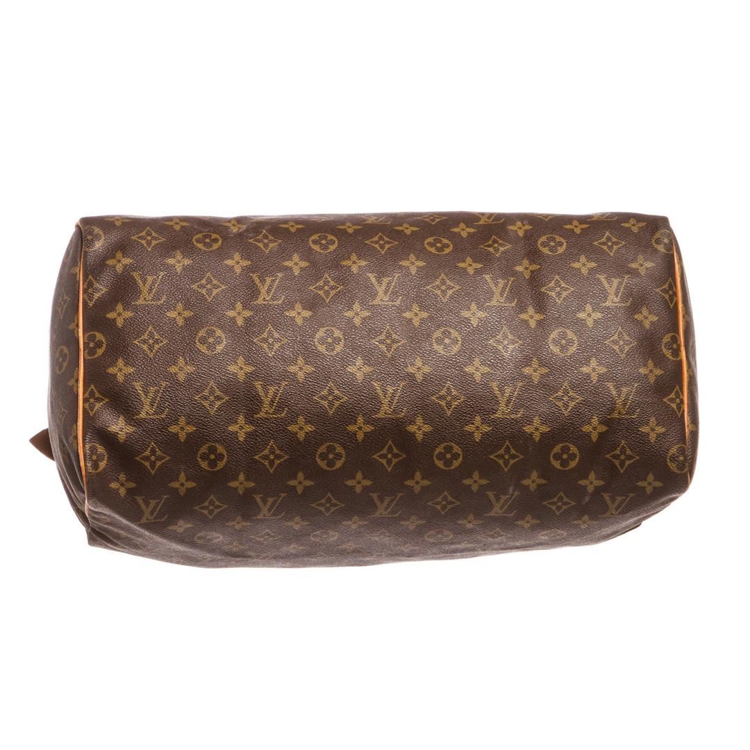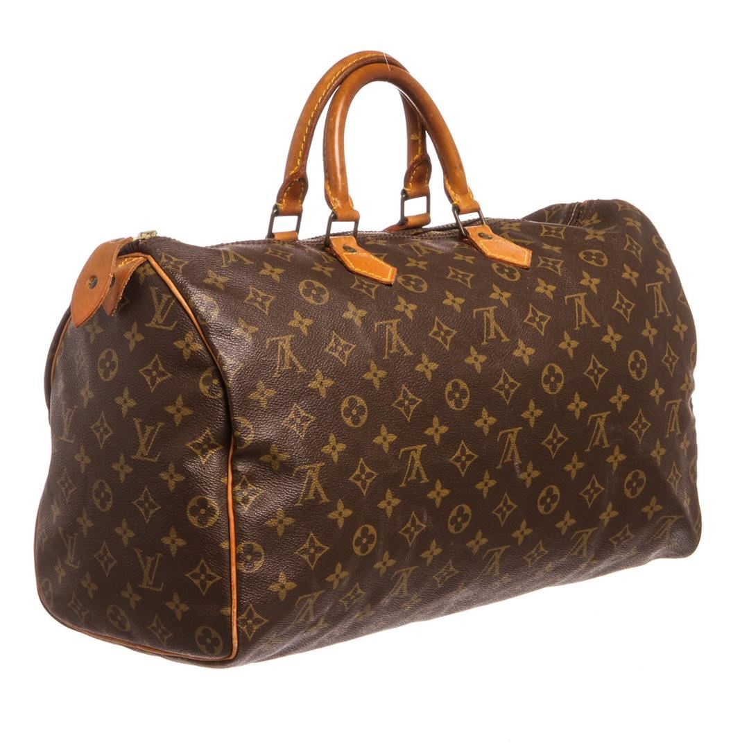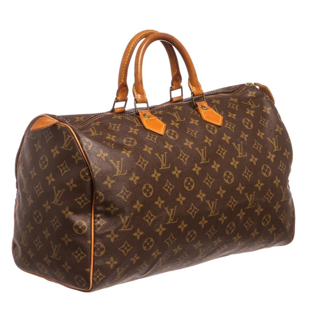 Brown and tan monogram coated canvas Louis Vuitton Speedy 40 with brass hardware, tan vachetta leather accents, dual rolled top handles, brown canvas lining, single pocket at interior wall and zip closure at top. Item is pre-owned.