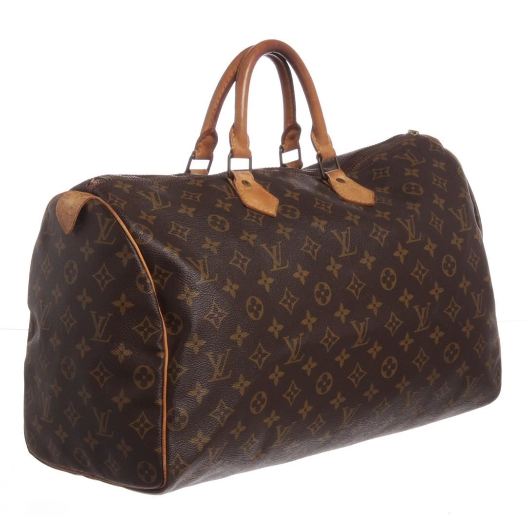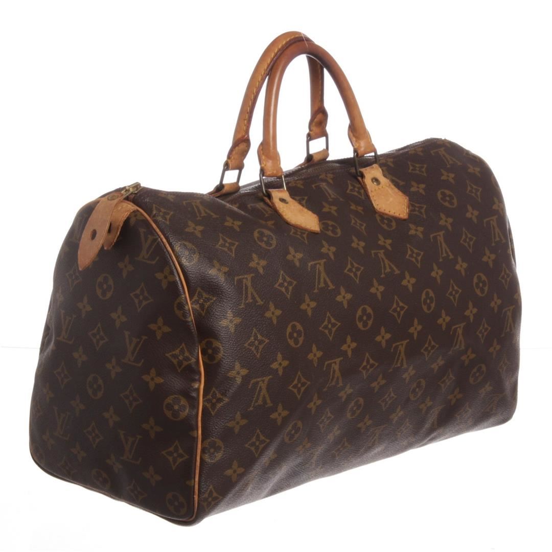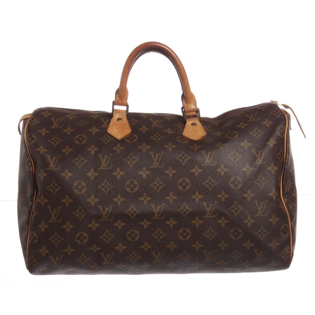 Brown and tan monogram coated canvas Louis Vuitton Speedy 40 with brass hardware, tan vachetta leather accents, dual rolled top handles, brown canvas lining, single pocket at interior wall and zip closure at top. Dimensions = 15.5"x7.5"x9.5"xHandle Drop:3.25"/ 39.3cmx19cmx24.1cmxHandle Drop:8.2cm. Item is pre-owned.